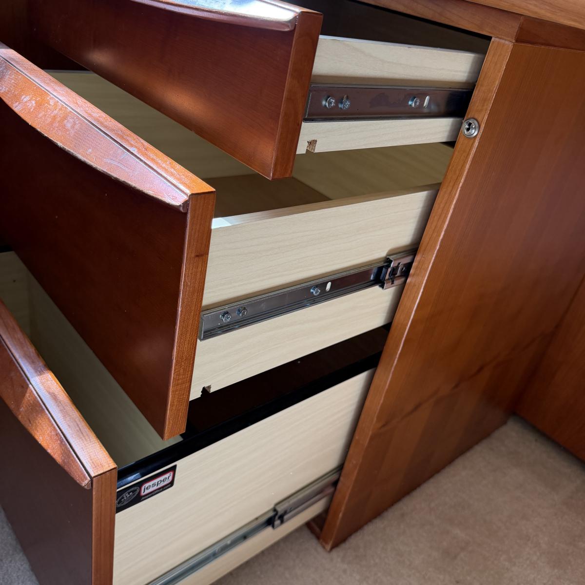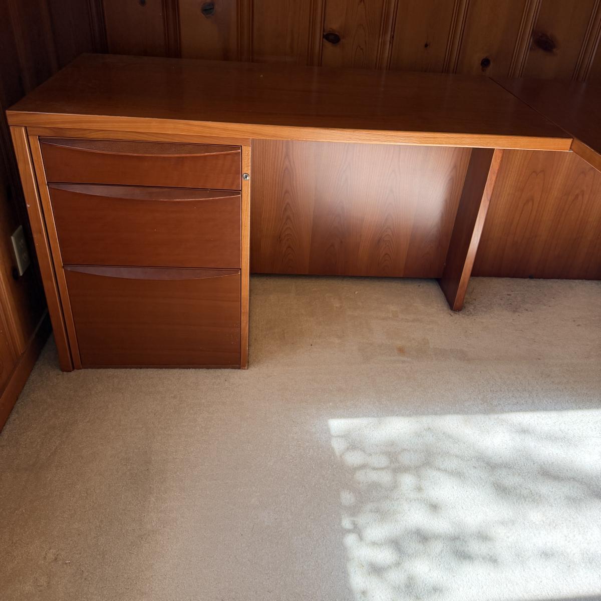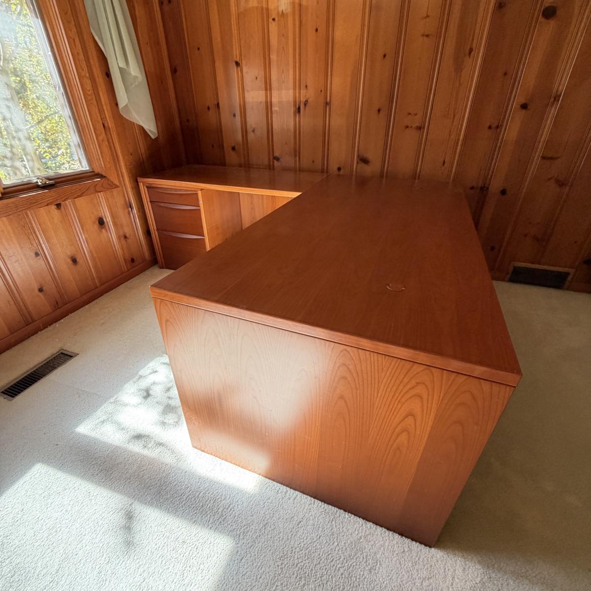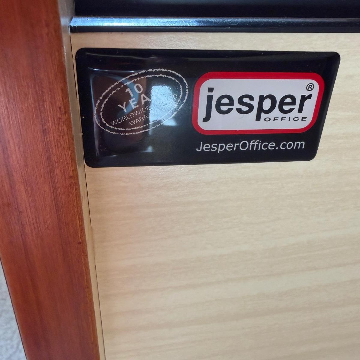 This Jesper corner desk has three locking drawers and is two separate pieces that are screwed together. Desk appears to be pressed wood. Larger piece measures 71” x 34” x 28”H and smaller piece measures 48” x 24” x 28”H. Winner will need to take desk apart.