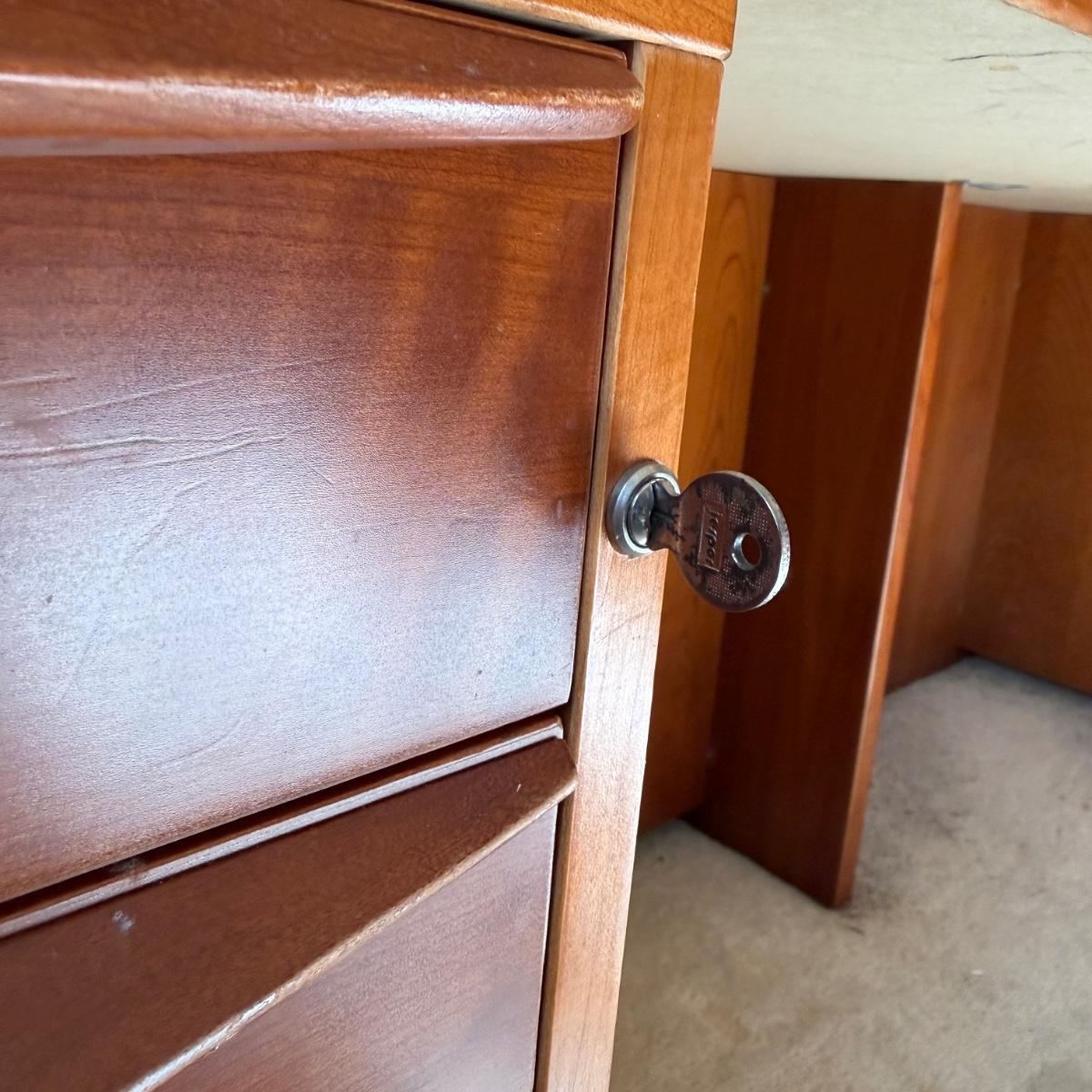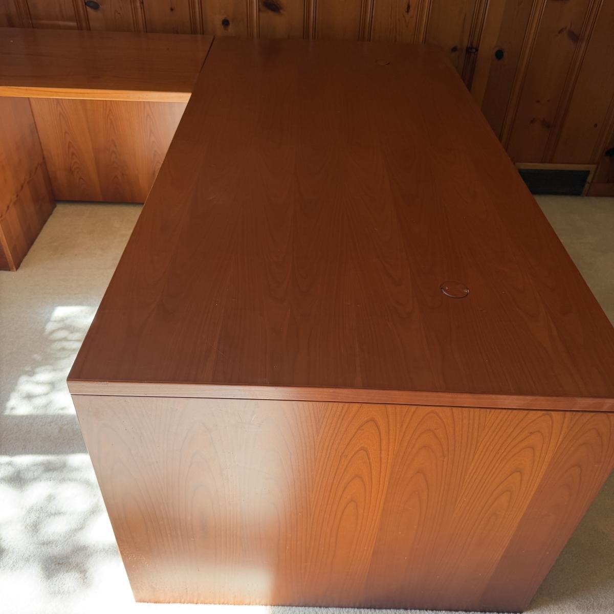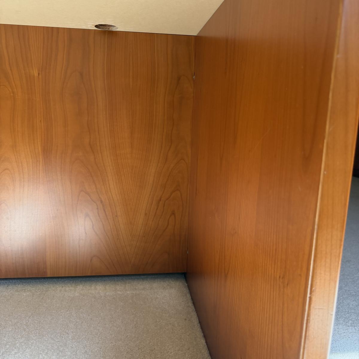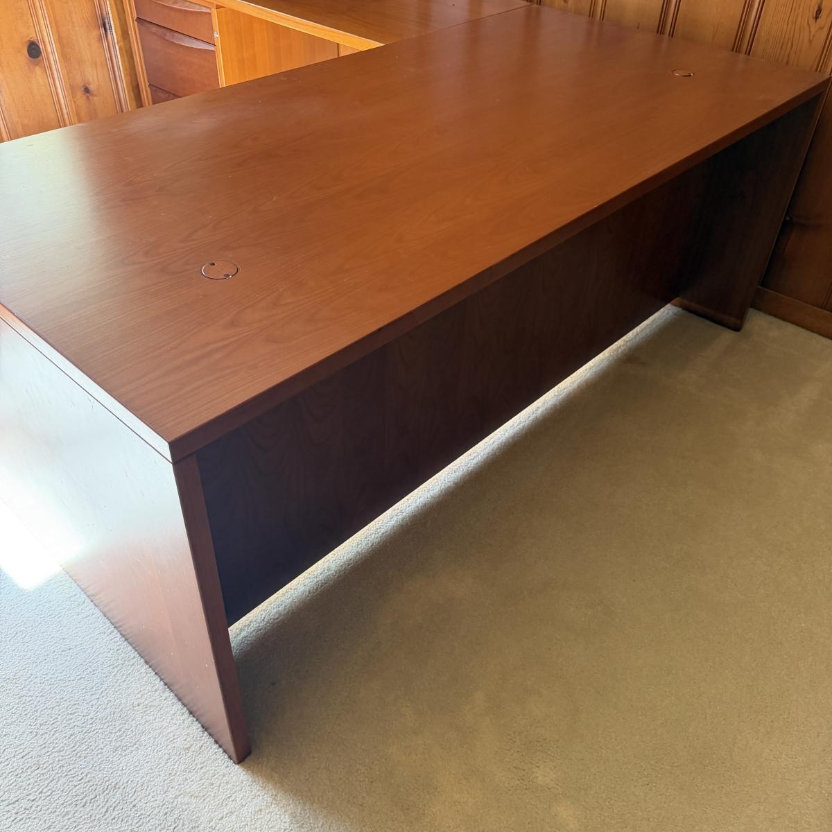 This Jesper corner desk has three locking drawers and is two separate pieces that are screwed together. Desk appears to be pressed wood. Larger piece measures 71” x 34” x 28”H and smaller piece measures 48” x 24” x 28”H. Winner will need to take desk apart.