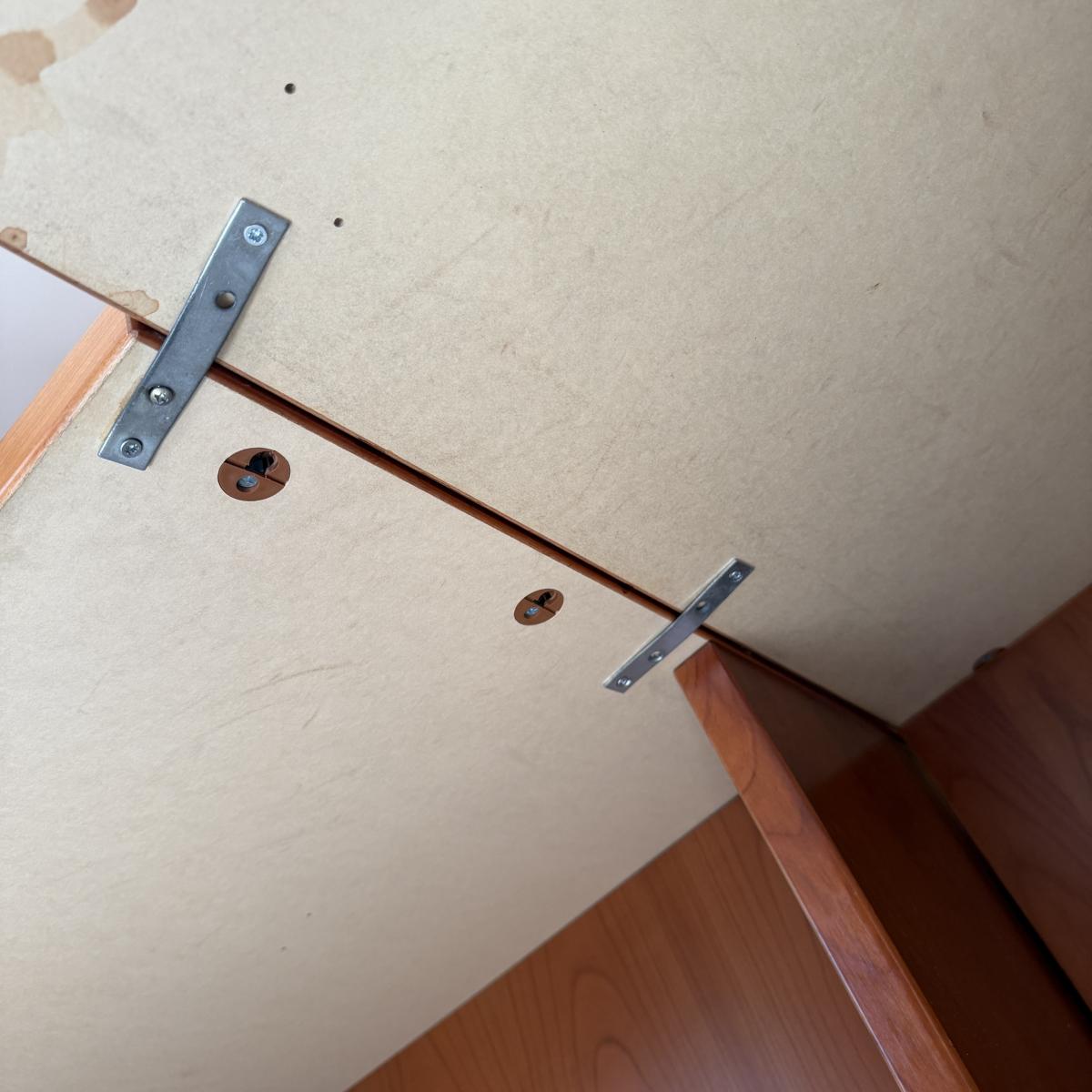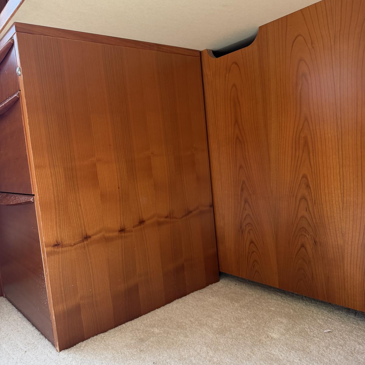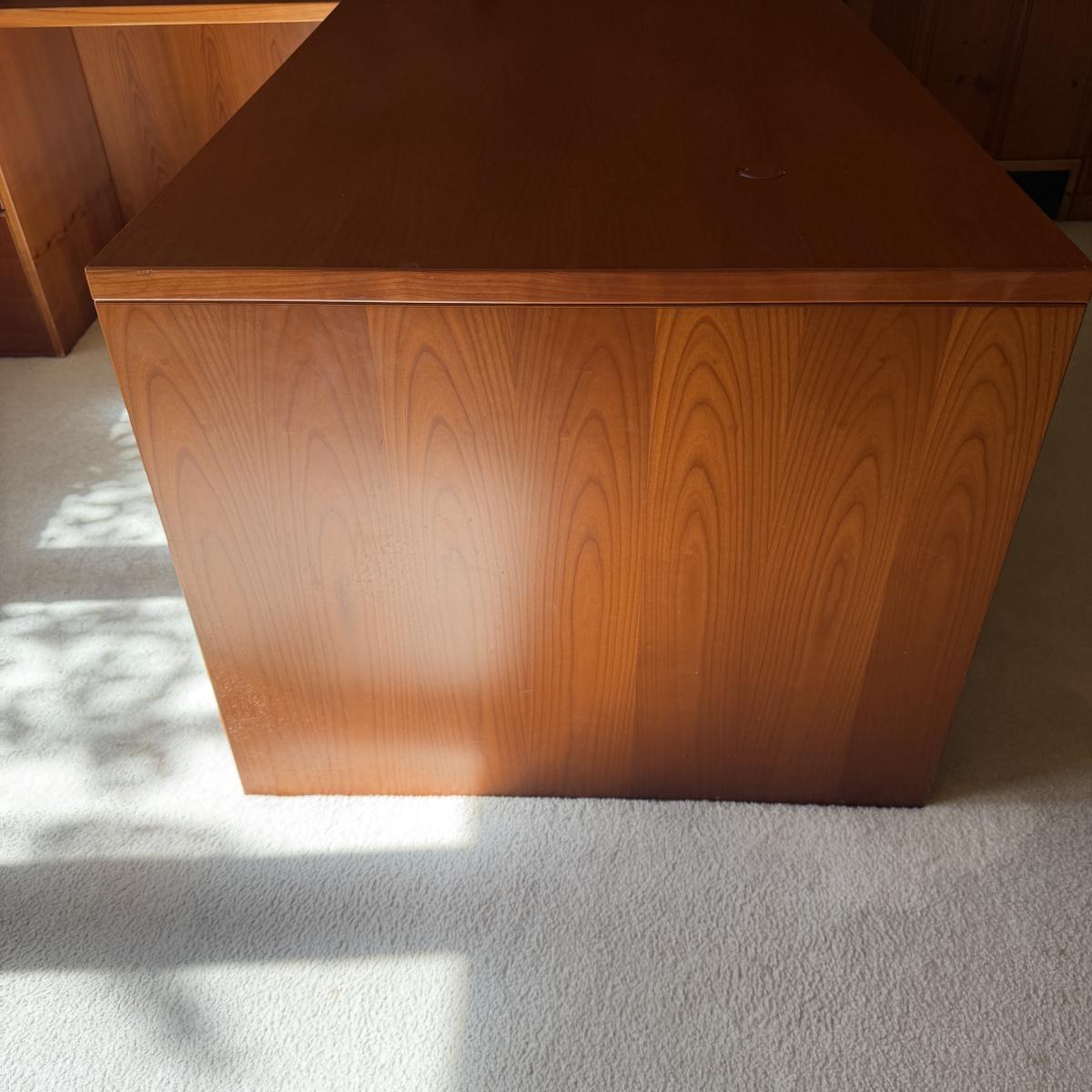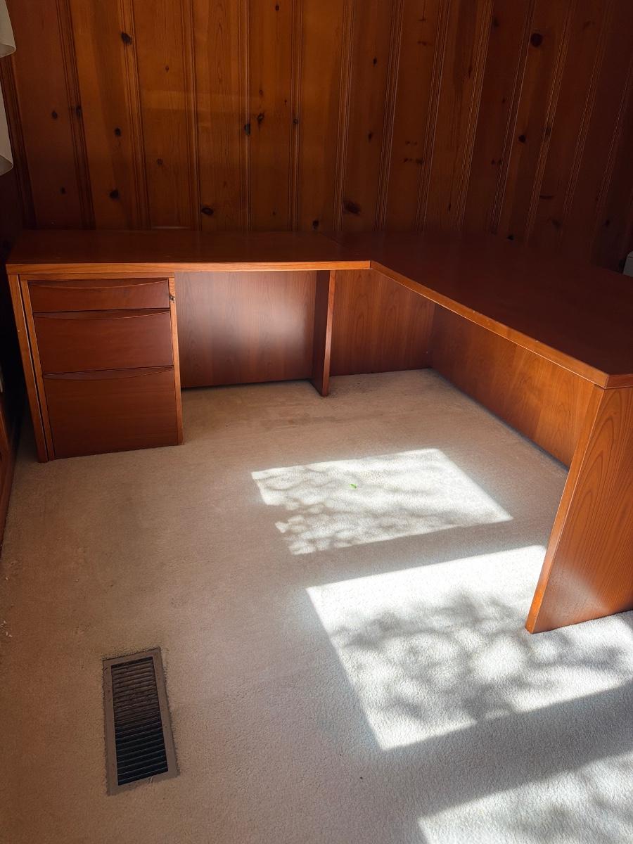This Jesper corner desk has three locking drawers and is two separate pieces that are screwed together. Desk appears to be pressed wood. Larger piece measures 71” x 34” x 28”H and smaller piece measures 48” x 24” x 28”H. Winner will need to take desk apart.