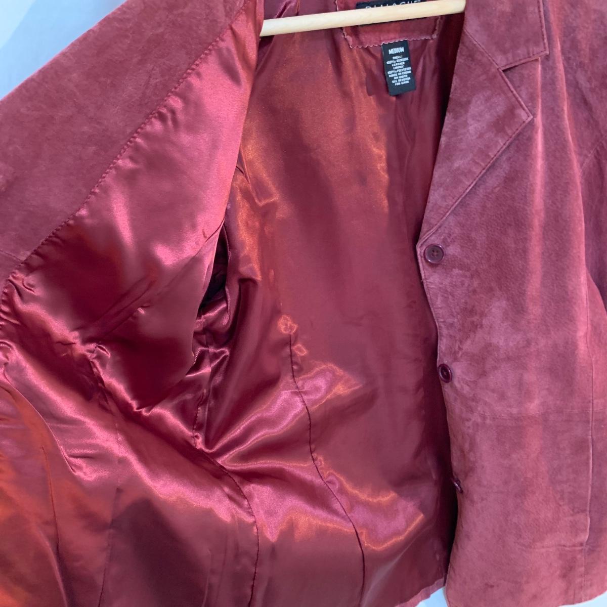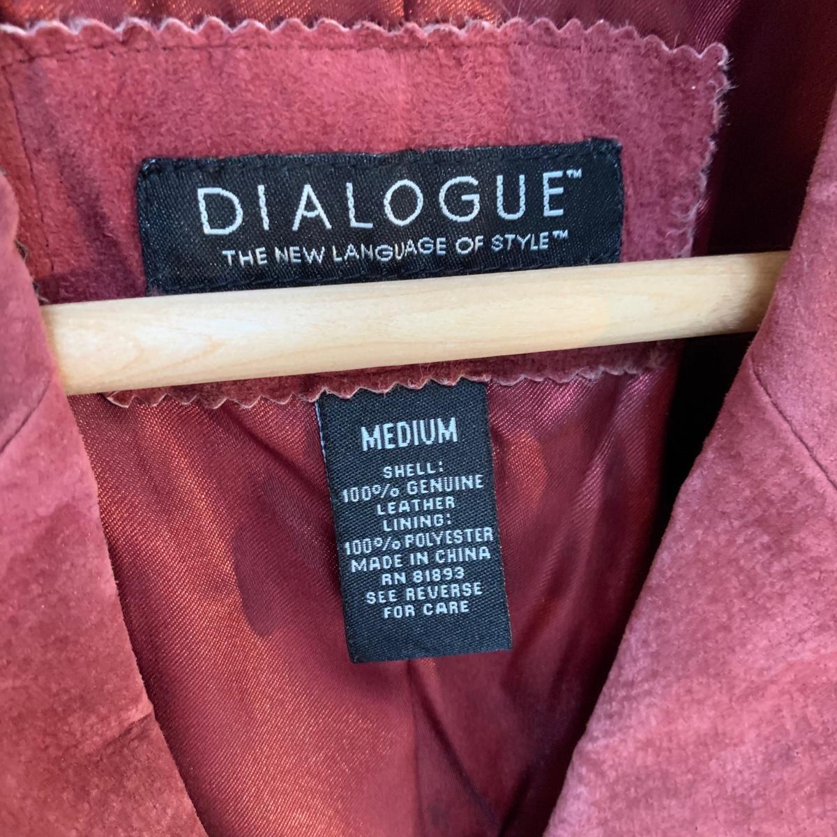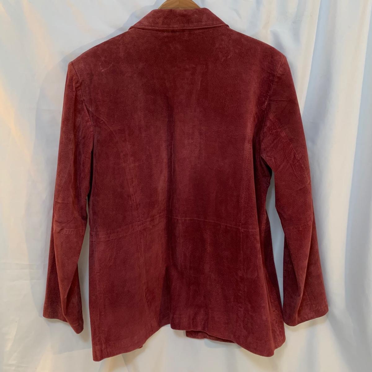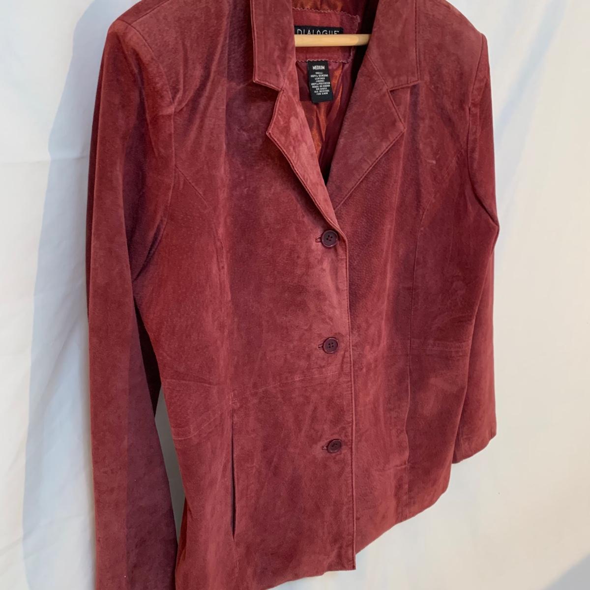 Two 100% genuine leather jackets, both size M. Both the black Jessica Holbrook jacket and the maroon Dialogue jacket have front pockets, button-down front closures, and polyester linings. From the shoulder, the black jacket is 31” long and the maroon is 27.5”. Both are in good condition. The black jacket has some small specks that seem easily cleanable. Wood hangers not included.