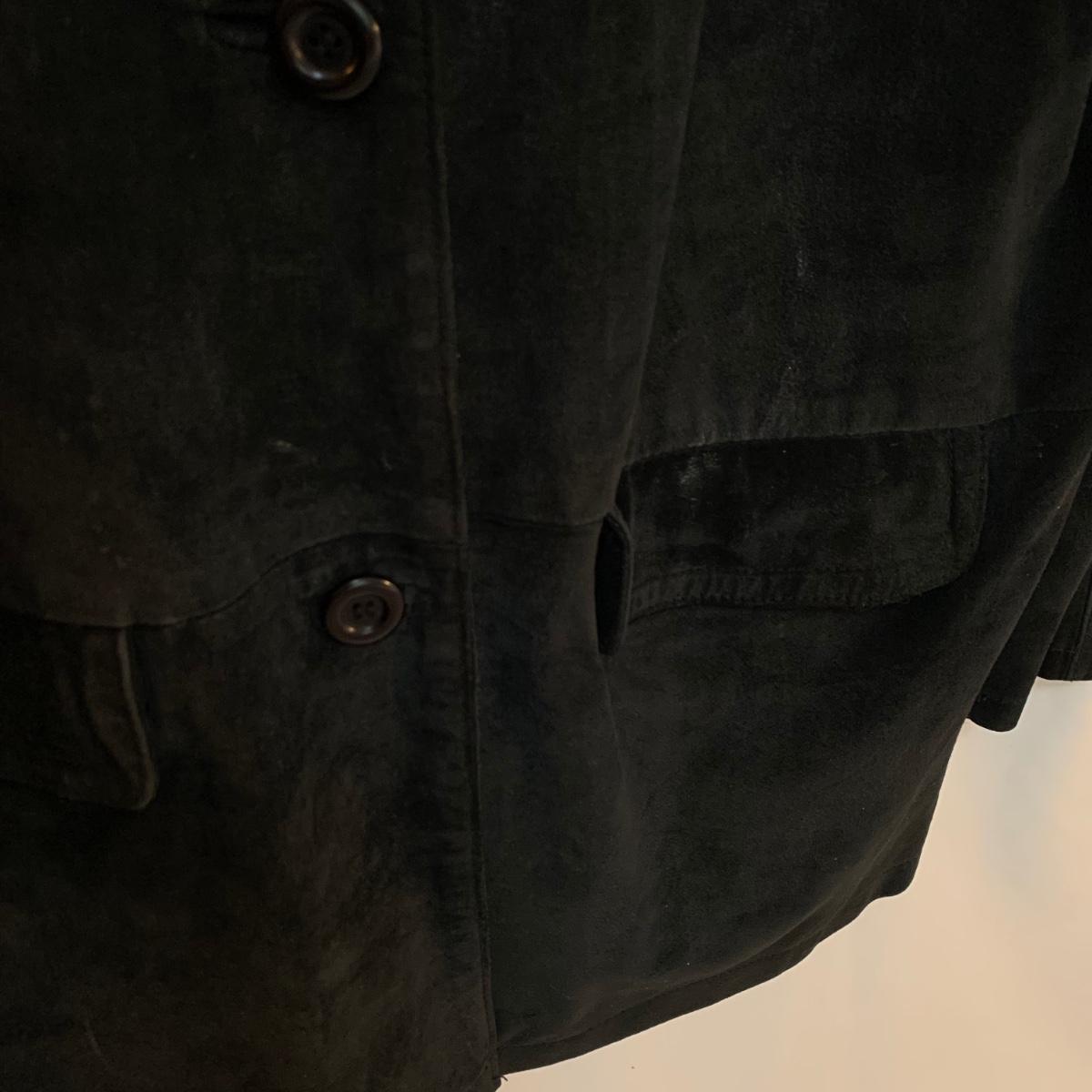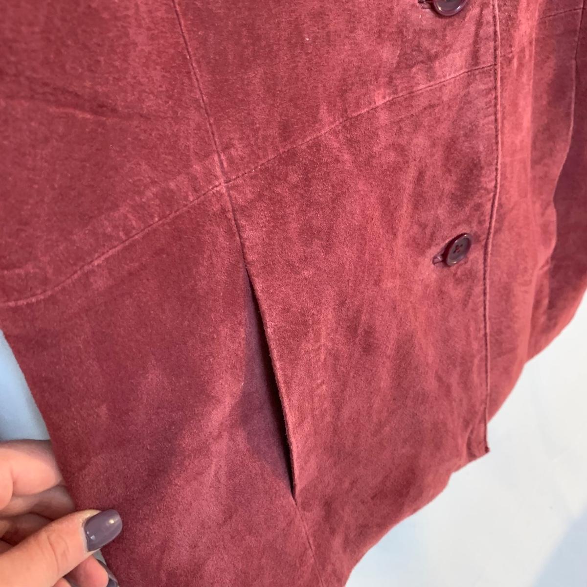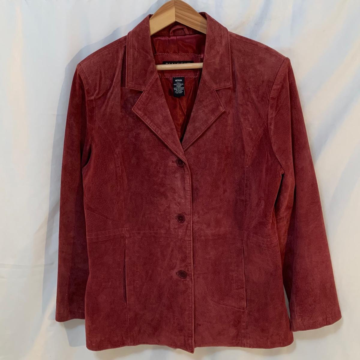 Two 100% genuine leather jackets, both size M. Both the black Jessica Holbrook jacket and the maroon Dialogue jacket have front pockets, button-down front closures, and polyester linings. From the shoulder, the black jacket is 31” long and the maroon is 27.5”. Both are in good condition. The black jacket has some small specks that seem easily cleanable. Wood hangers not included.
