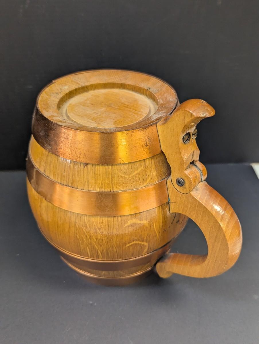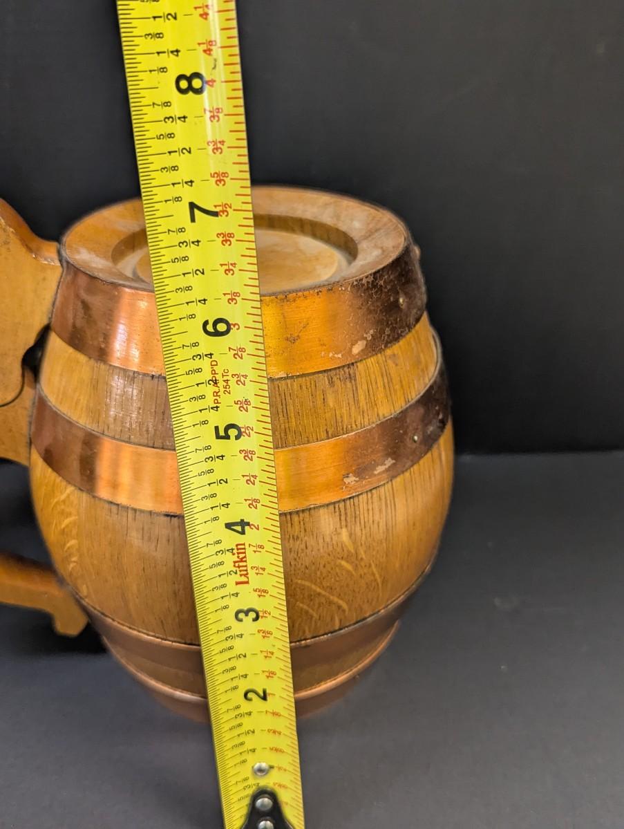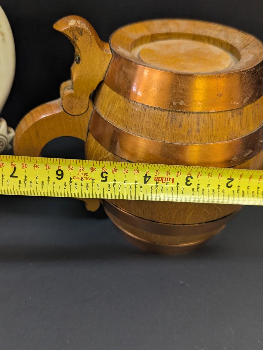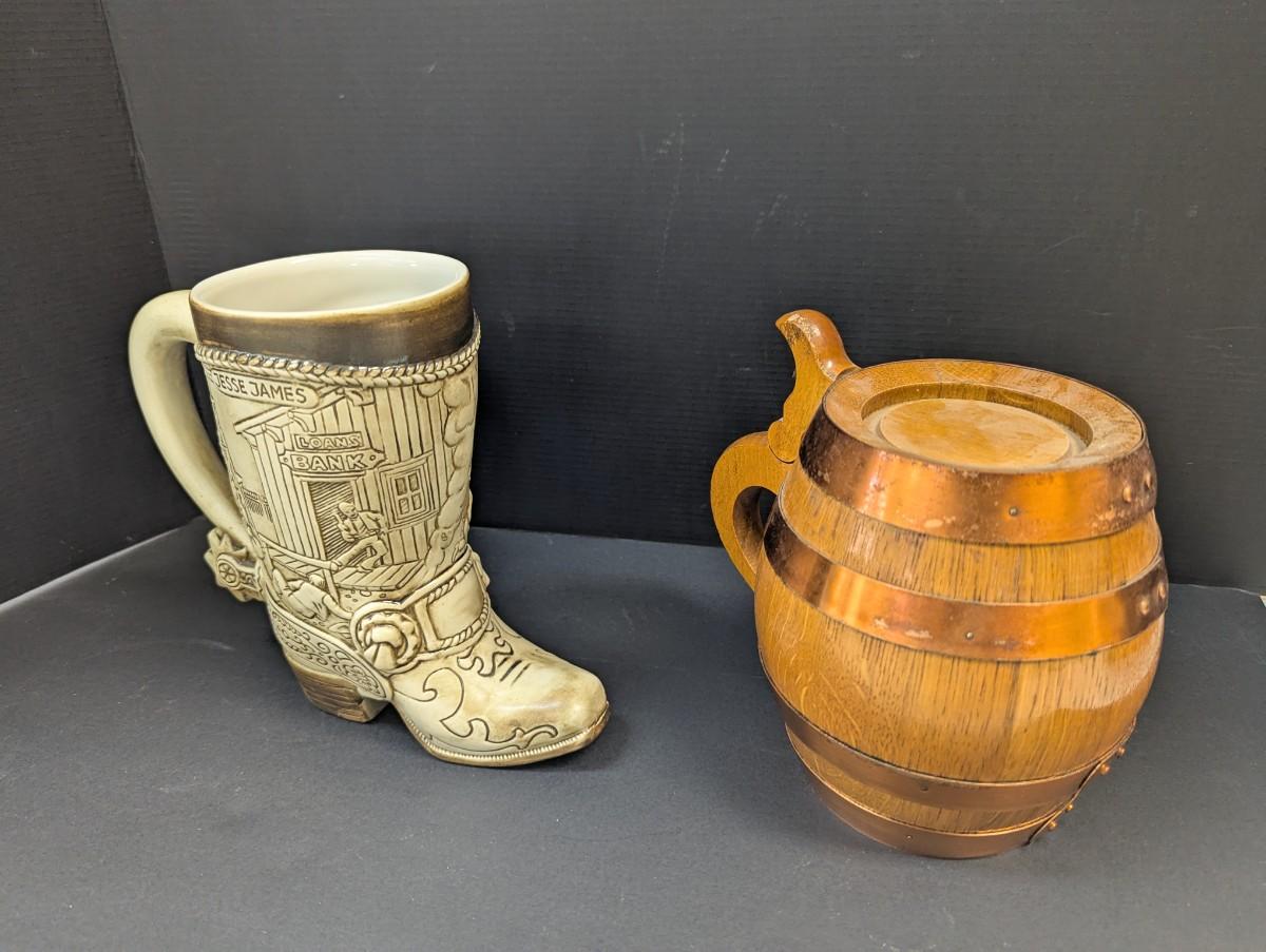 Jessie James Beer Stein & Vintage Handmade Wood Copper Banded Lidded Beer Barrel Style Stein