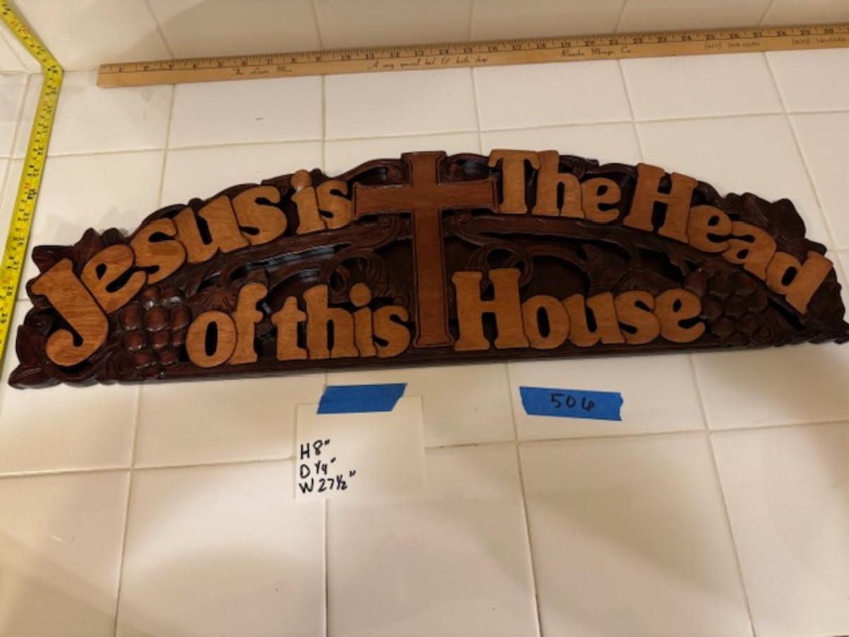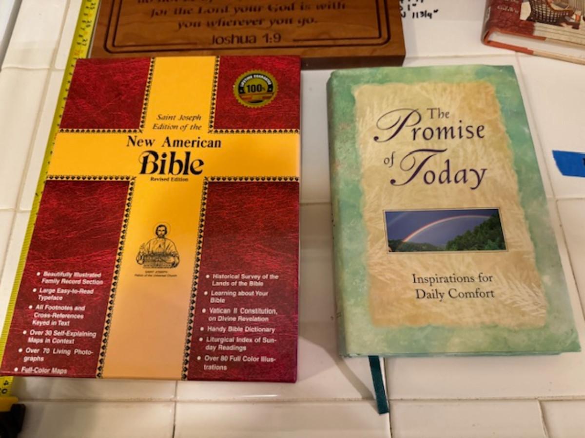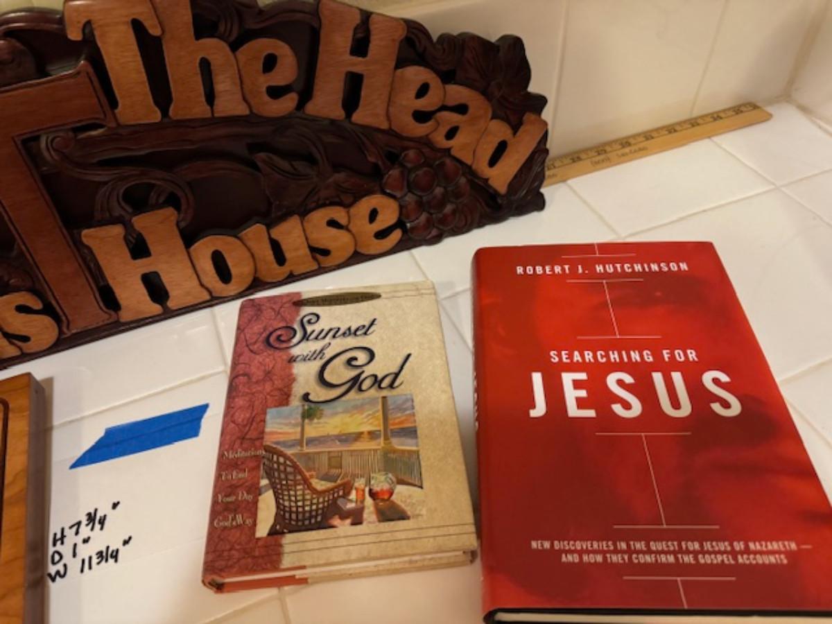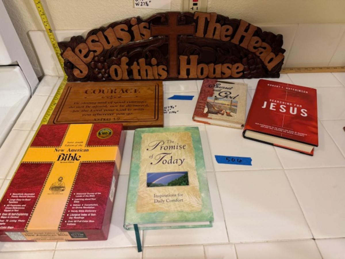 Jesus is head of this house- wood carving 8" x 1/4" x 27.5", wood carved bible verse 7 3/4" x 1" x 11 3.4", St Joseph edition of the New American bible, The Promise of today, searching for Jesus by Robert Hutchinson, Sunset of God - 4 books.