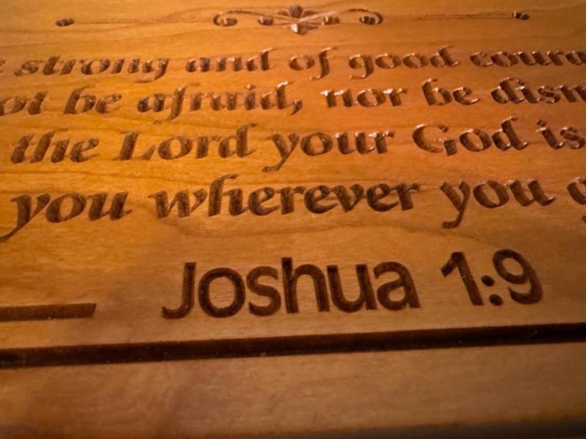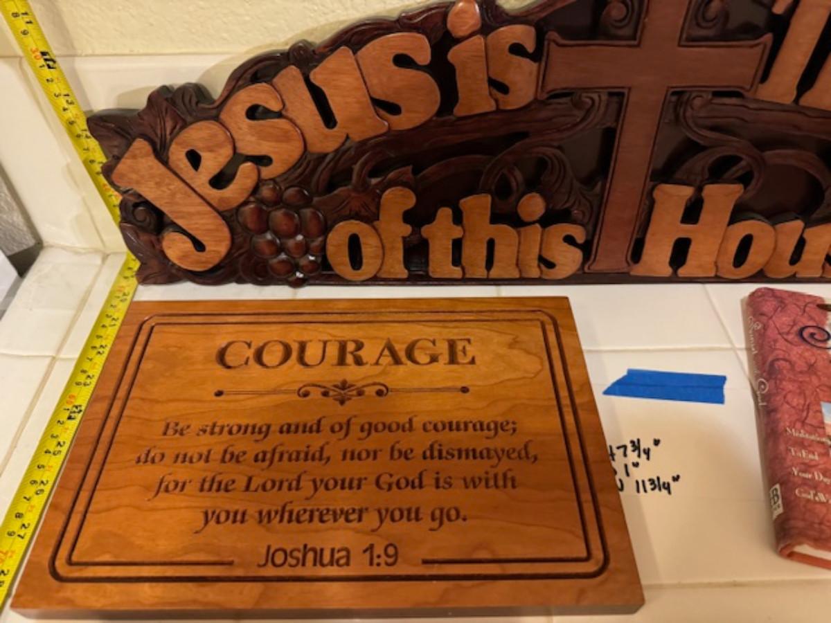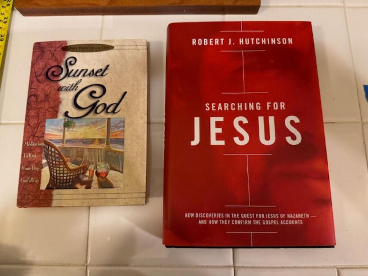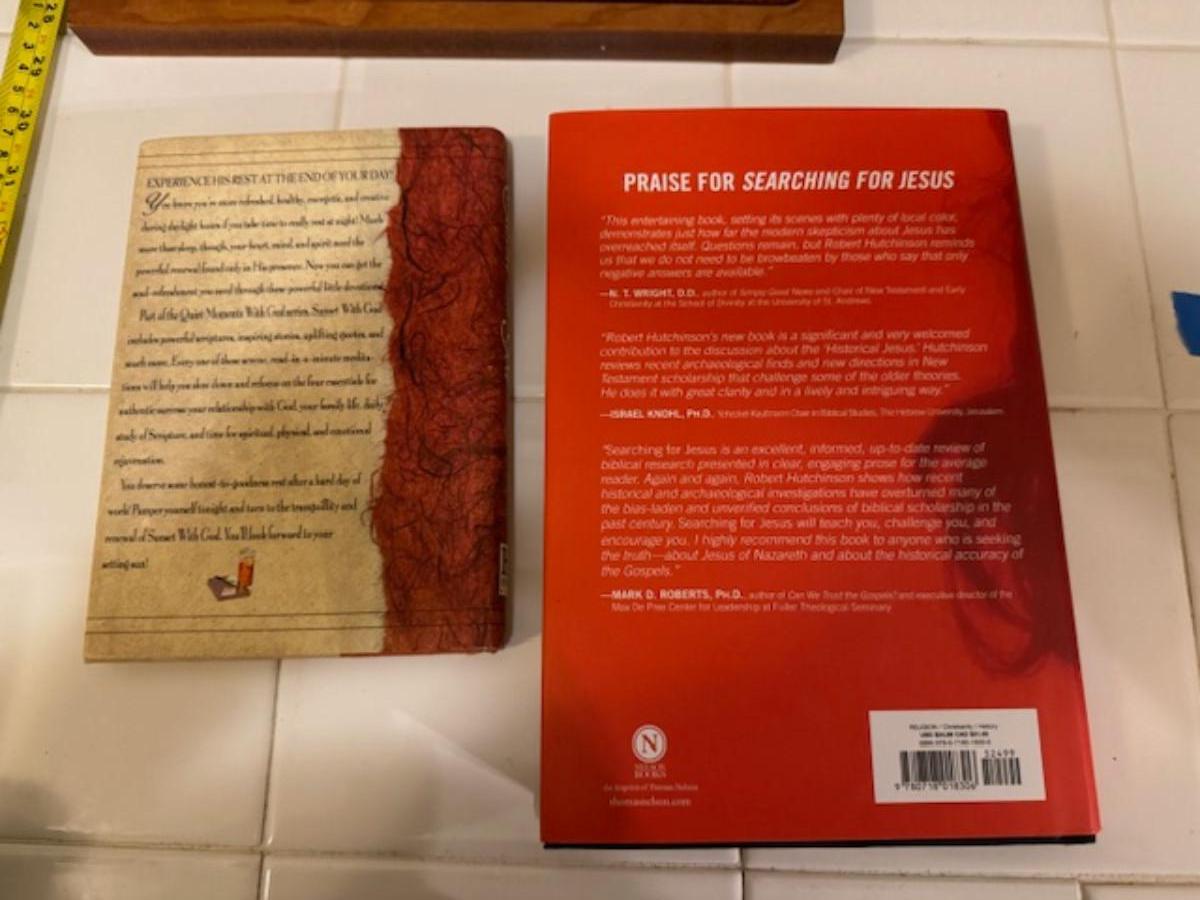 Jesus is head of this house- wood carving 8" x 1/4" x 27.5", wood carved bible verse 7 3/4" x 1" x 11 3.4", St Joseph edition of the New American bible, The Promise of today, searching for Jesus by Robert Hutchinson, Sunset of God - 4 books.