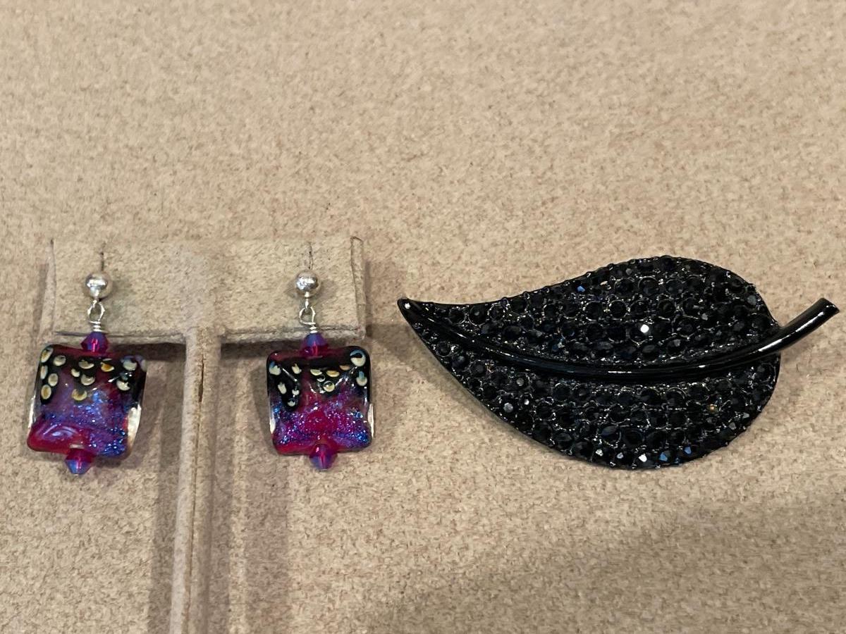 Jet black rhinestone leaf brooch and fun purple glass earrings