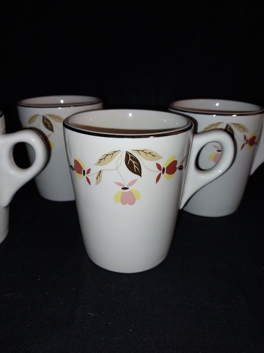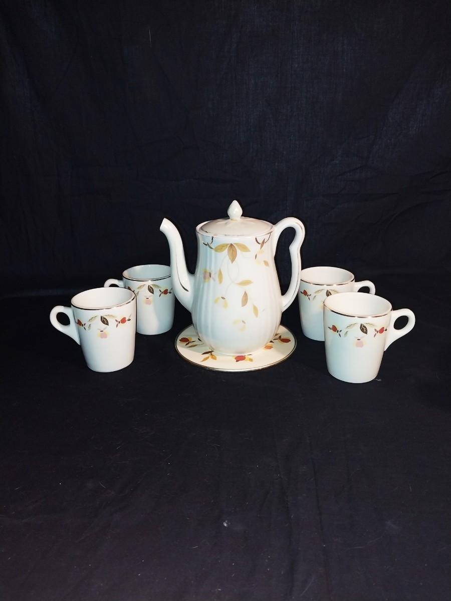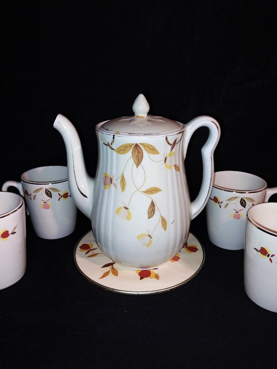 ANTIQUE HALL CHINA COFFEE/TEA HOLDER AND FOUR MUGS BY "JEWEL"