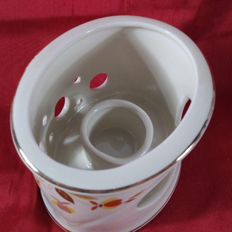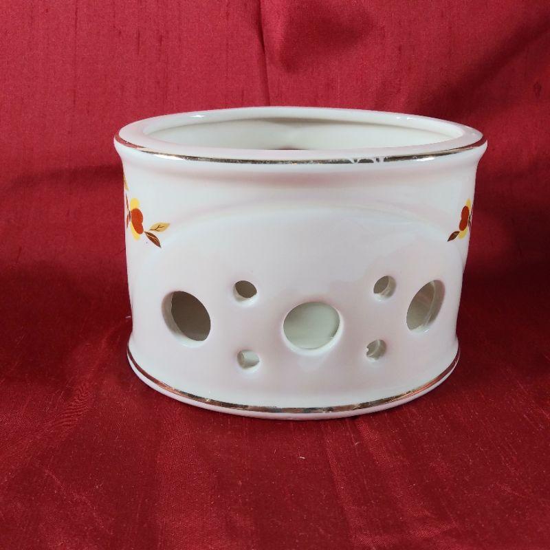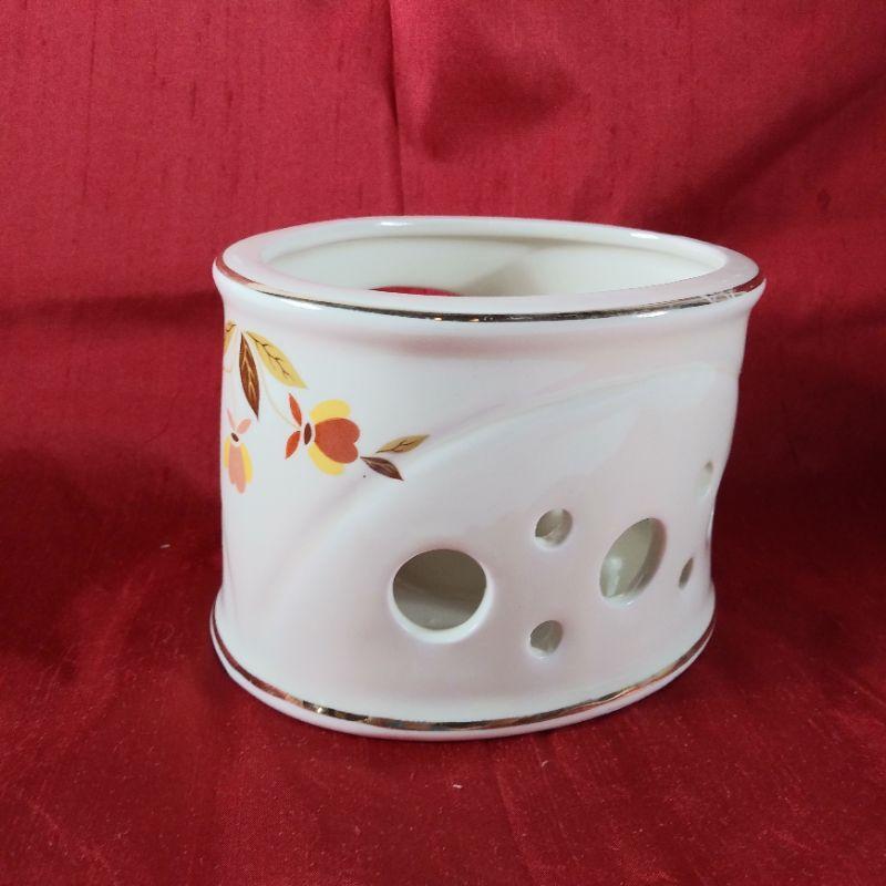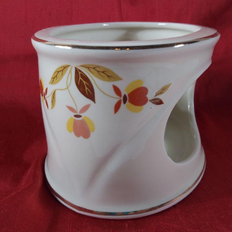 Hall China's Jewel Tea Pot Warmer Stand. Very hard to find. Lightly used, has some light wear to gold rims. Fits the "Aladdin-Style Tea Pot" offered elsewhere in this auction. It is oval in shape and measures 5 1/4-inches wide X 4 1/4-inches deep X 3 1/2-inches tall. Very good condition - no chips or cracks.