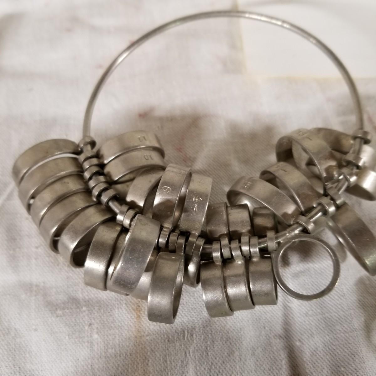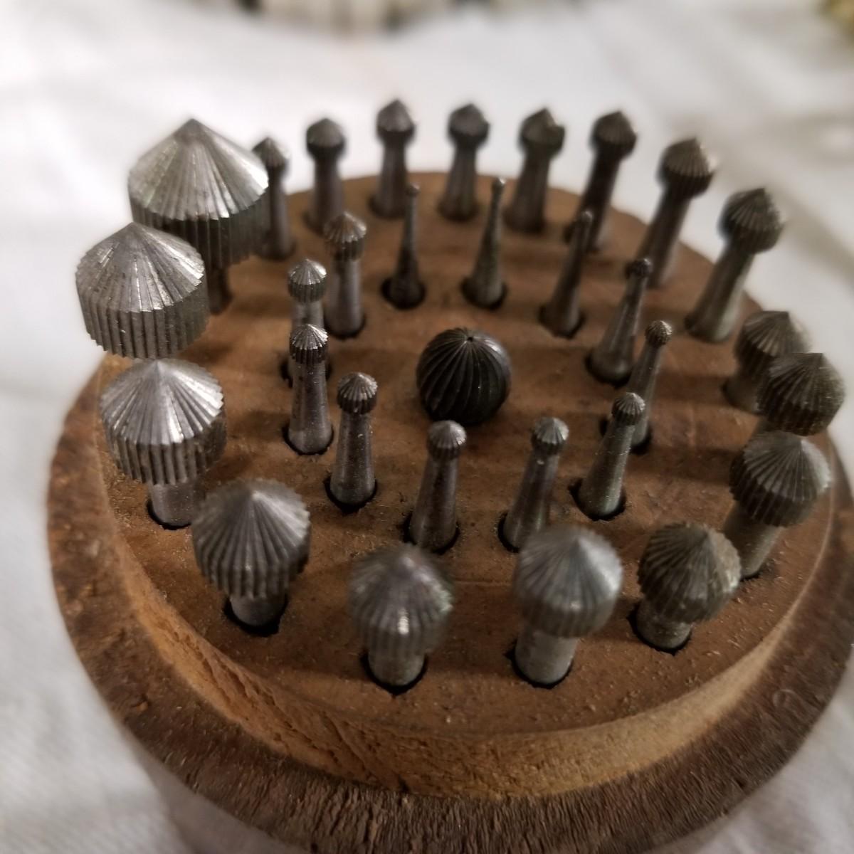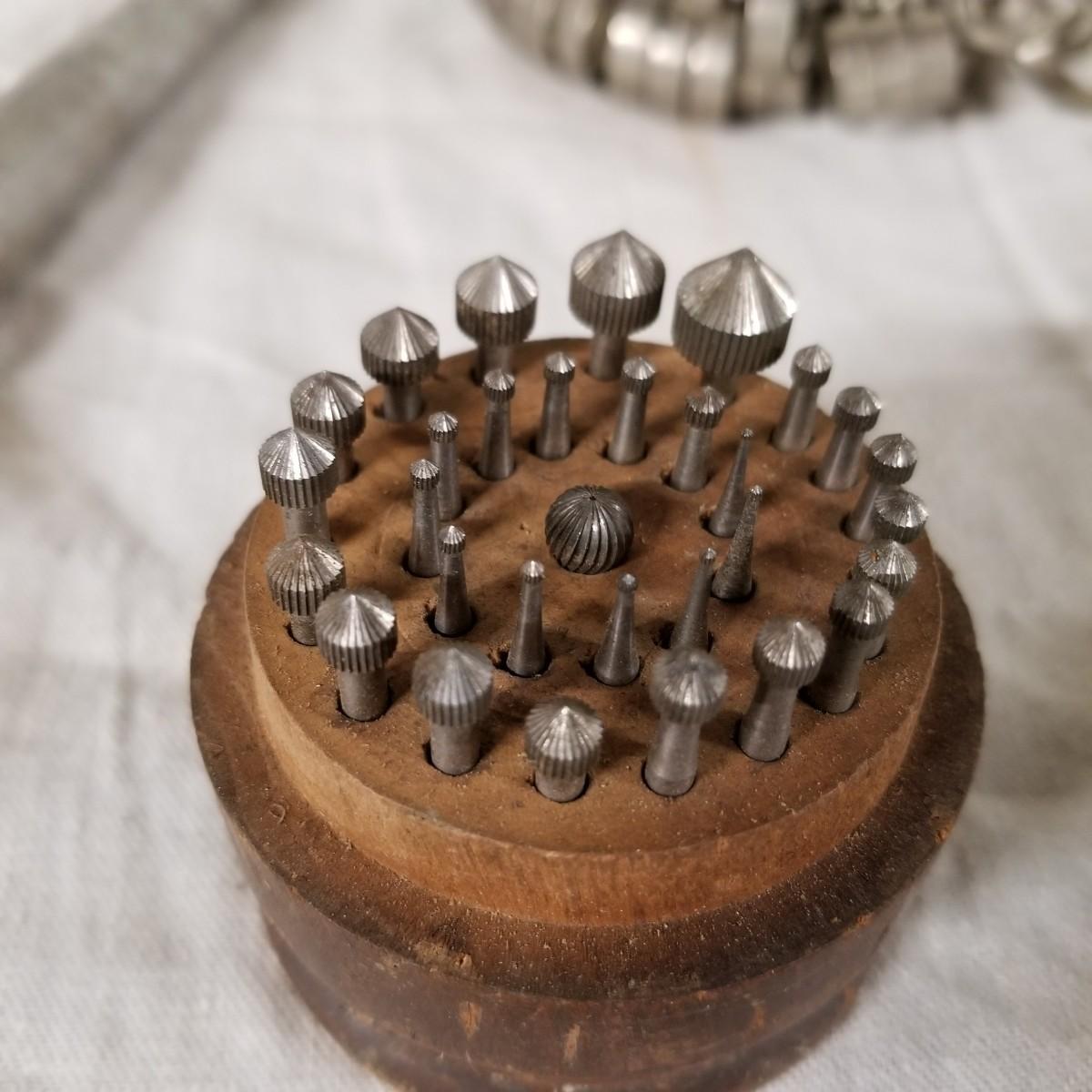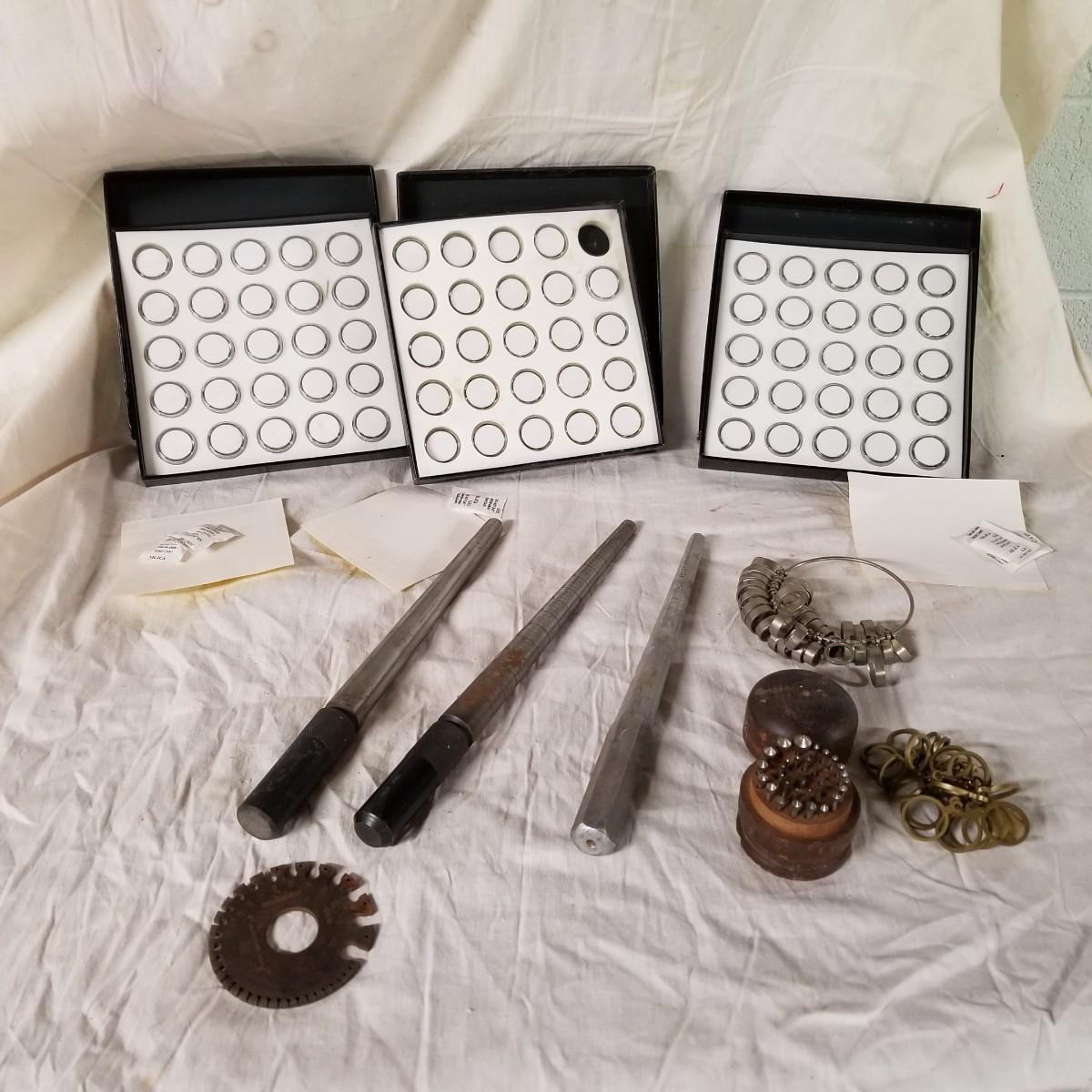 Assorted jewelers gear, two steel and one aluminium ring mandrels,  two sets of ring sizers, one plastic, one metal.   One standard wire gauge,  three boxes of stone specimen holders, 1" d, seventy four pieces total.   One set Emesco stone setting burrs in wood case. Also a zipper case with ring vise, small files, bezel pusher, others. Shipping available.