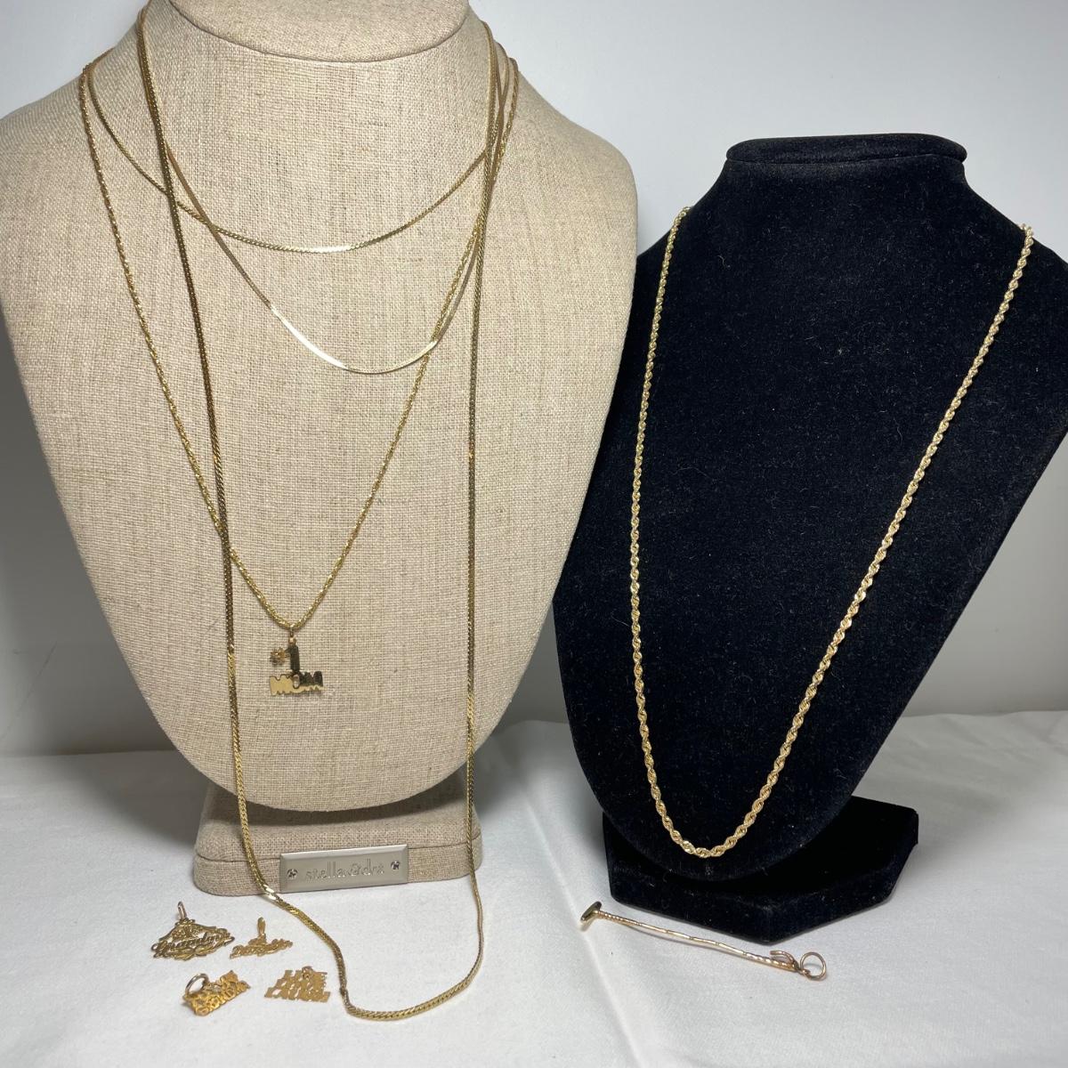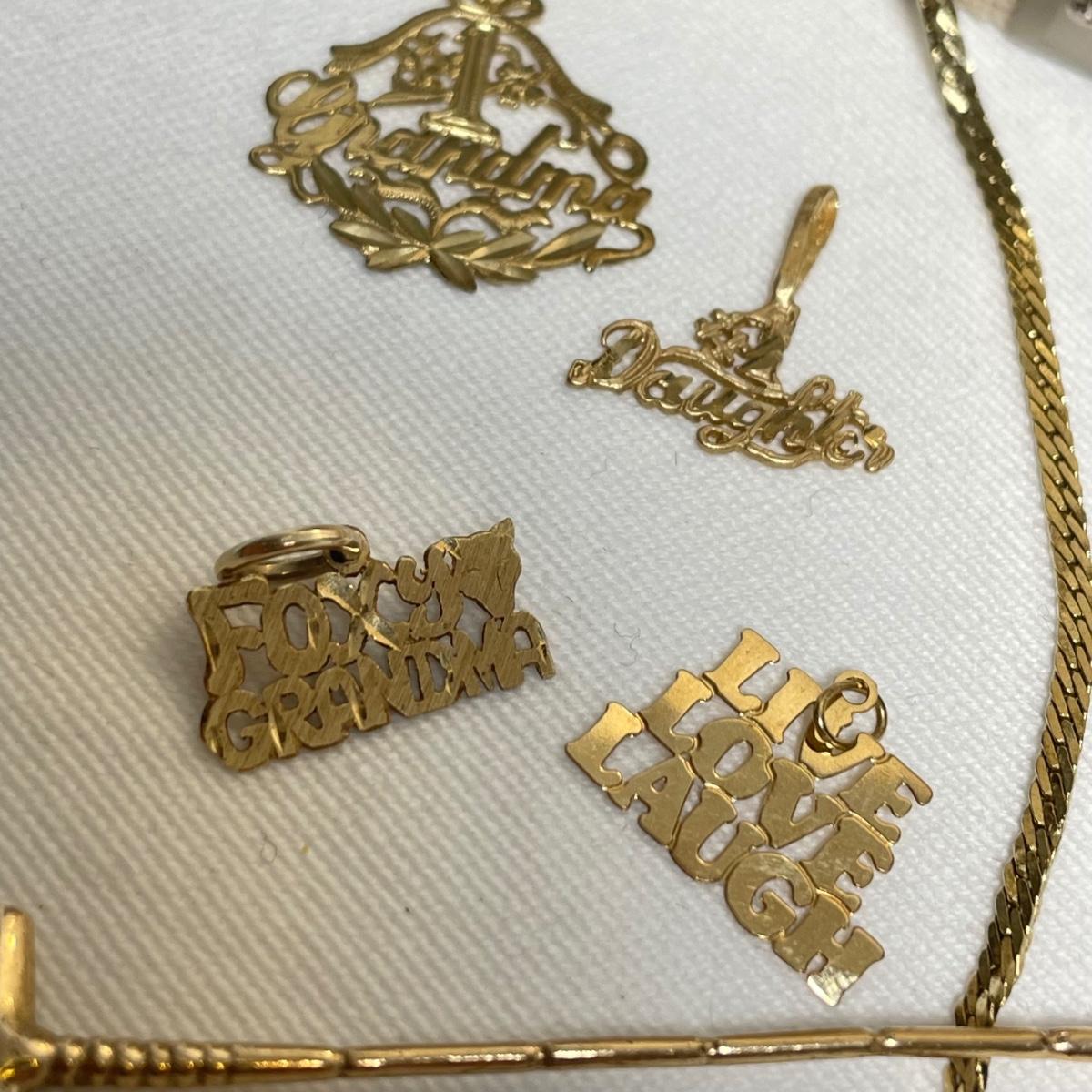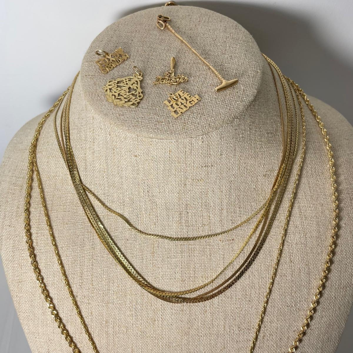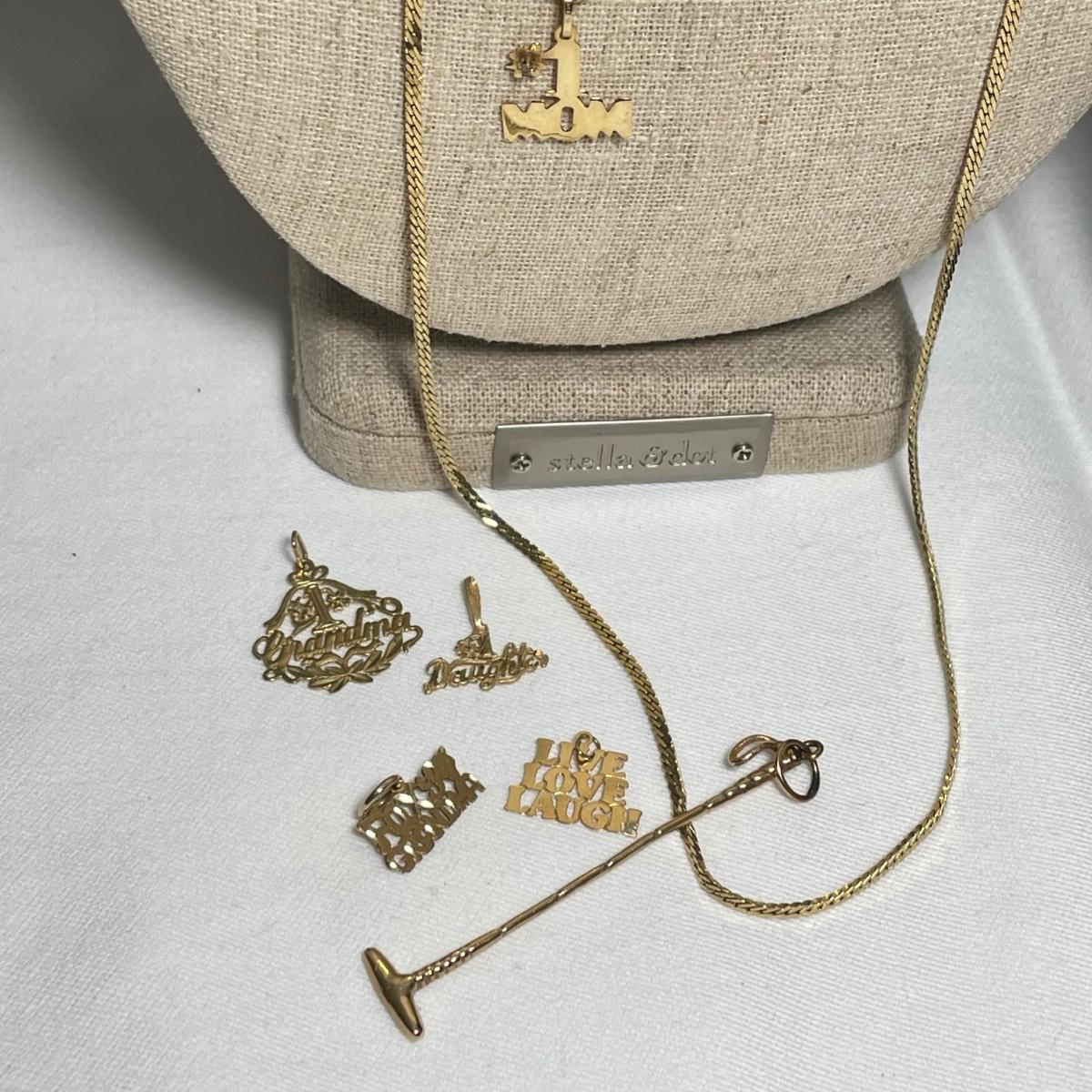 A lovely collection of mostly 14K chains with #1 charms. Lot includes two short and two longer chains along with #1 Daughter, #1 Grandma, #1 Mom and Live Love Laugh pendants with 14K or 585 markings. The thicker rope chain and the mallet pendant have 10K markings. Items are grouped in the photo with the tape measure. Foxy Grandma pendant does not appear to be marked. The longest chain is about 31”. See images. Shipping available. All sales are final. No returns or refunds. Please bid accordingly.