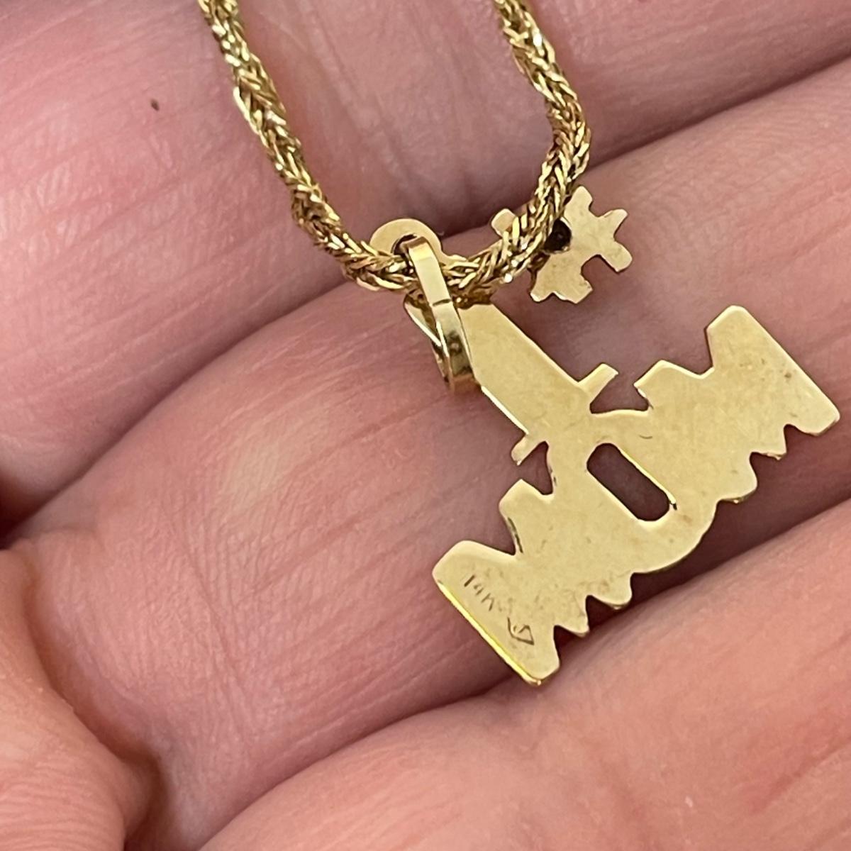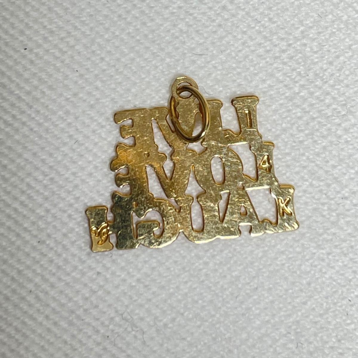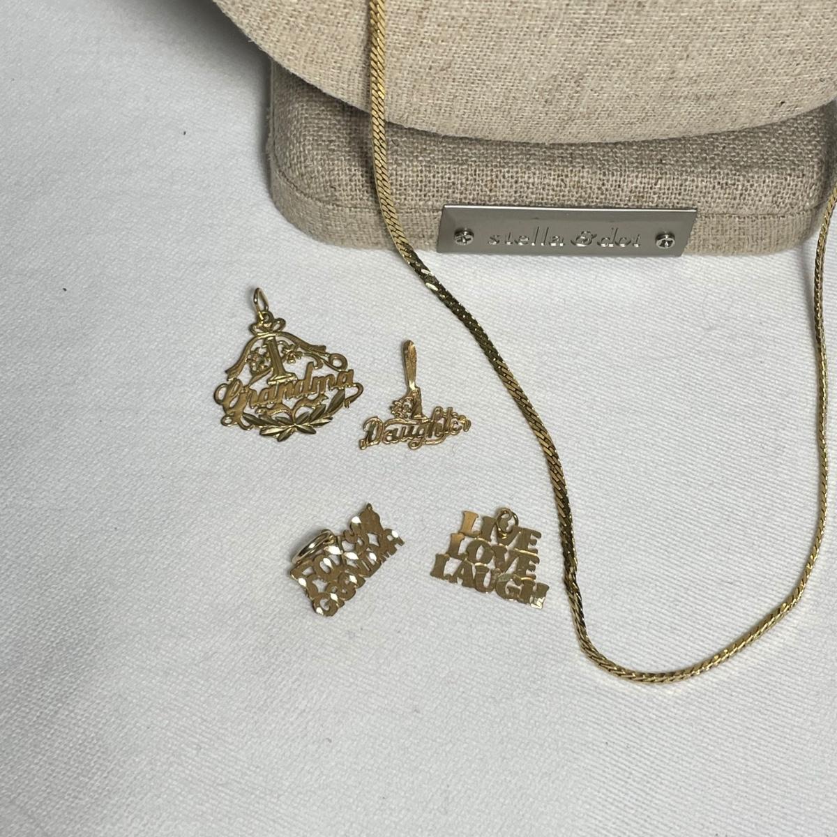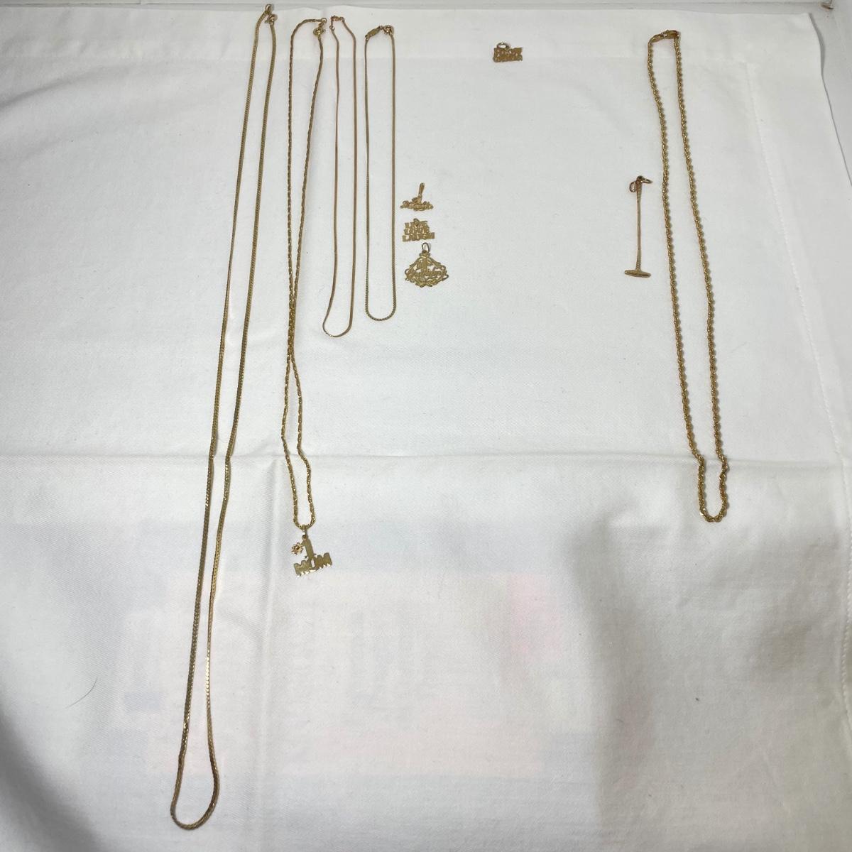 A lovely collection of mostly 14K chains with #1 charms. Lot includes two short and two longer chains along with #1 Daughter, #1 Grandma, #1 Mom and Live Love Laugh pendants with 14K or 585 markings. The thicker rope chain and the mallet pendant have 10K markings. Items are grouped in the photo with the tape measure. Foxy Grandma pendant does not appear to be marked. The longest chain is about 31”. See images. Shipping available. All sales are final. No returns or refunds. Please bid accordingly.