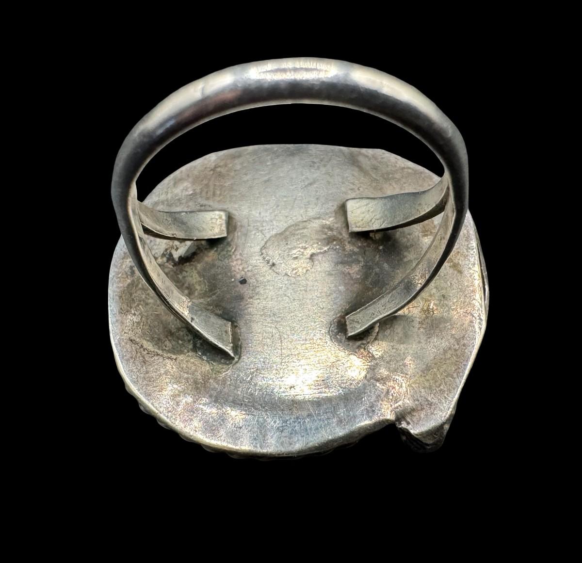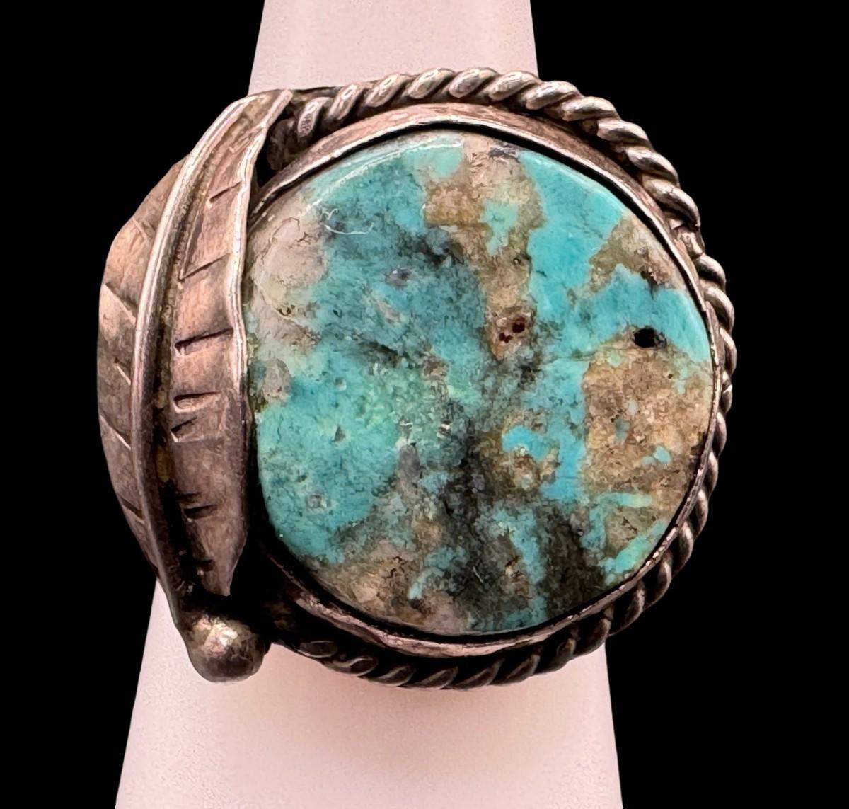 [8.12g] This ring features a flat, round turquoise stone in a traditional Southwest setting. The ring size is 6.5. Silver content confirmed using Niton XRF precious metals analyzer. [GD]