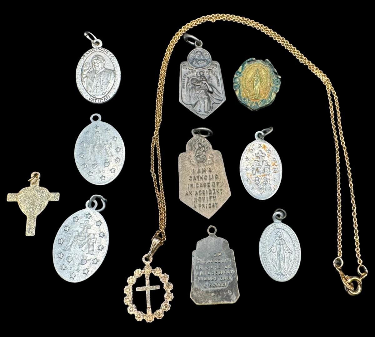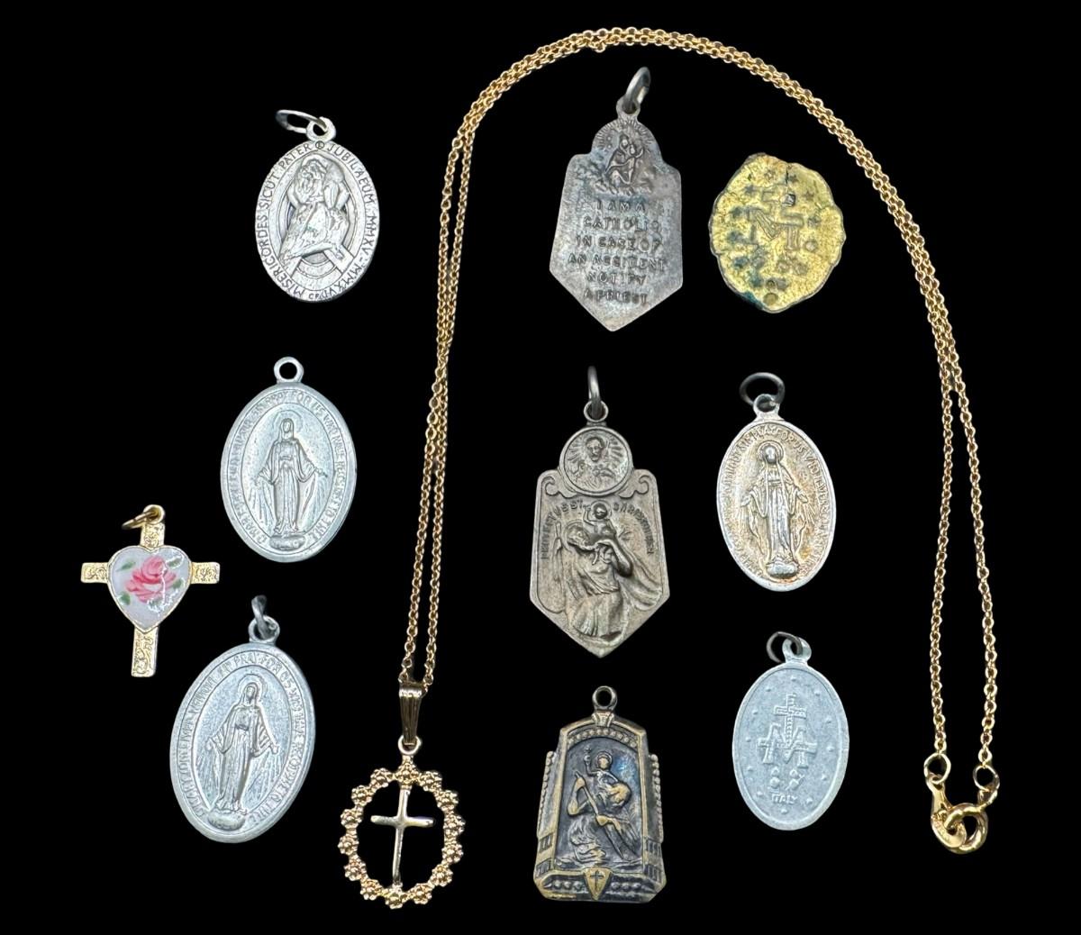 Includes a gold tone necklace, an enameled heart/cross pendant, and nine medals. Total of 11 pieces. Some of the medals have a low silver content. [GD]