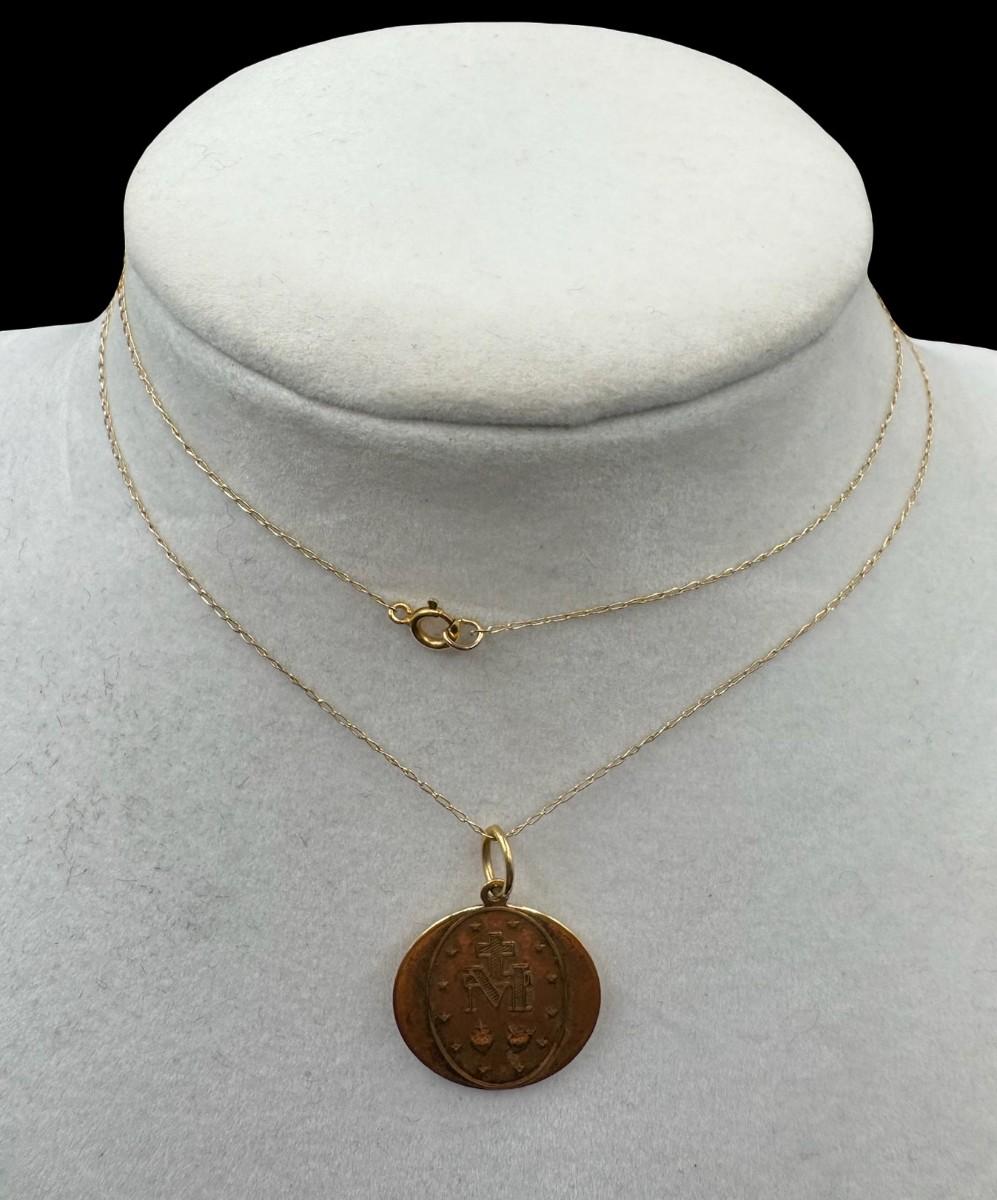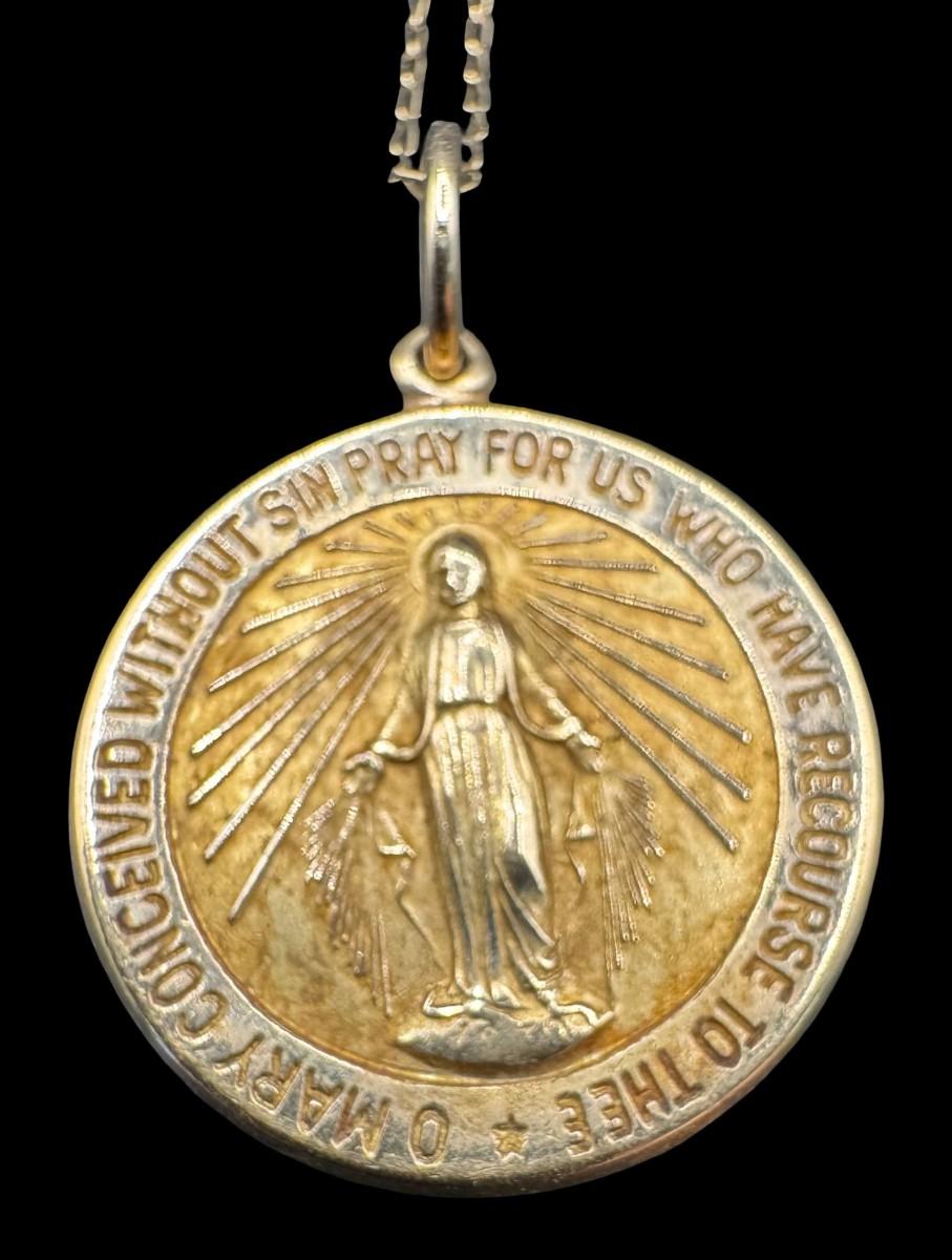 [2.90g] This necklace features a religious pendant on a delicate cable chain. Length of chain: 20”L. Gold content confirmed using Niton XRF precious metals analyzer. [GD]