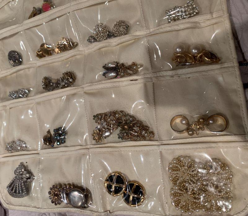 Lot includes 30 pairs of beautiful earrings in many different styles - including cubic zirconia, unique Alice in Wonderland set, and intricate gold plated lace design. Holder not included.