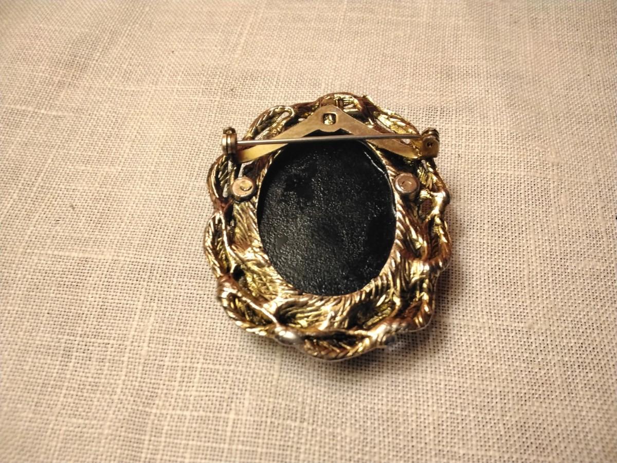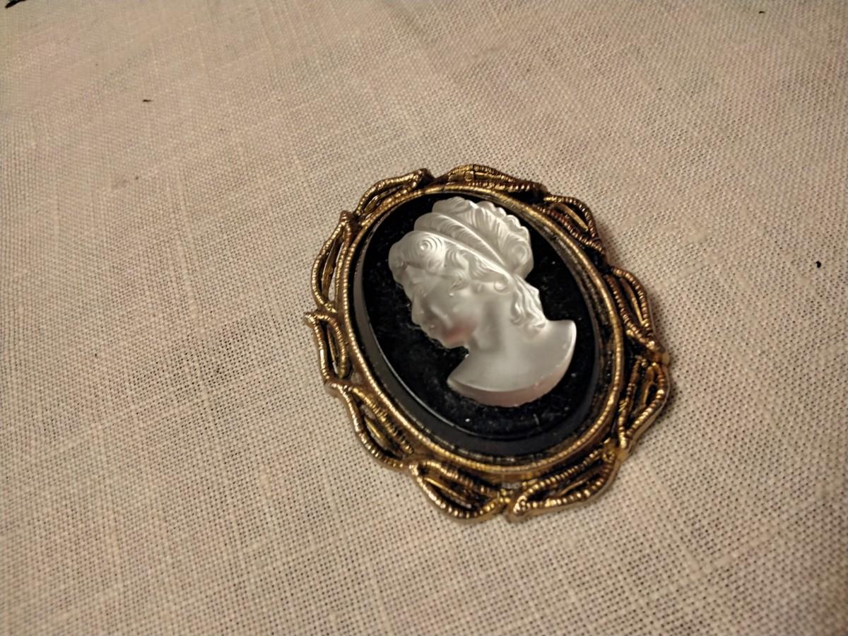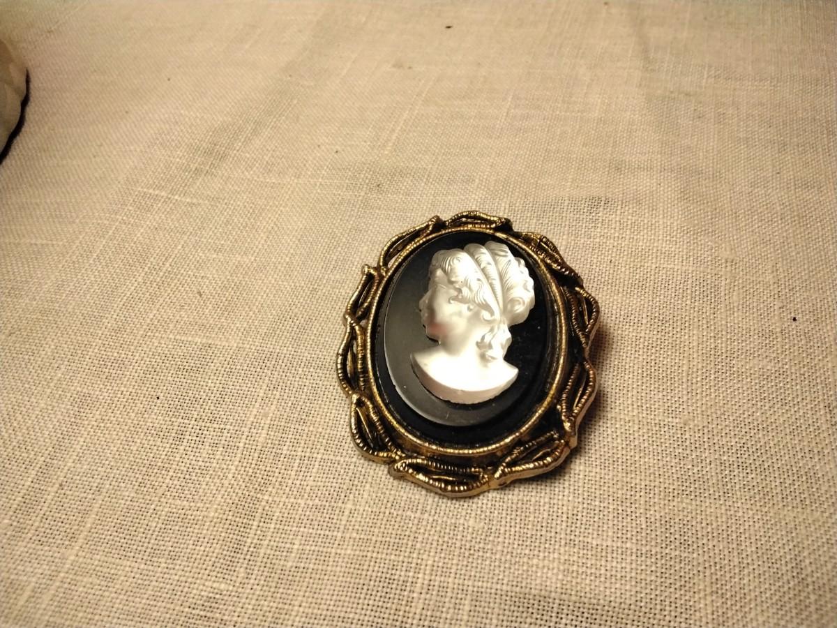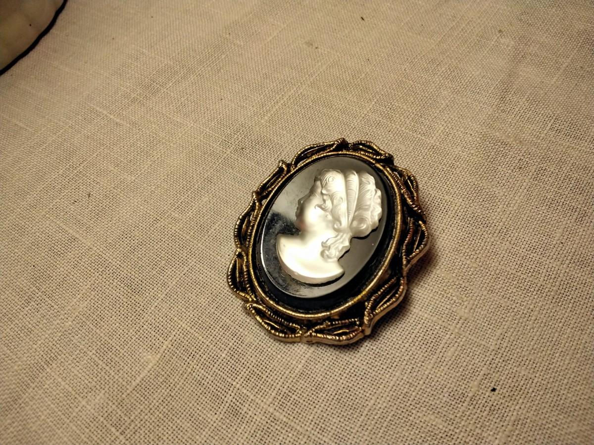 Vintage Cameo Brooch Molded White Glass On Black Onyx Pin
