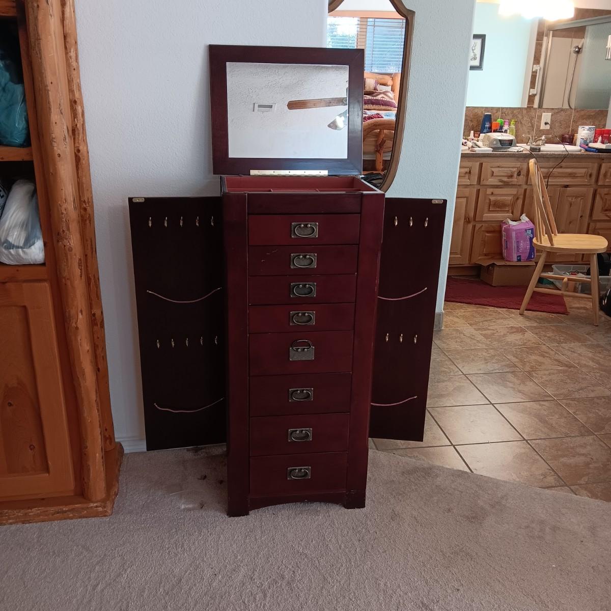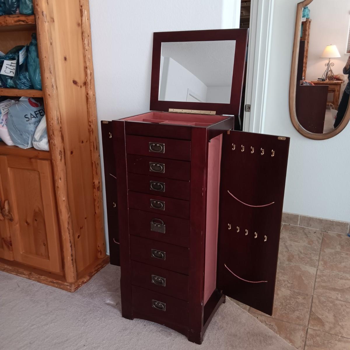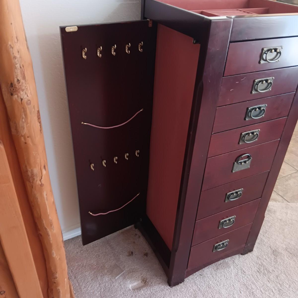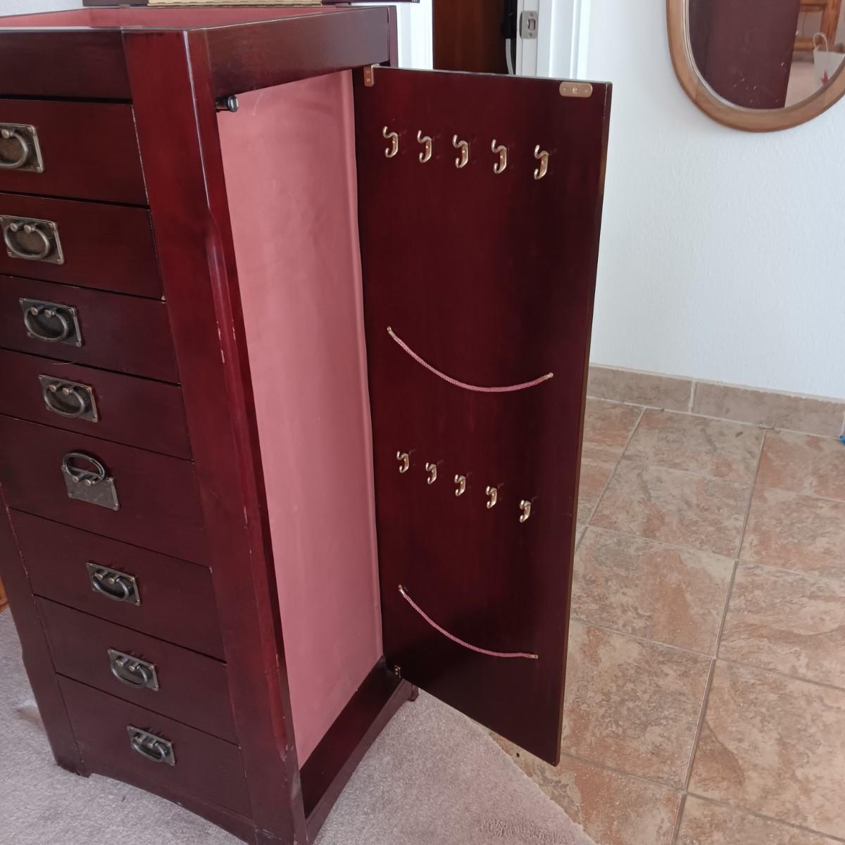 JEWELRY ARMOIRE W/8 DRAWERS, SIDE DOORS FOR NECKLACES AND LIFT UP TOP W/MIRROR