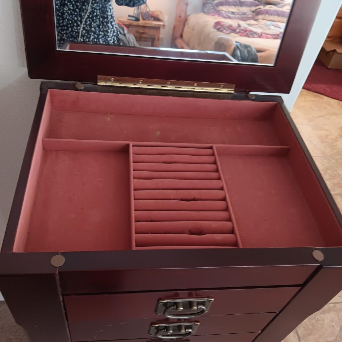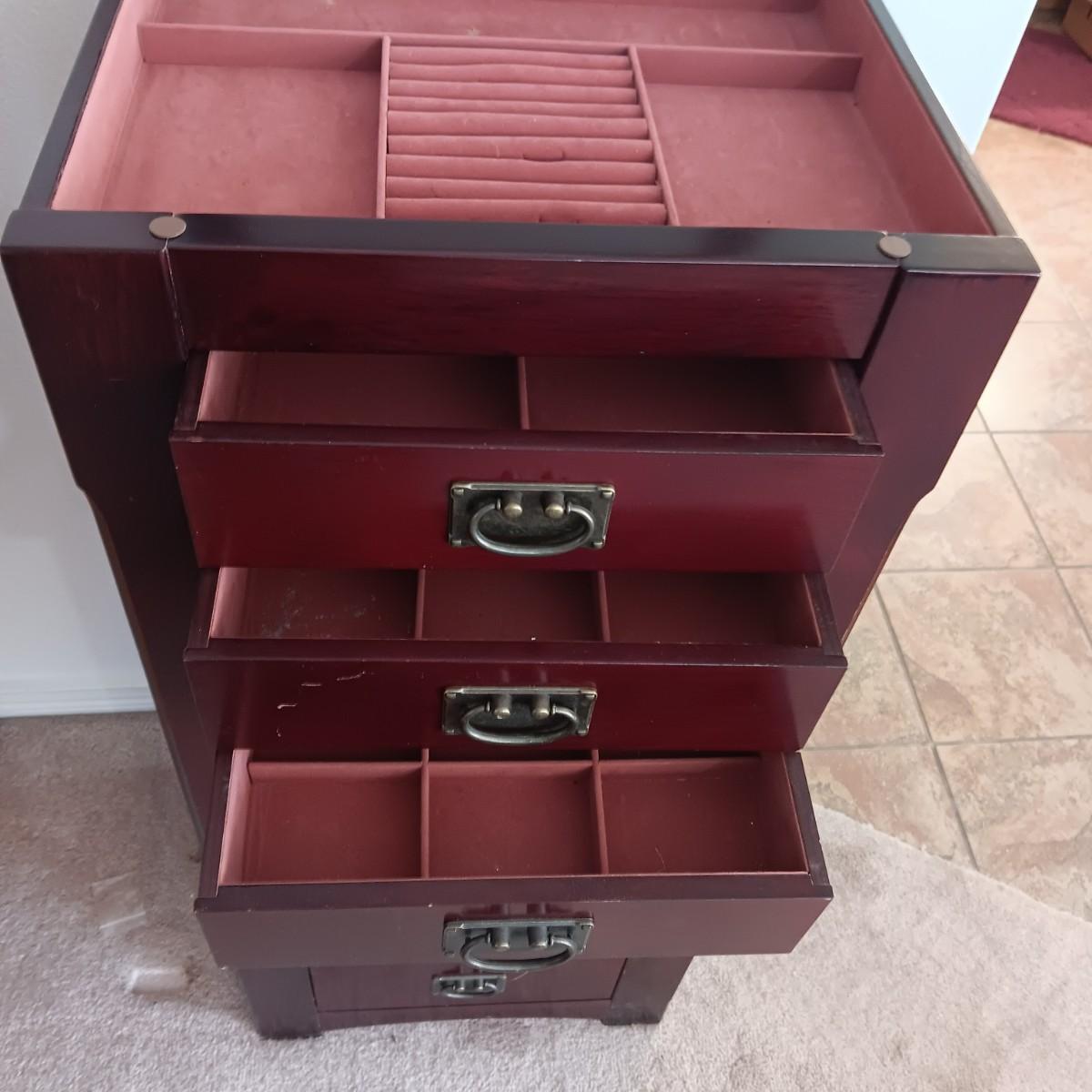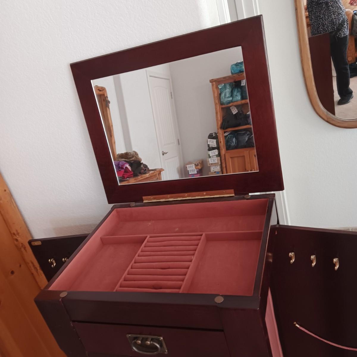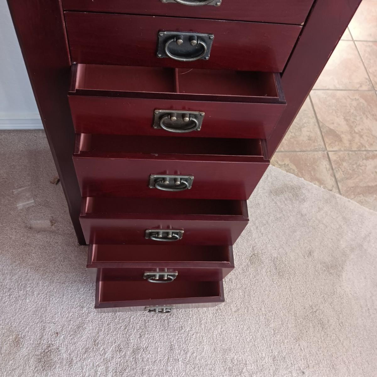 JEWELRY ARMOIRE W/8 DRAWERS, SIDE DOORS FOR NECKLACES AND LIFT UP TOP W/MIRROR