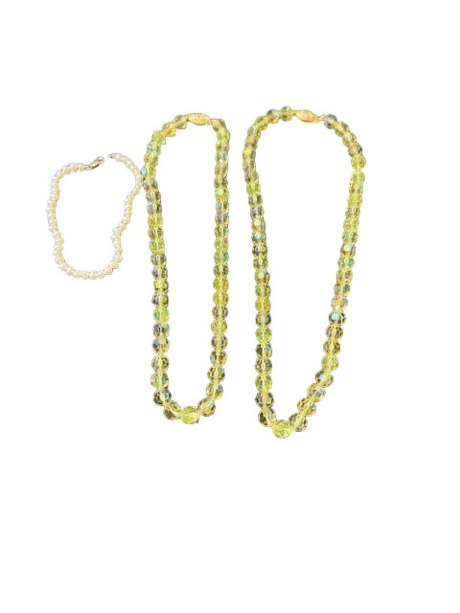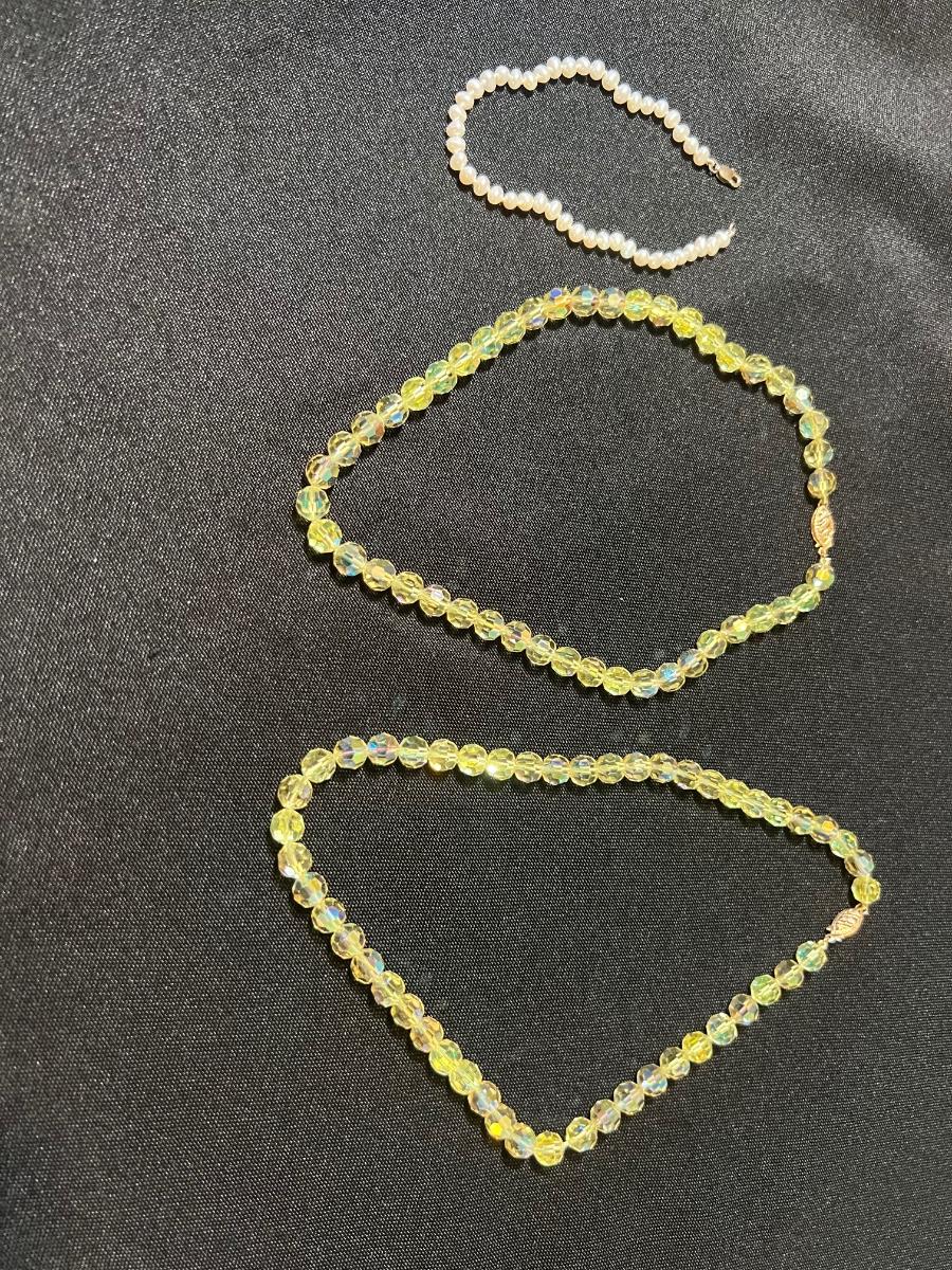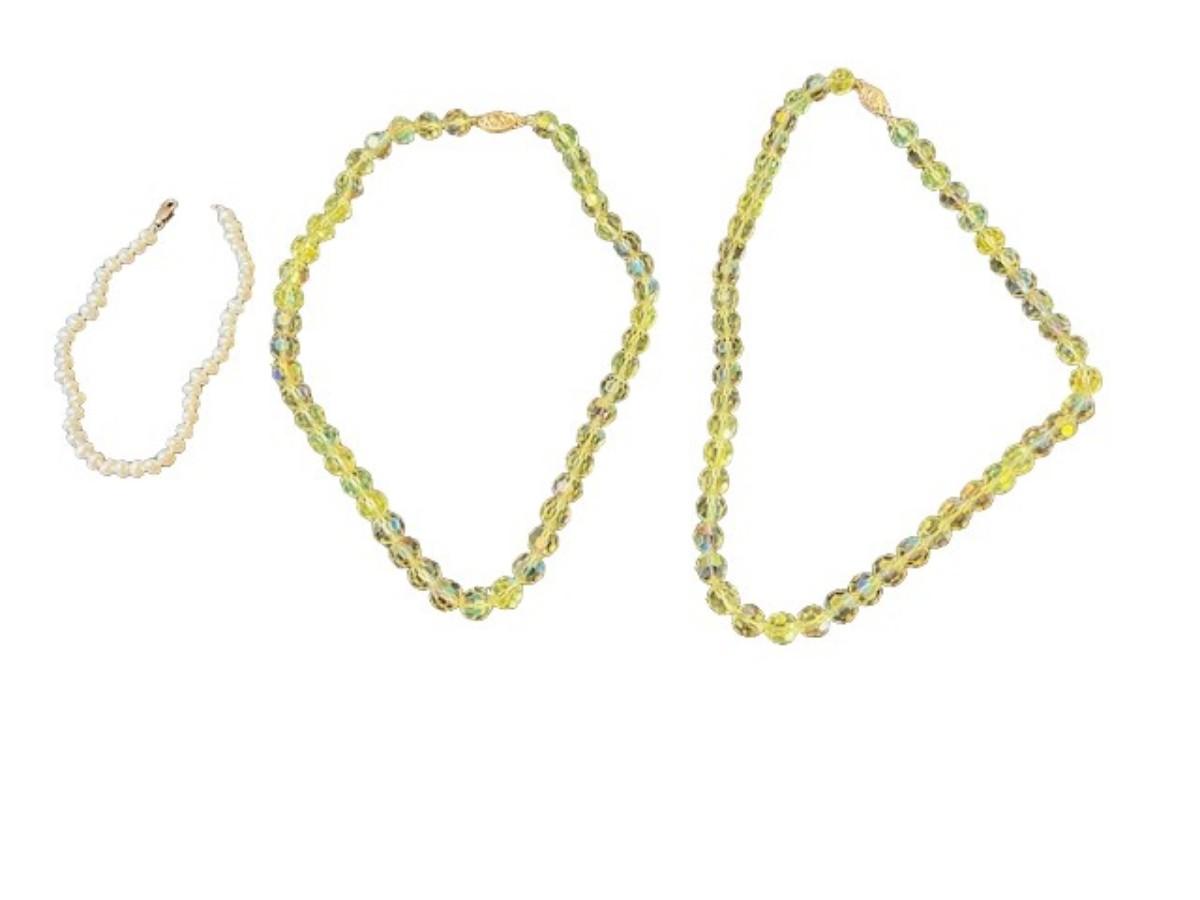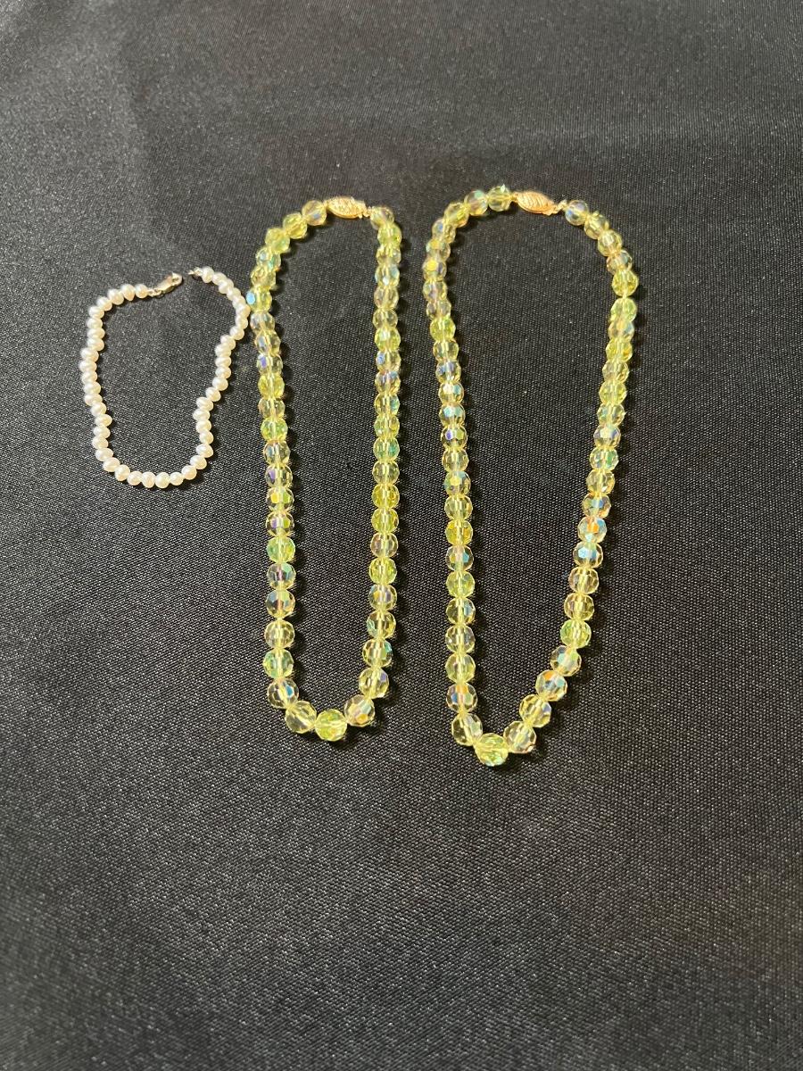 Includes two Bohemian crystal bead necklaces, and one juvenile pearl bracelet. Total of 3 pieces. Measurement of longest: 14"L.
