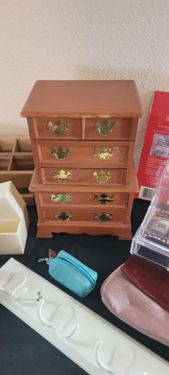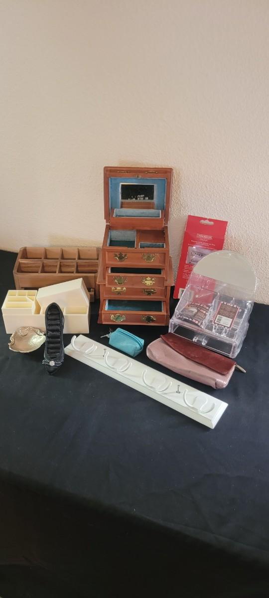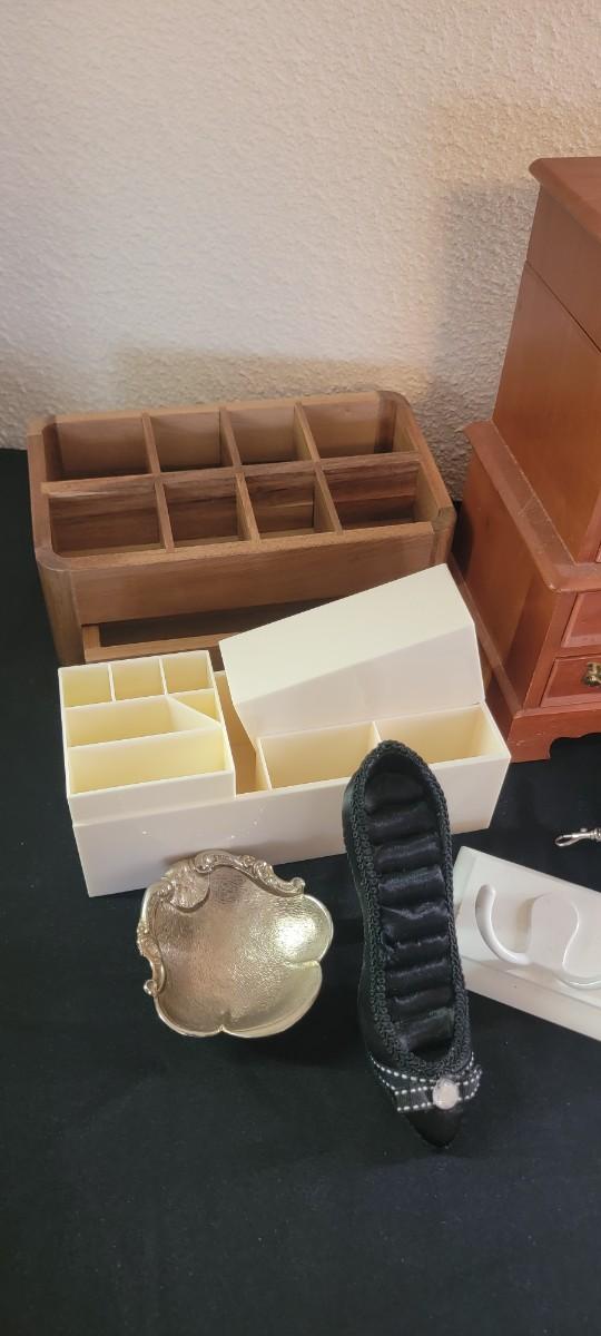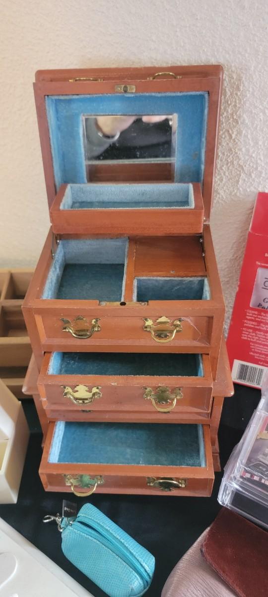 Vintage jewelry box with blue velvet like lining, plus other jewelry storage
