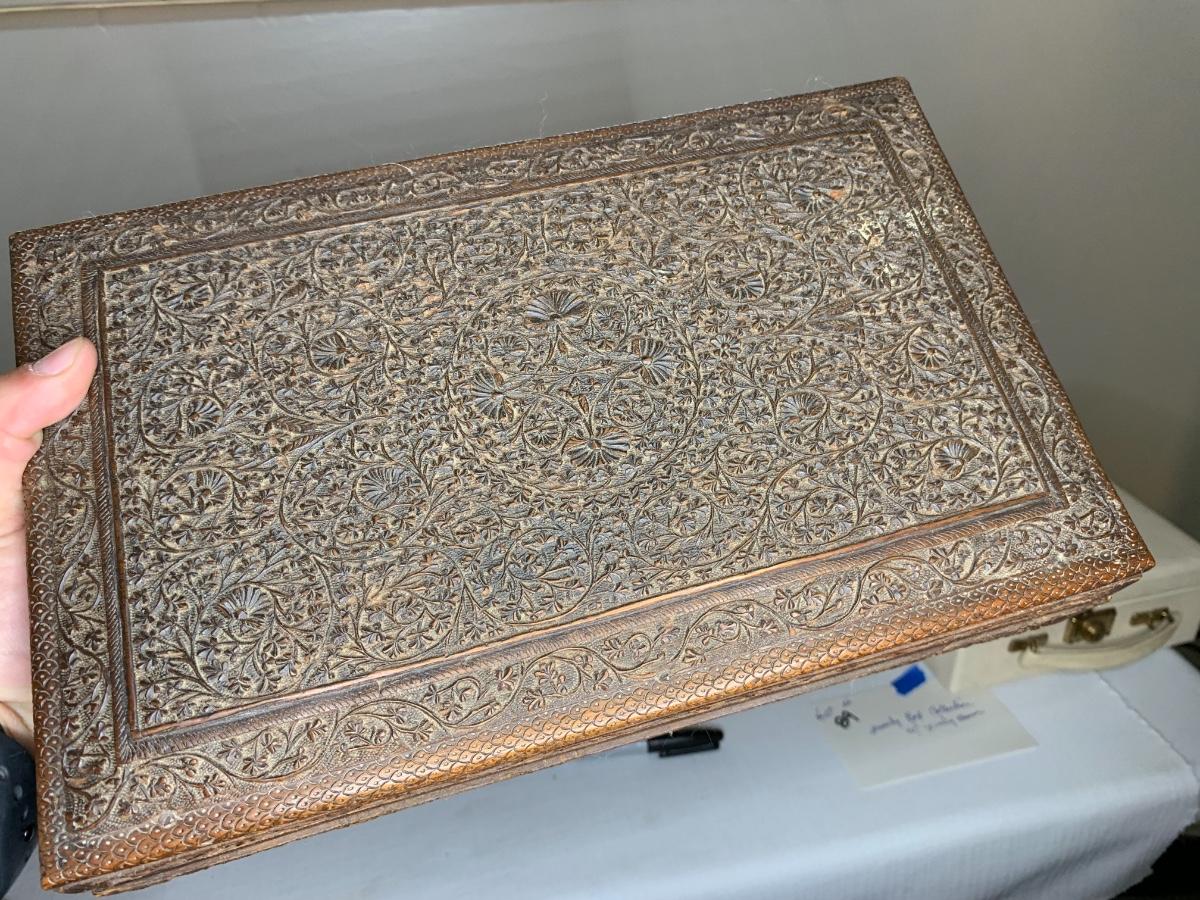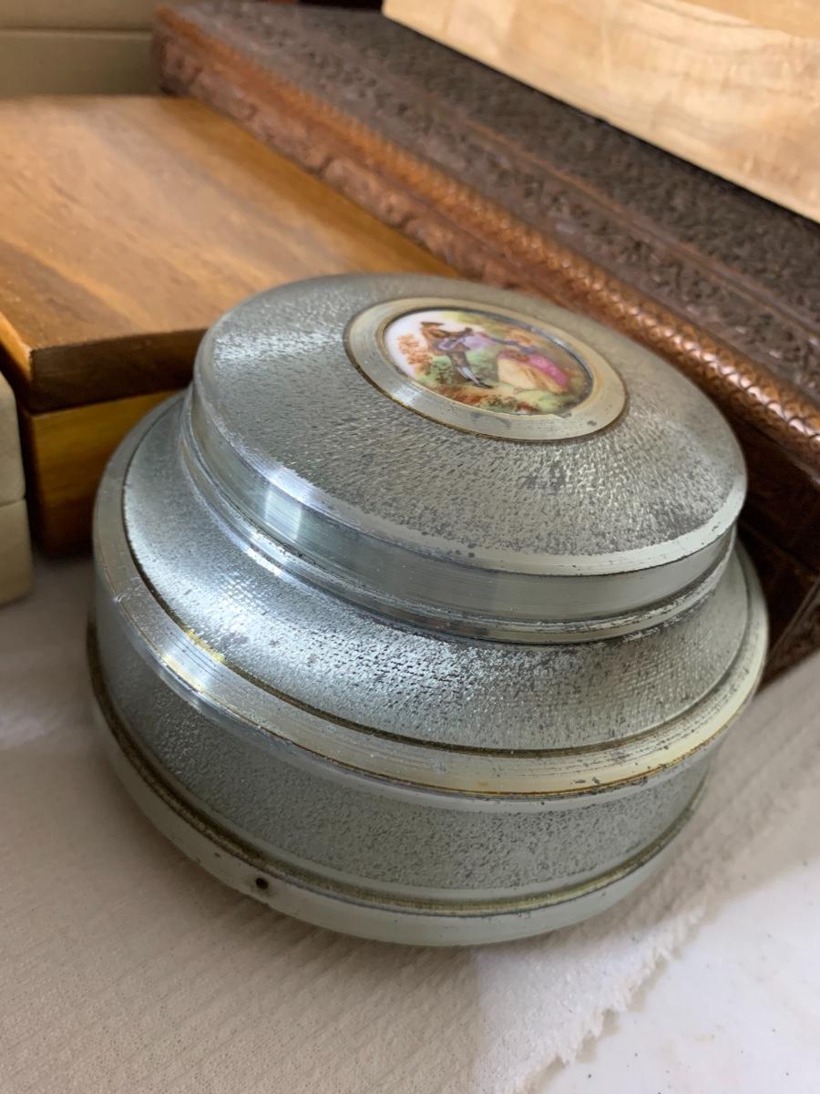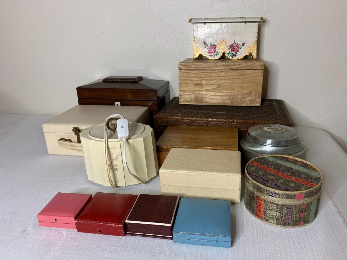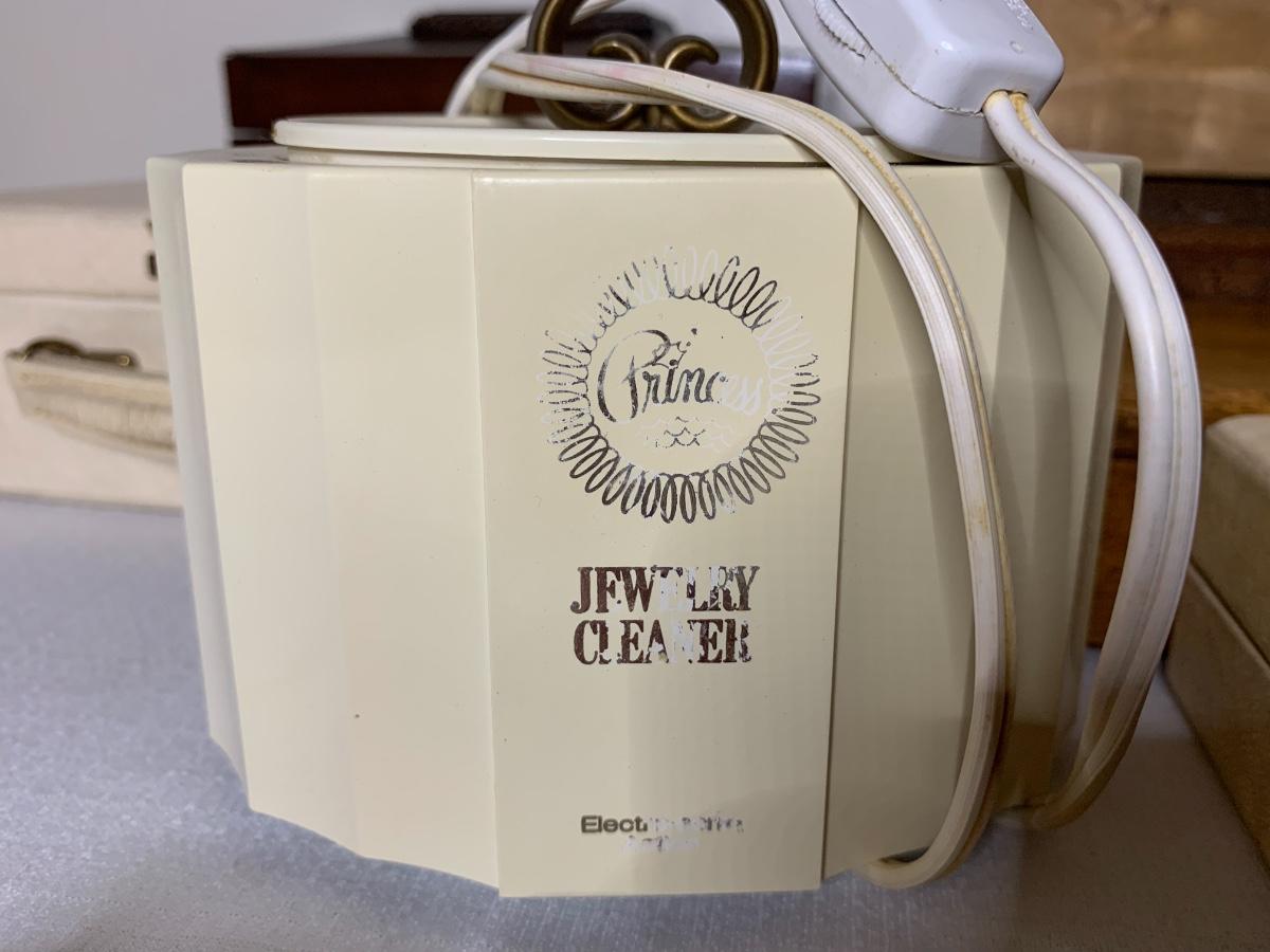 Lot full of different sizes and styles of jewelry/trinket boxes along with a music box and vintage electric jewelry cleaner