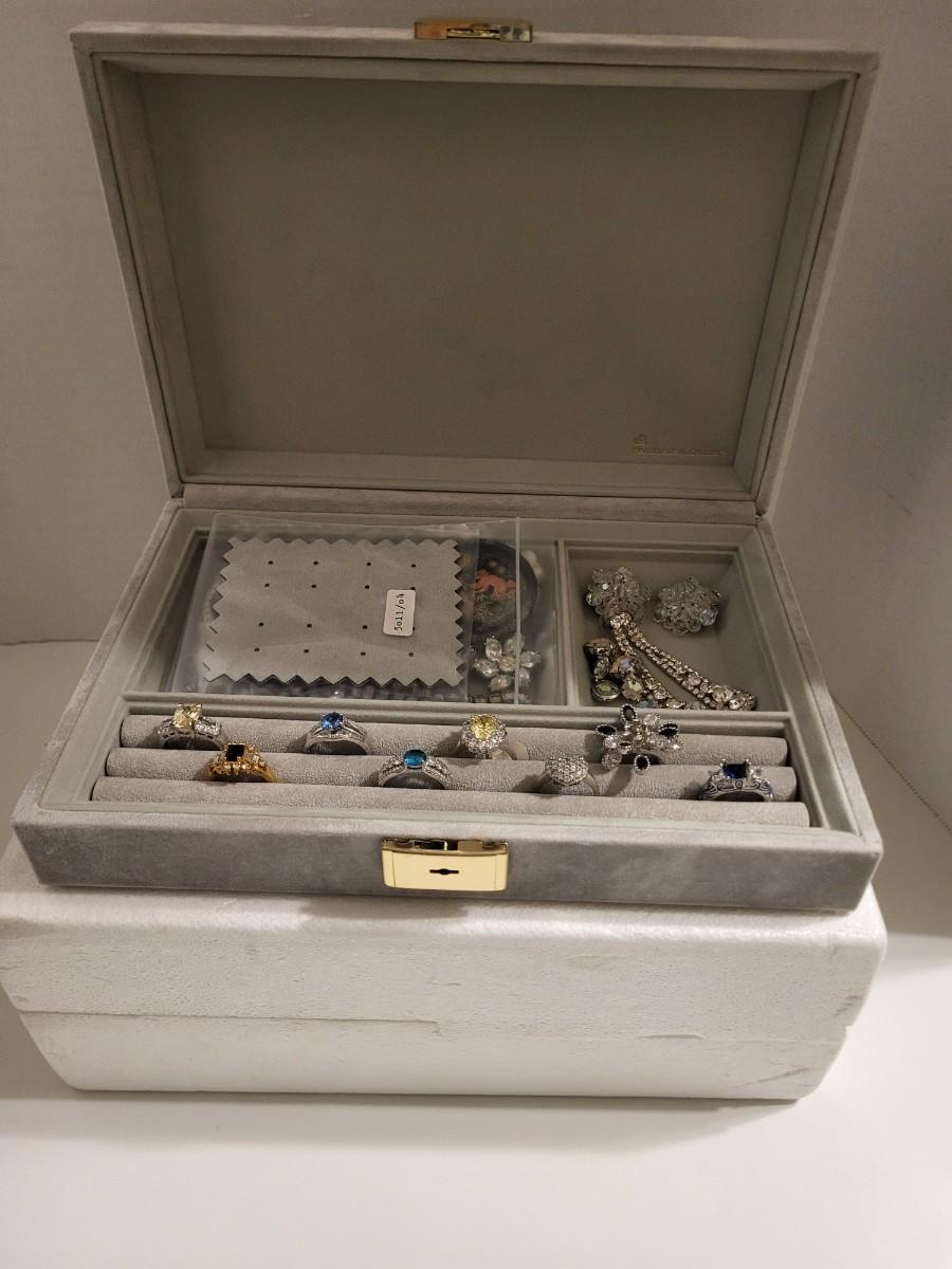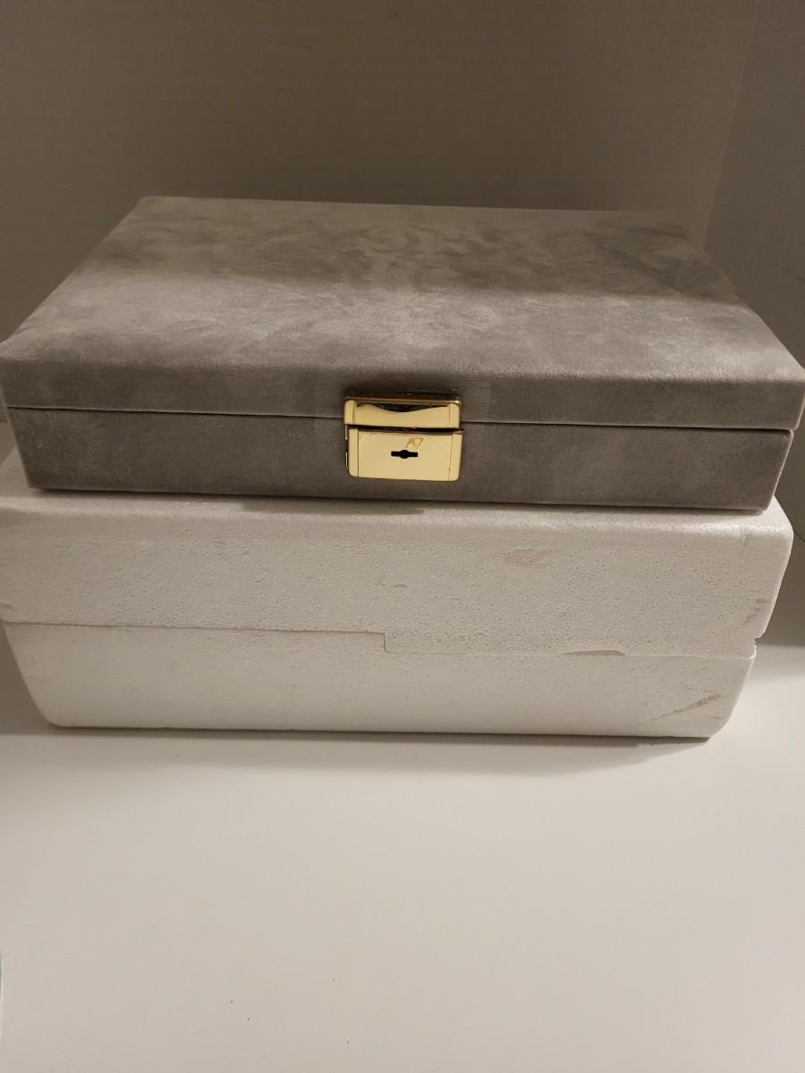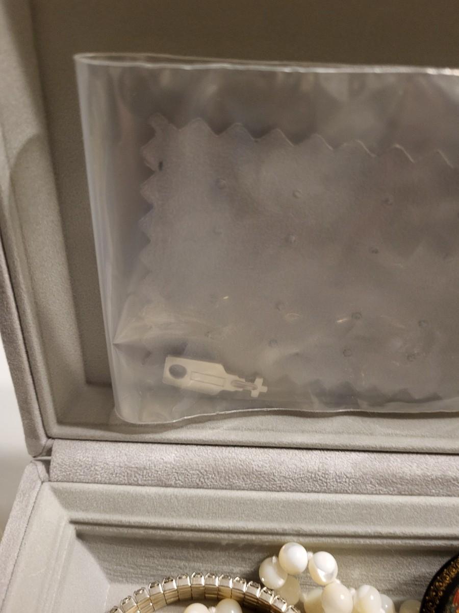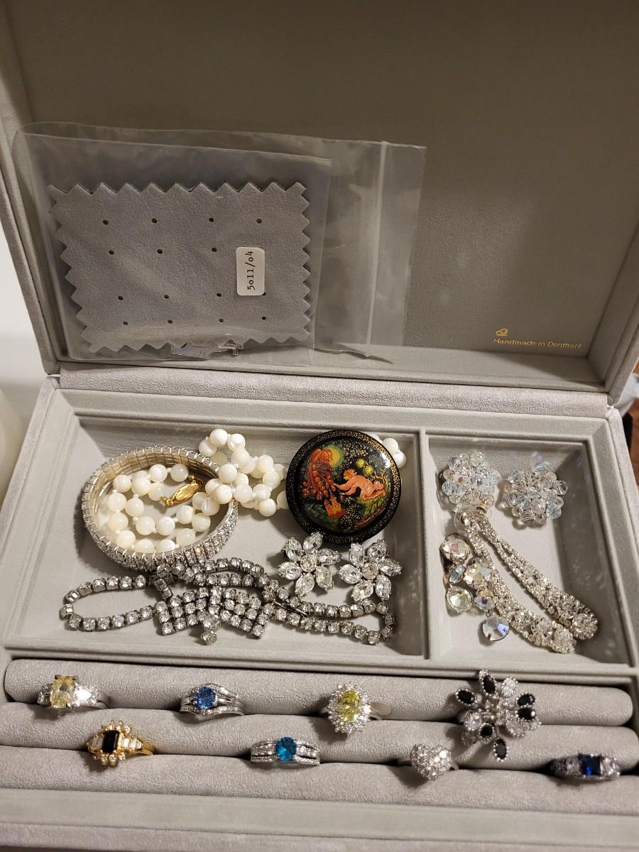 JEWELRY BOX MADE IN DENMARK W/KEY AND VARIOUS PIECES OF VINTAGE JEWELRY