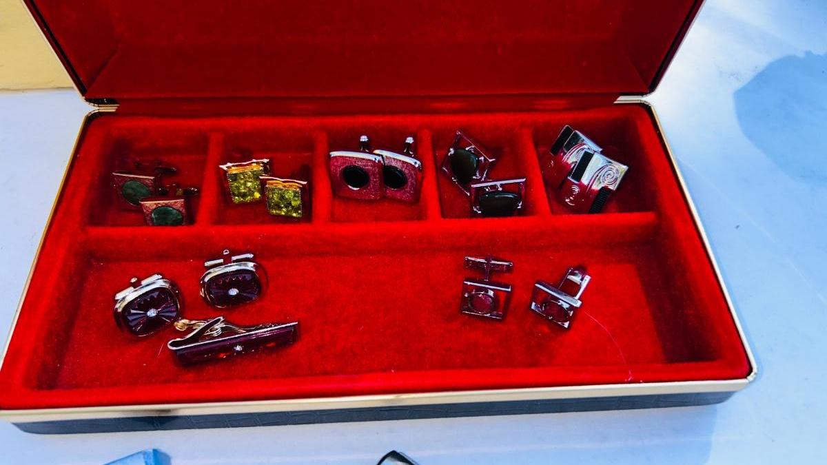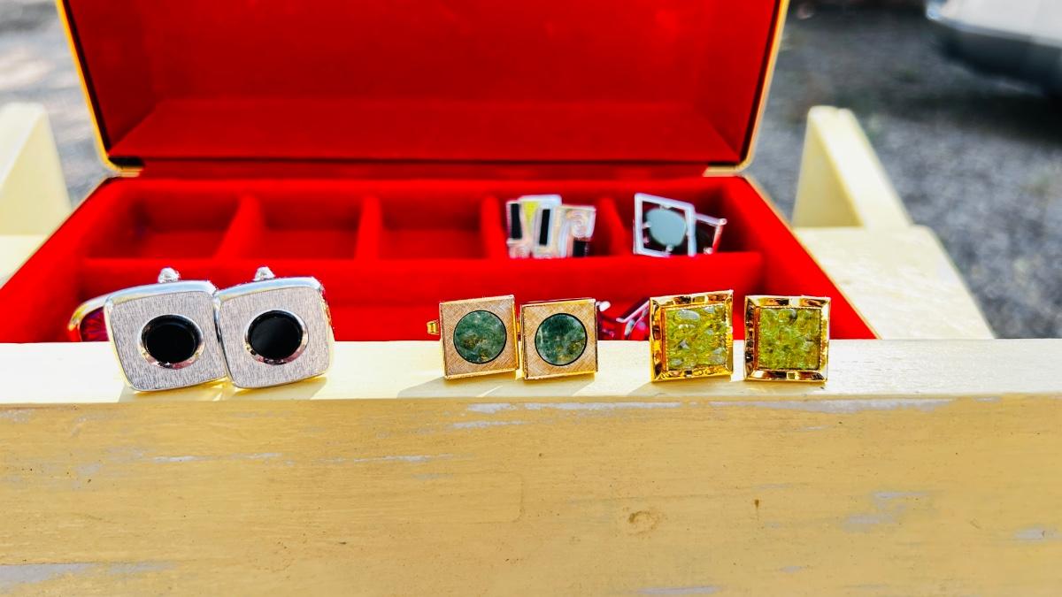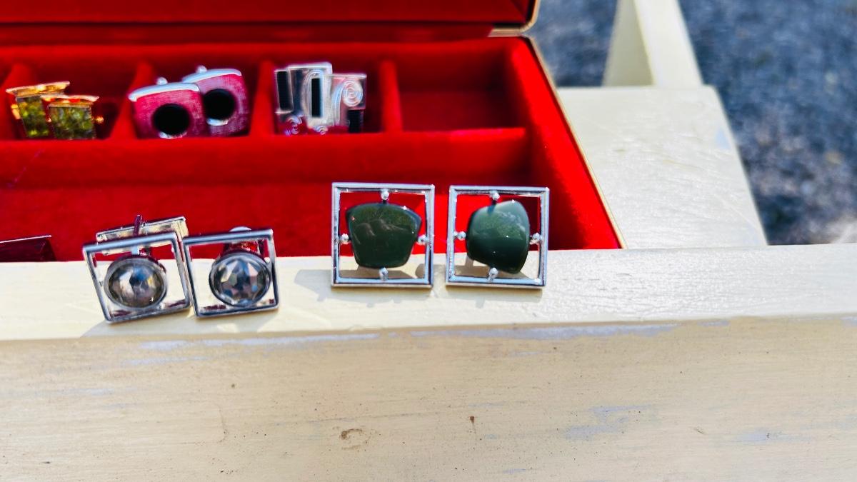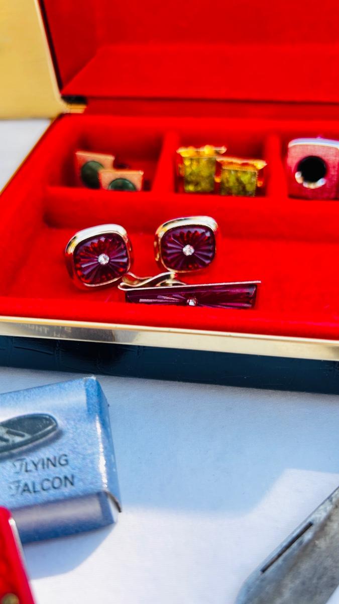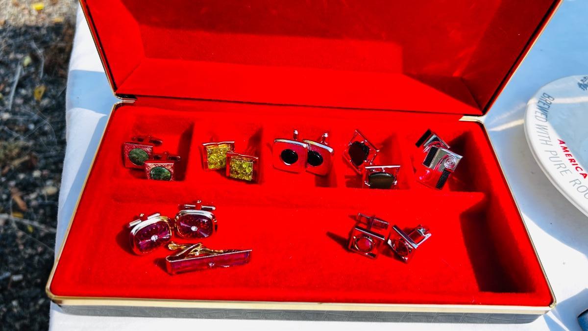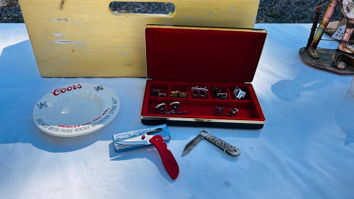 JEWELRY BOX PACKED WITH VINTAGE CUFFLINKS, 2 POCKET KNIVES AND A COORS ASHTRAY