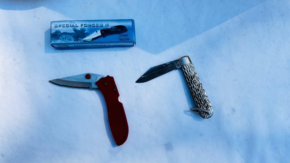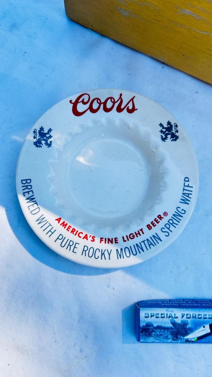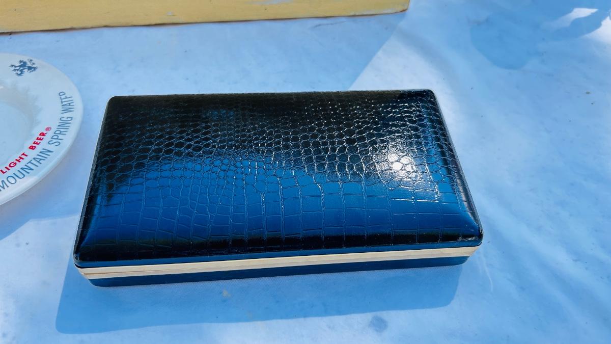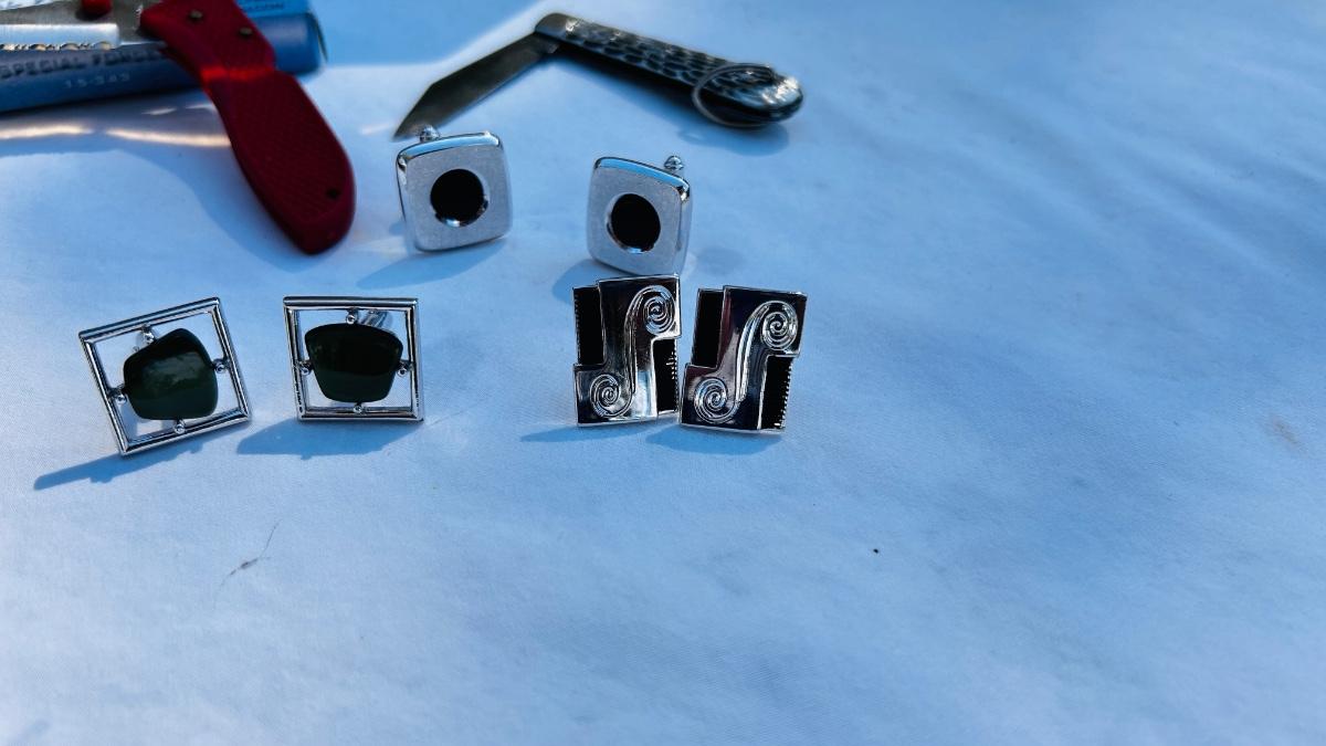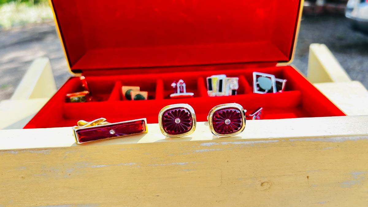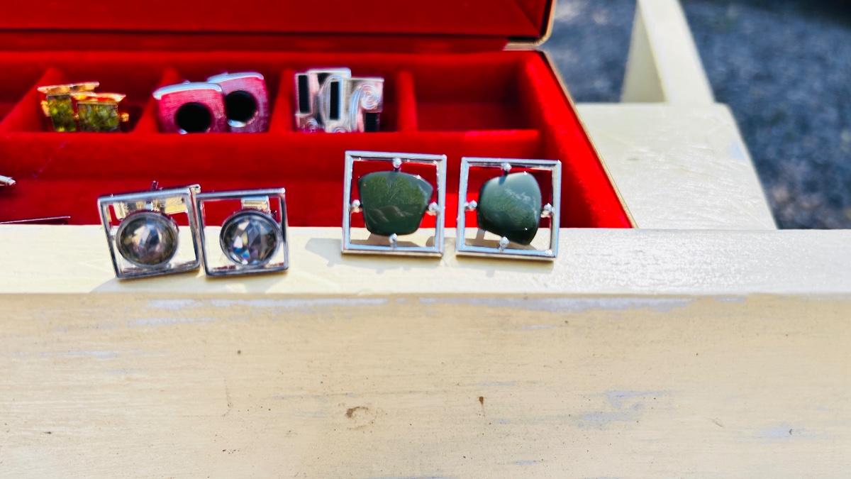 JEWELRY BOX PACKED WITH VINTAGE CUFFLINKS, 2 POCKET KNIVES AND A COORS ASHTRAY