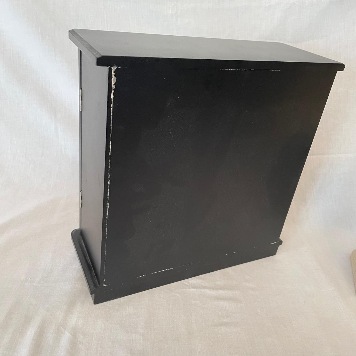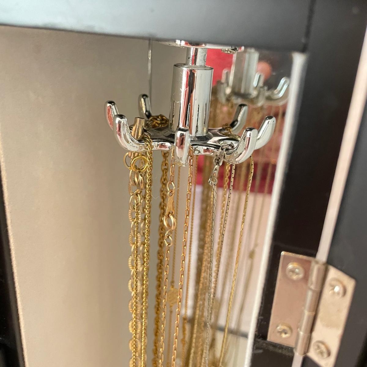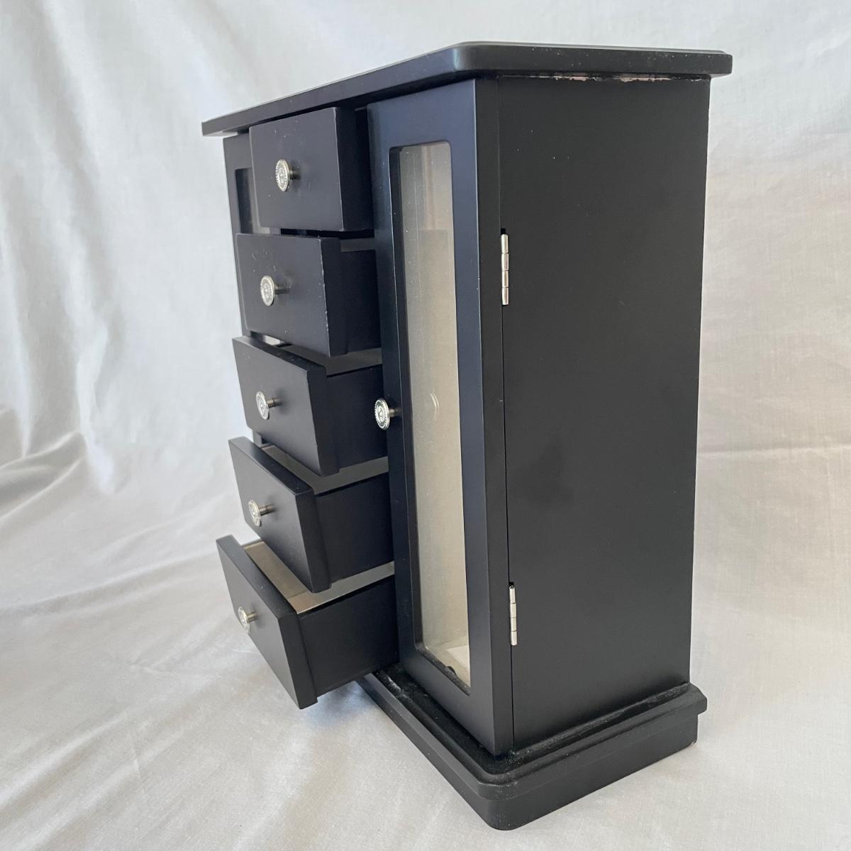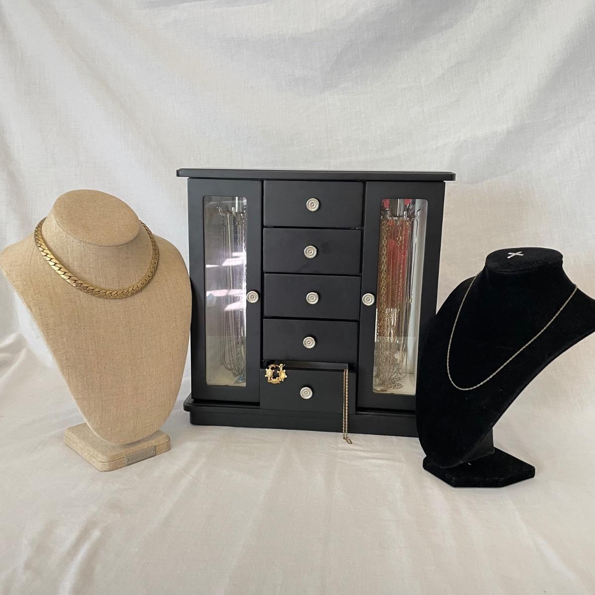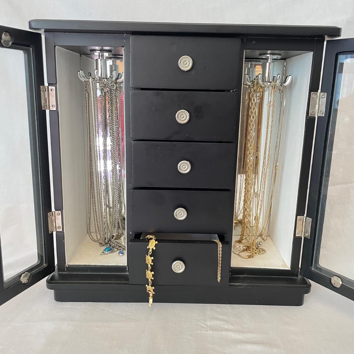 Around 20 chains with a few pendants, bracelet, and jewelry box. The black painted wooden box has five drawers and two 10-pronged necklace racks surrounded by glass windows. The drawers have a few light stains inside. Jewelry box measures 12” x 4.5” x 12”H. Necklaces are silver and gold colored. One is marked Sterling along with the cross pendant. Lot includes a small turtle bracelet. See images. Local pick up only. All sales are final. No returns or refunds. Please bid accordingly.