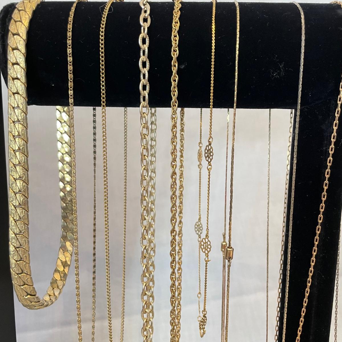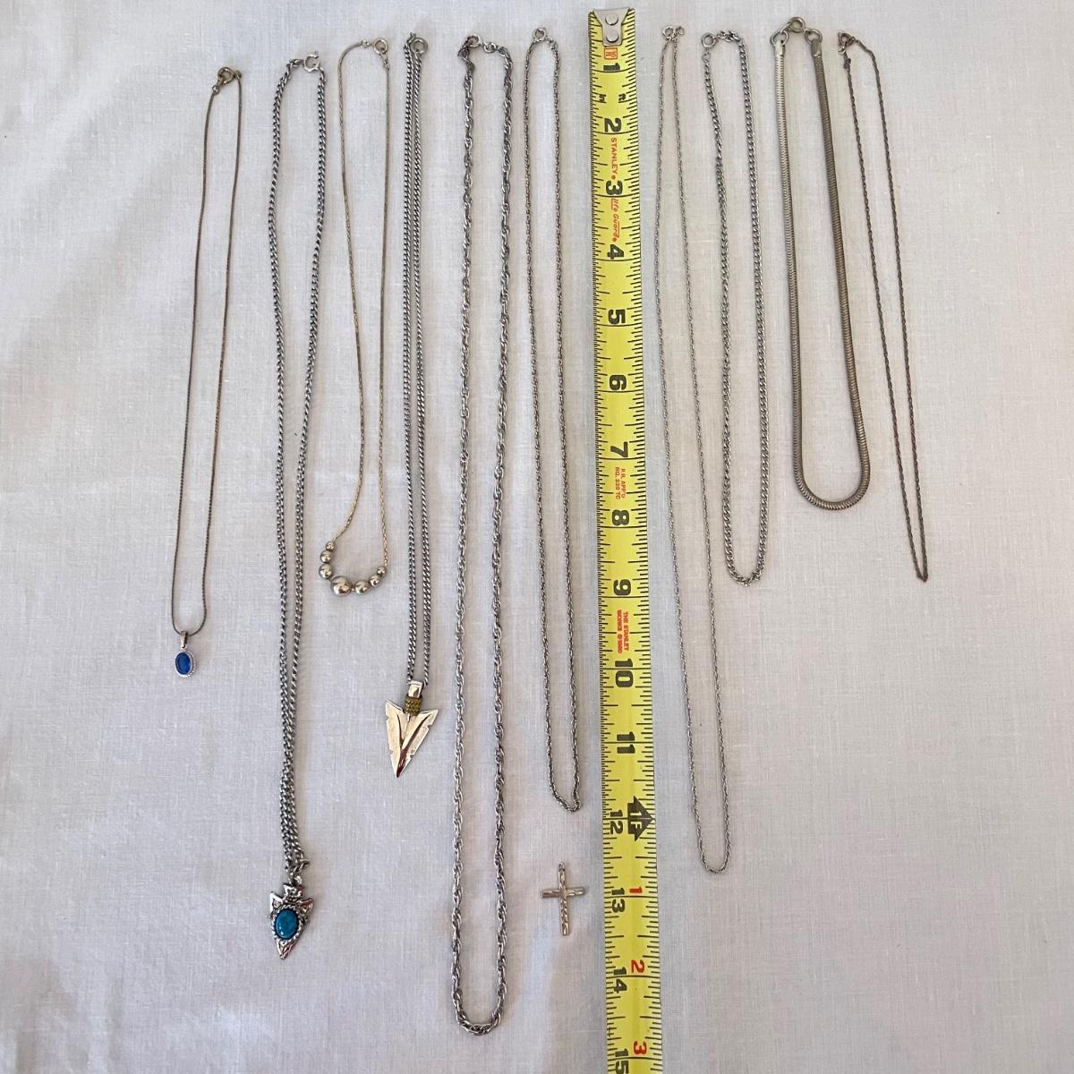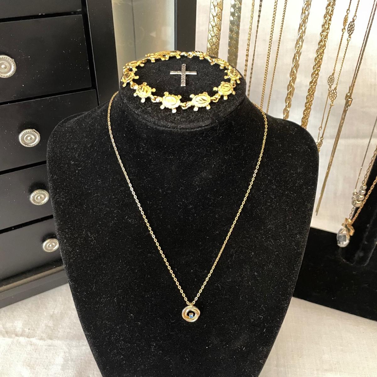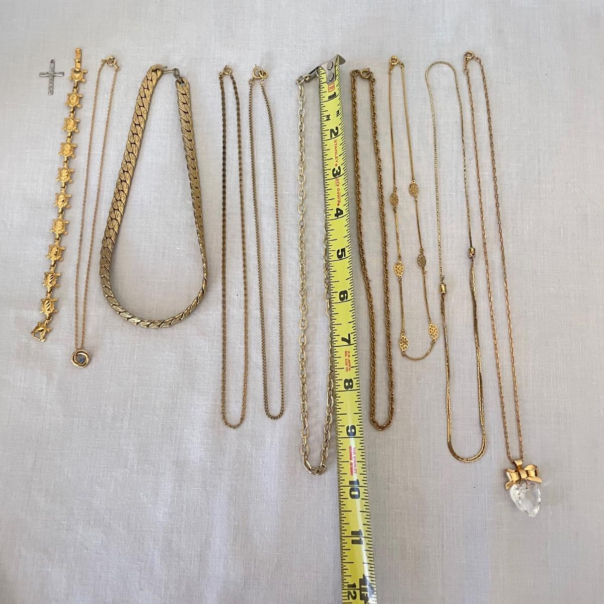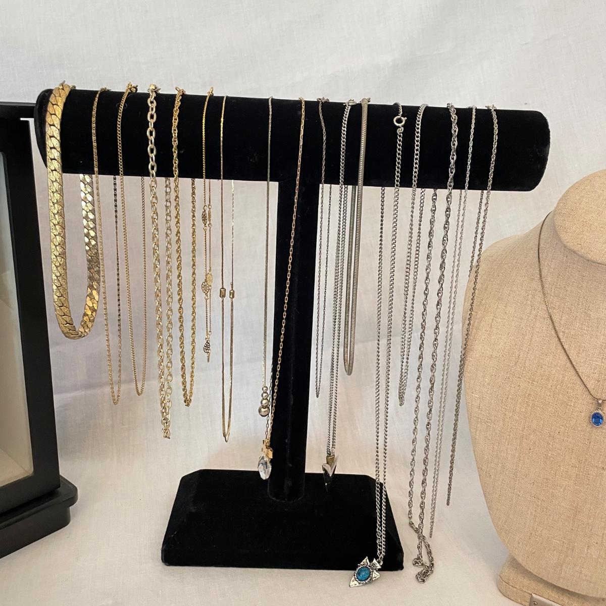 Around 20 chains with a few pendants, bracelet, and jewelry box. The black painted wooden box has five drawers and two 10-pronged necklace racks surrounded by glass windows. The drawers have a few light stains inside. Jewelry box measures 12” x 4.5” x 12”H. Necklaces are silver and gold colored. One is marked Sterling along with the cross pendant. Lot includes a small turtle bracelet. See images. Local pick up only. All sales are final. No returns or refunds. Please bid accordingly.