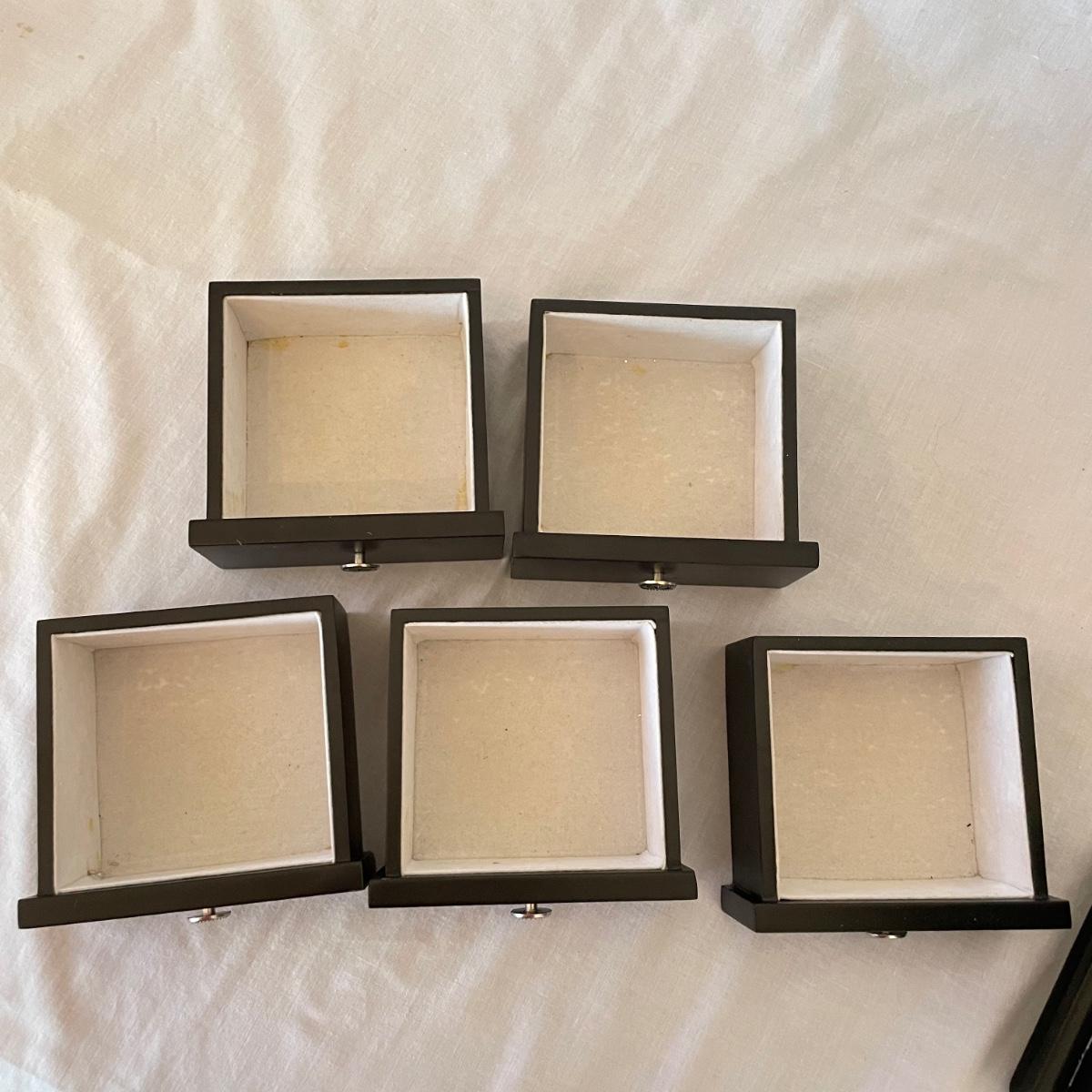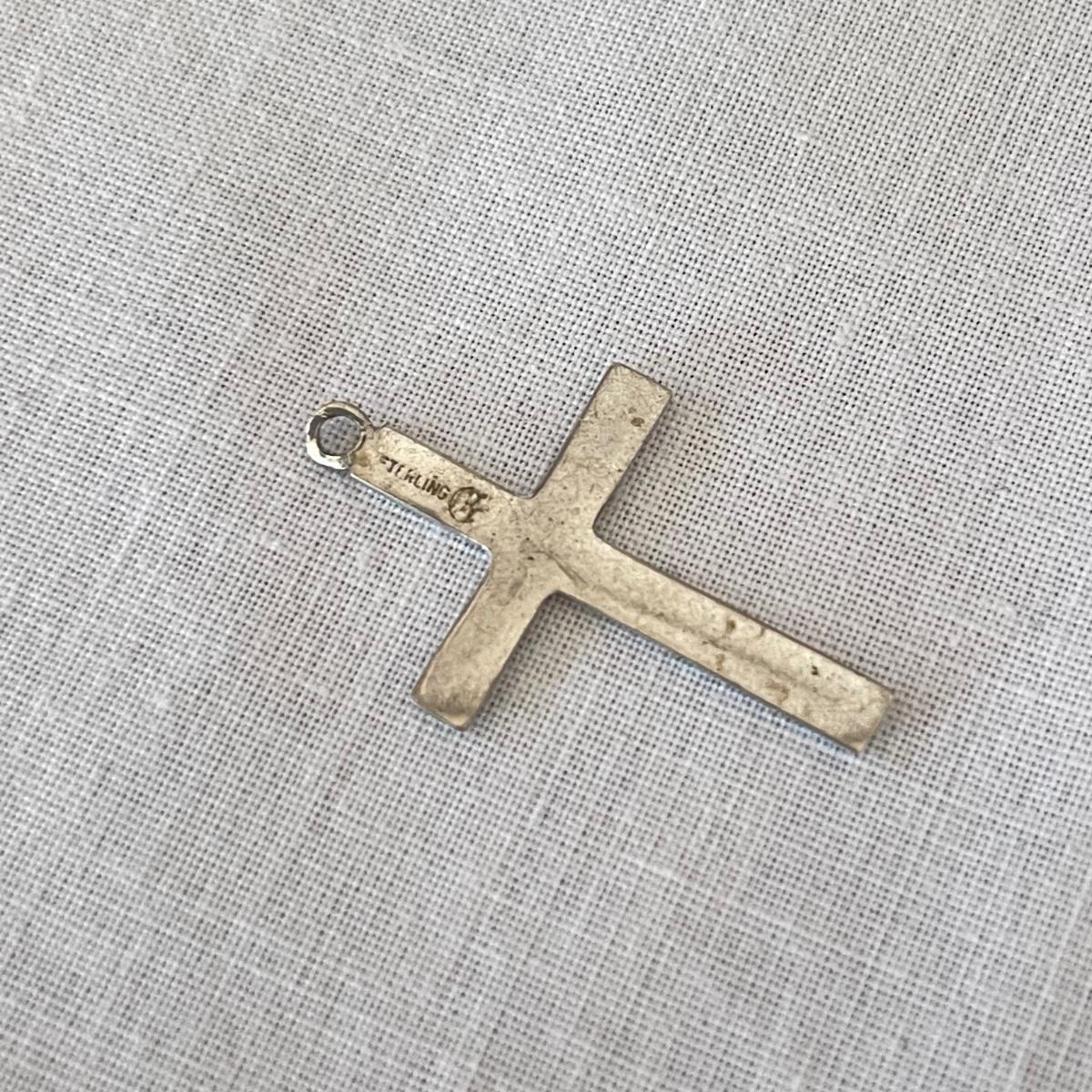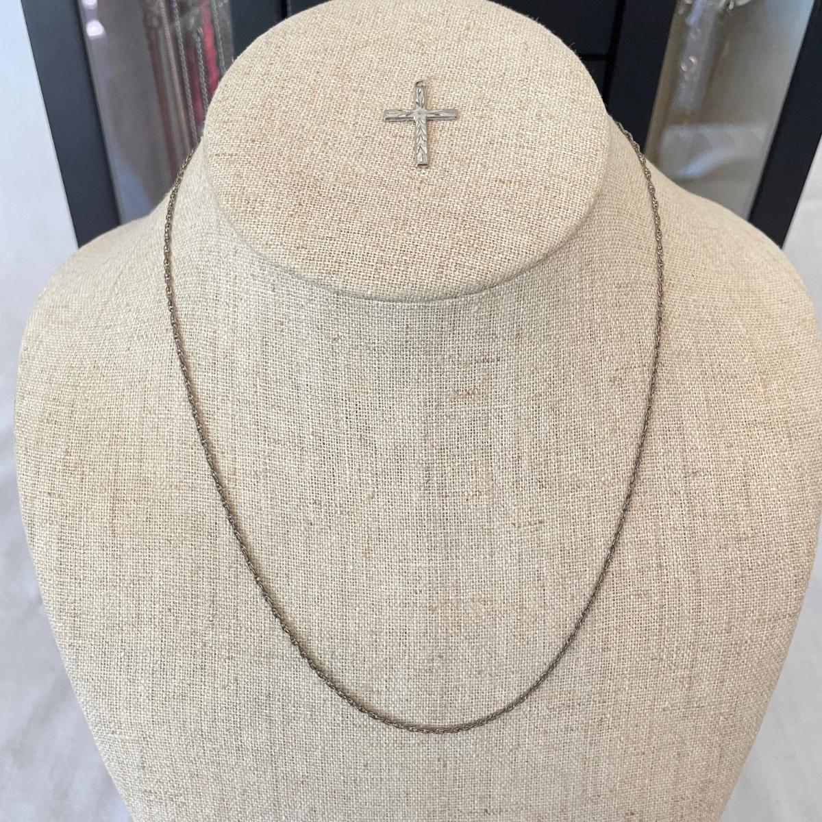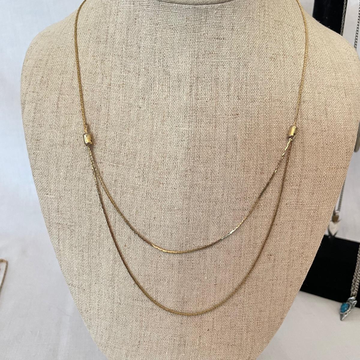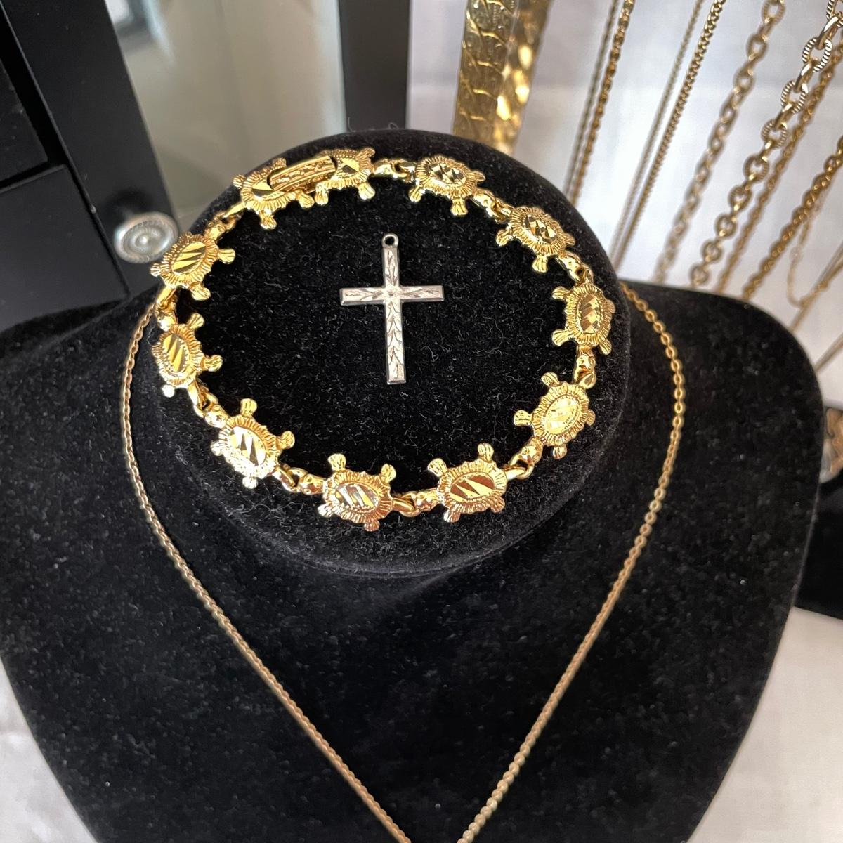 Around 20 chains with a few pendants, bracelet, and jewelry box. The black painted wooden box has five drawers and two 10-pronged necklace racks surrounded by glass windows. The drawers have a few light stains inside. Jewelry box measures 12” x 4.5” x 12”H. Necklaces are silver and gold colored. One is marked Sterling along with the cross pendant. Lot includes a small turtle bracelet. See images. Local pick up only. All sales are final. No returns or refunds. Please bid accordingly.