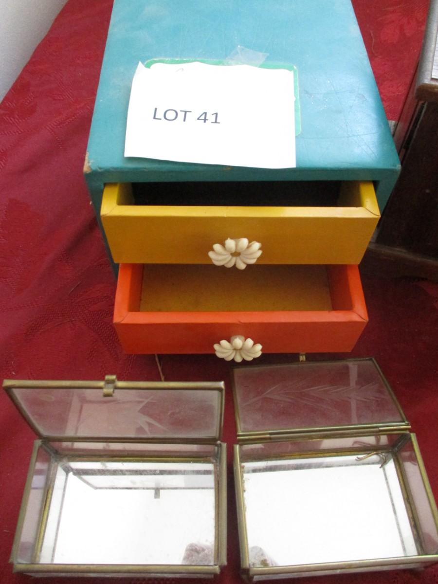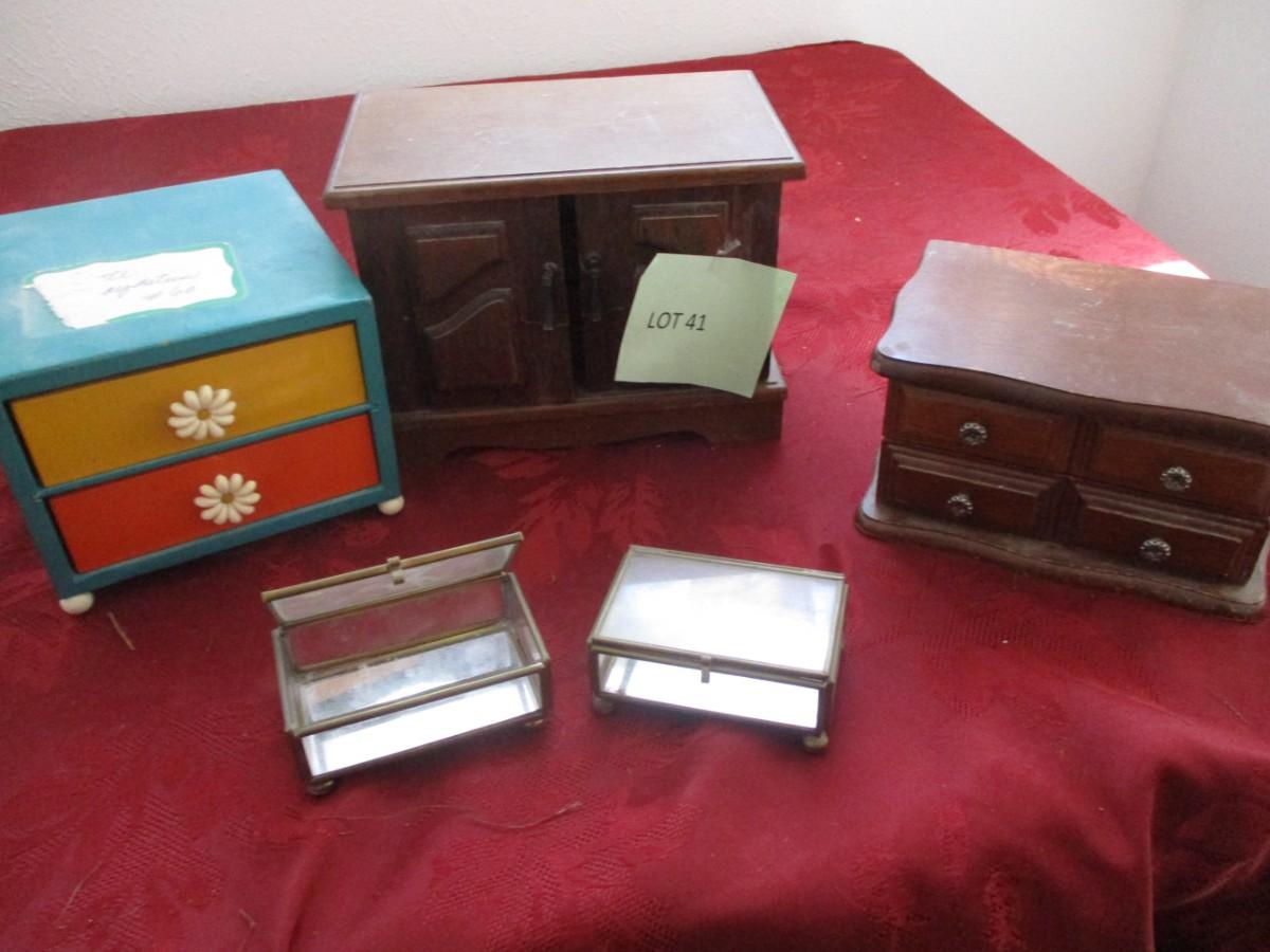 5pc. blue w/Flower Knobs wooden. Small keepsakes glass trinket boxes. Large wooden musical box.