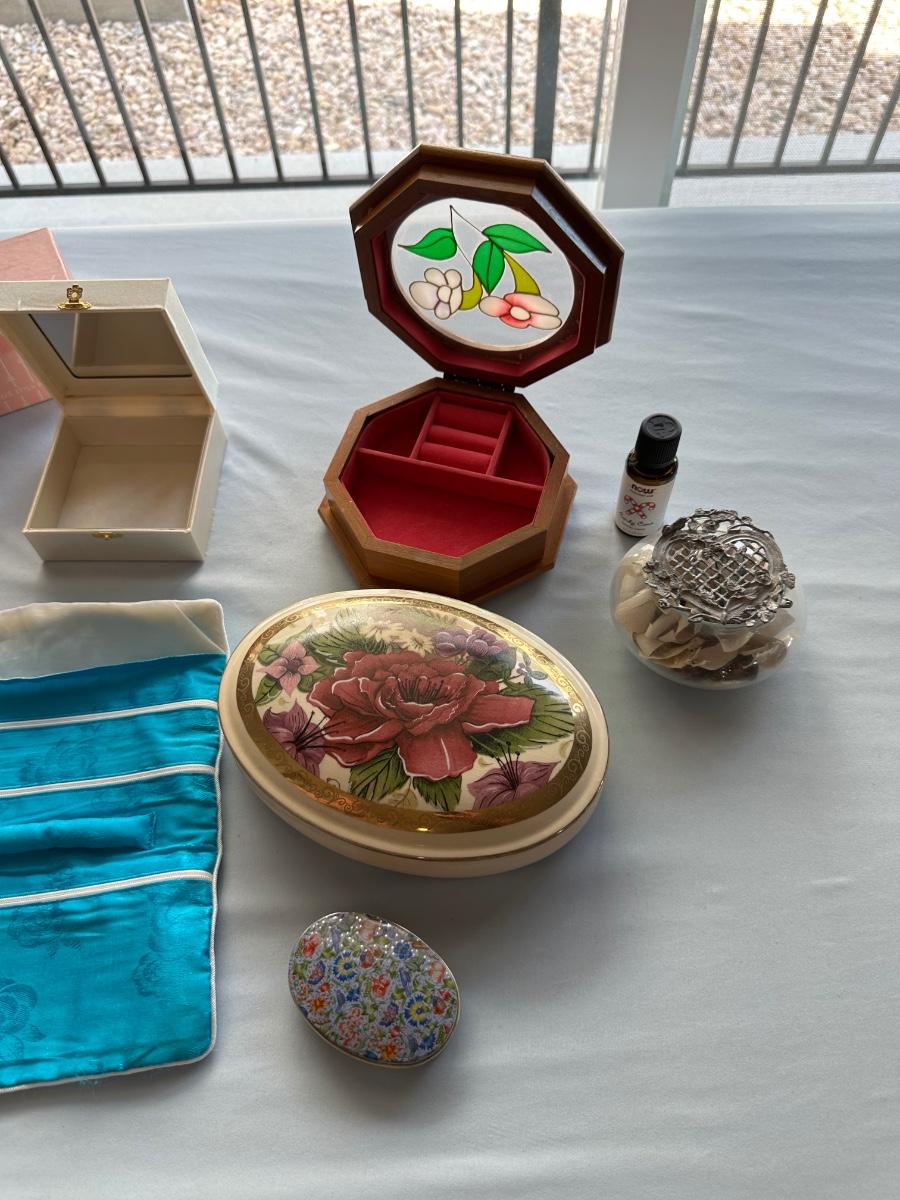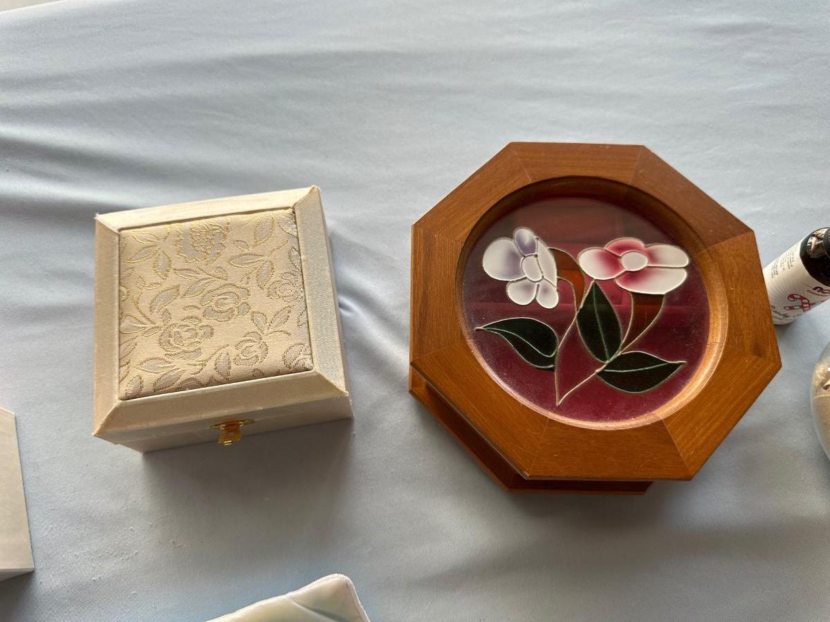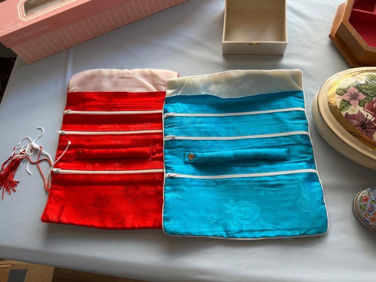 JEWELRY BOXES AND BAGS, ONE IS A MUSIC BOX