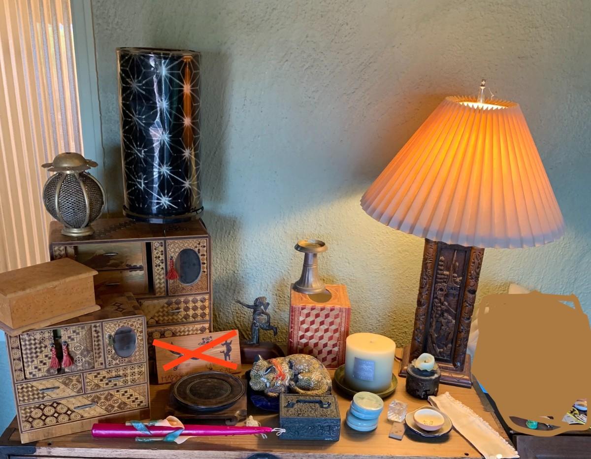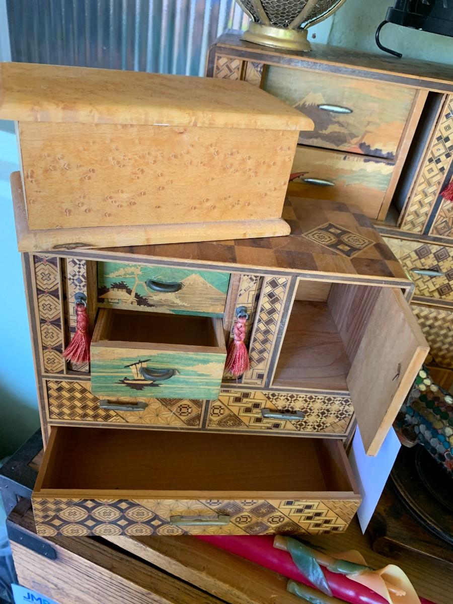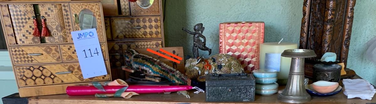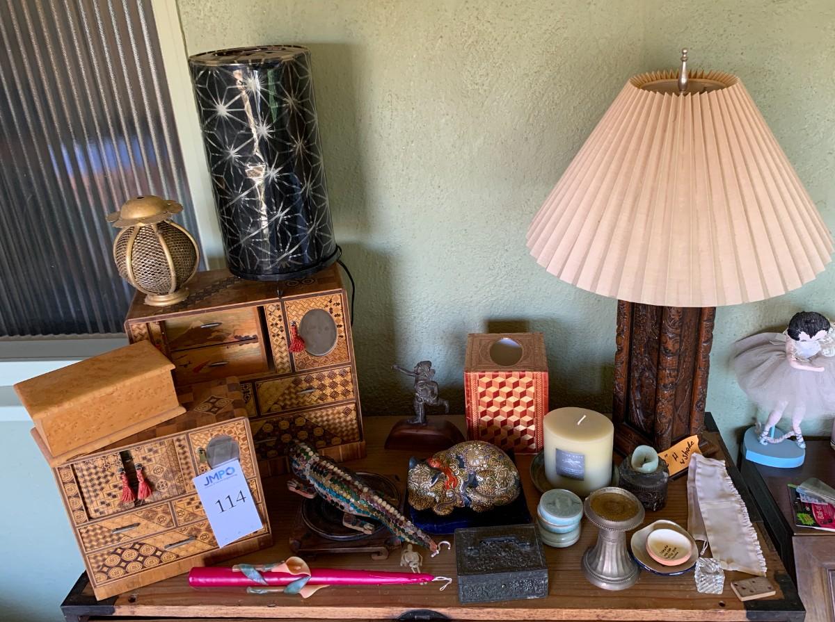 Jewelry boxes, carved lamp and more