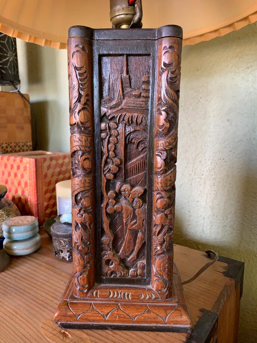 Chinese lamp with carved wood panels, works, 22"h. Assorted decorative pieces. Does not include items to the right of lamp. Does not include any pieces that are marked with red stripes.