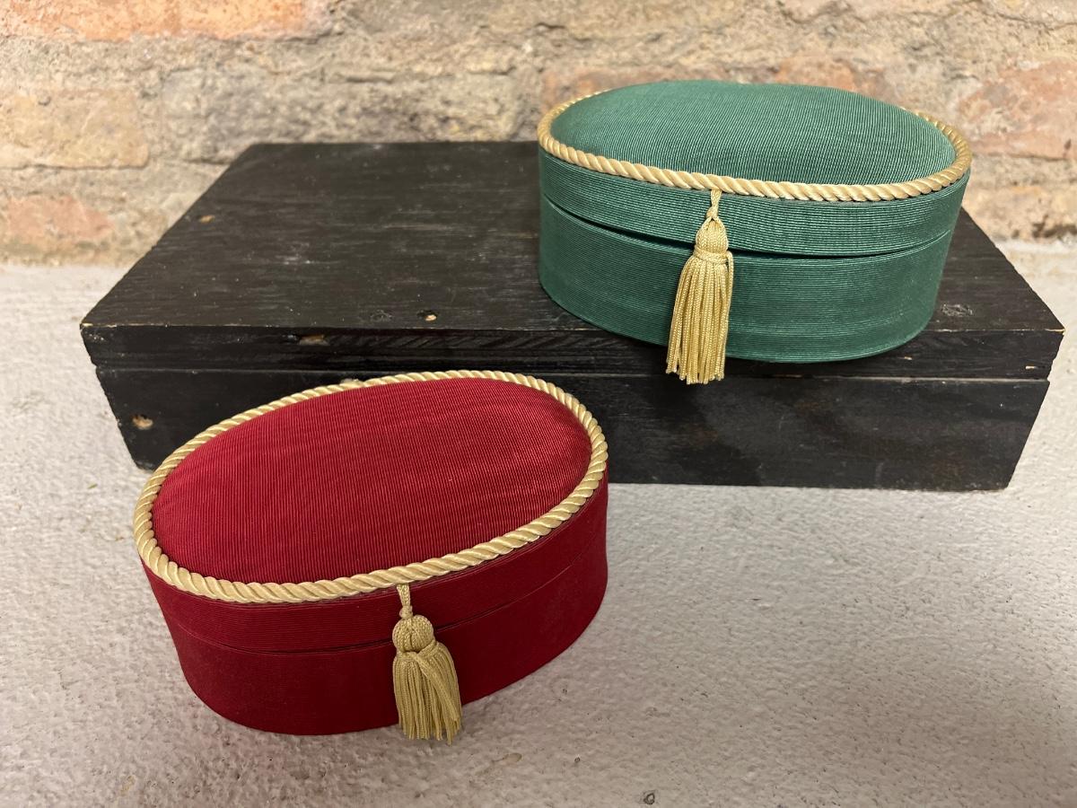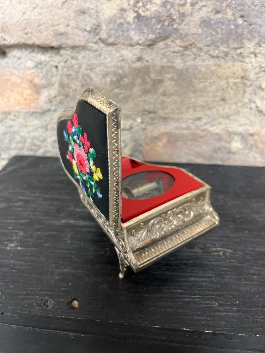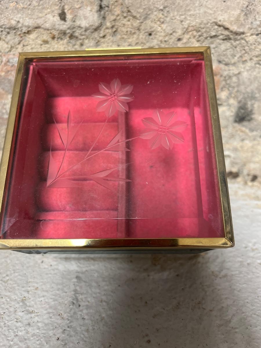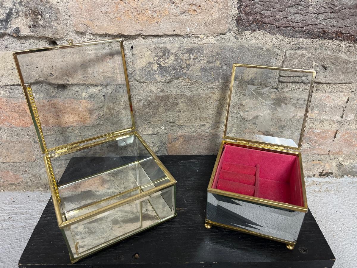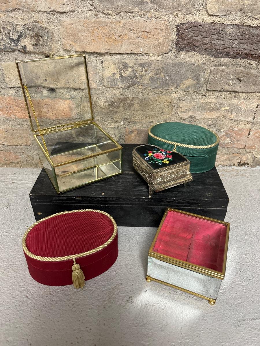 Large glass trinket and glass jewelry box with etched cover, cloth covered jewelry boxes and piano music box that plays “You are Always in My Heart.”