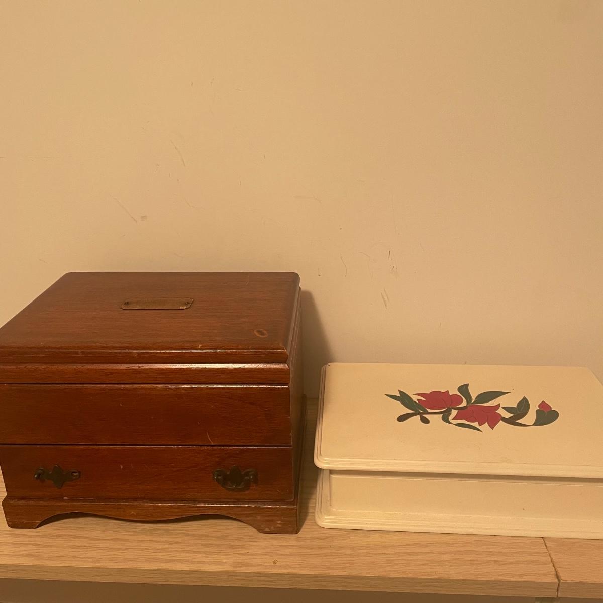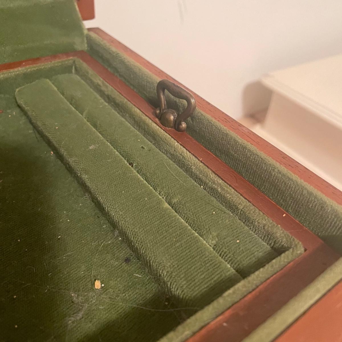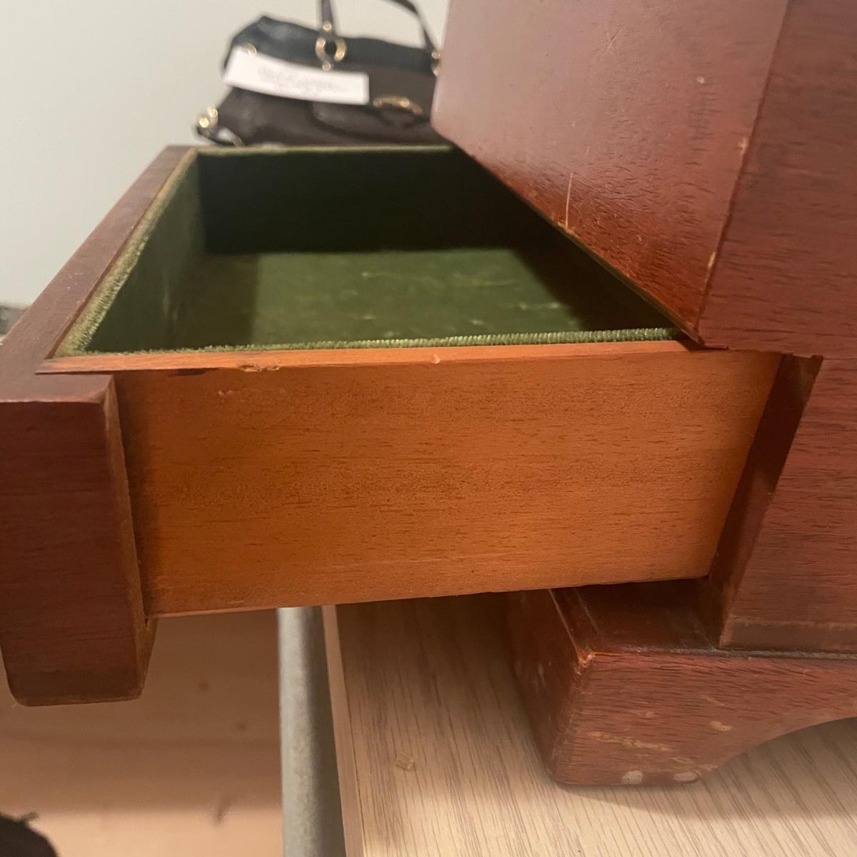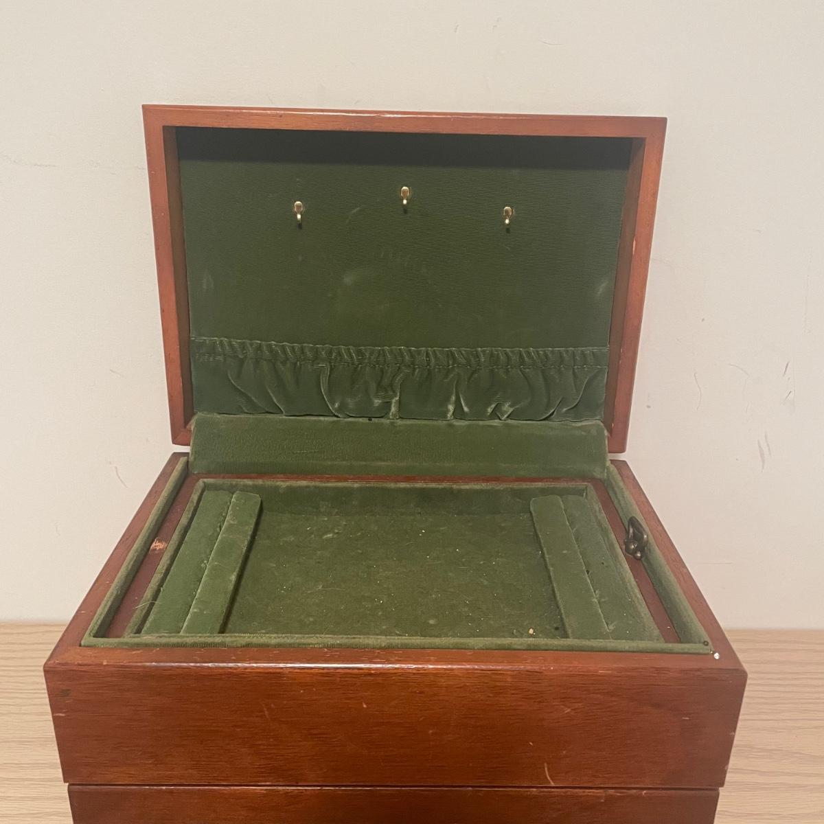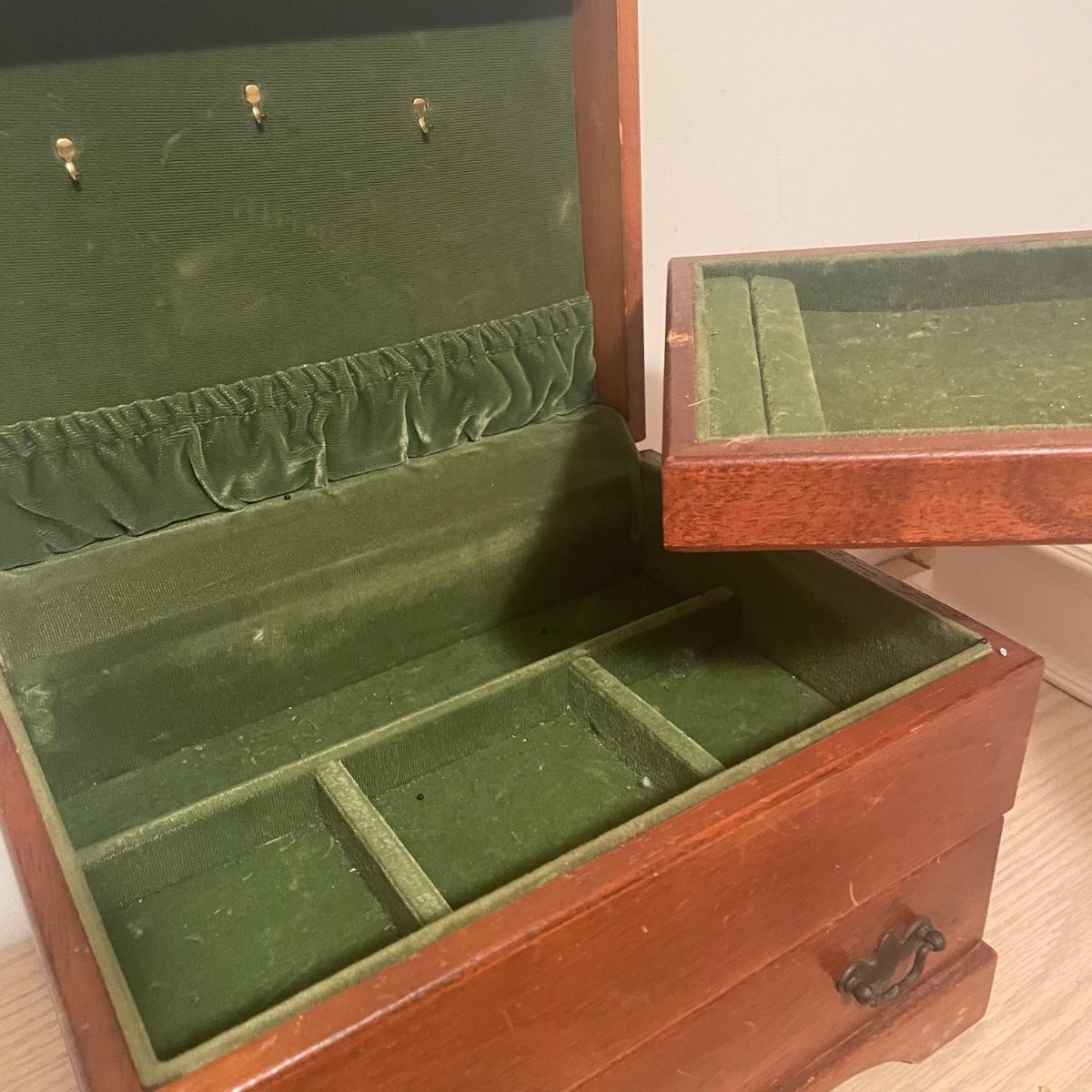 This lovely vintage solid wood jewelry box has a lower drawer and the top opens to a green velvet lined removable tray (note one piece of hardware is missing). Underneath the tray is more storage. One handle on the drawer is broken, but is included. As you will see from images, the handle is missing one small section, box is in otherwise good condition. A second white box with very clean pink velvet lining is included. This box has a small chip on the corner.