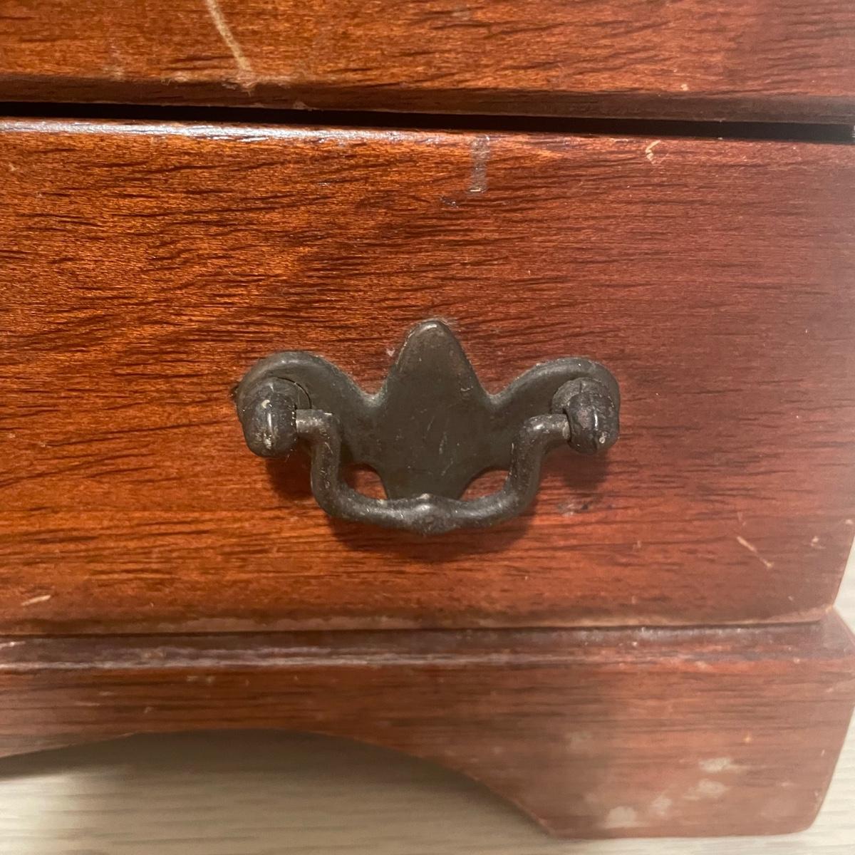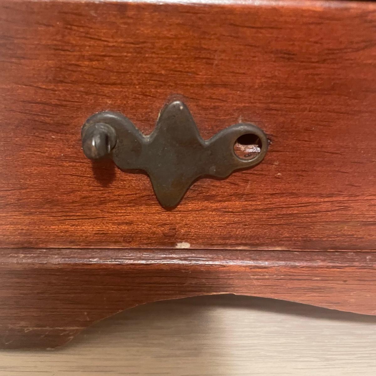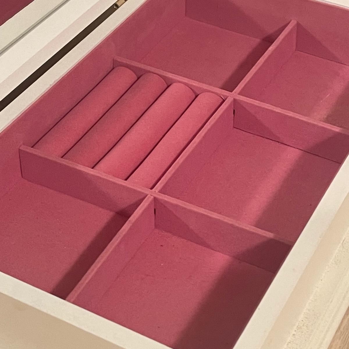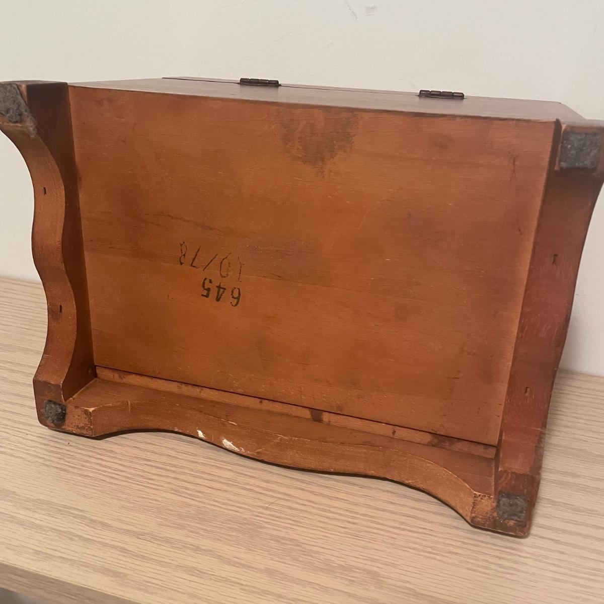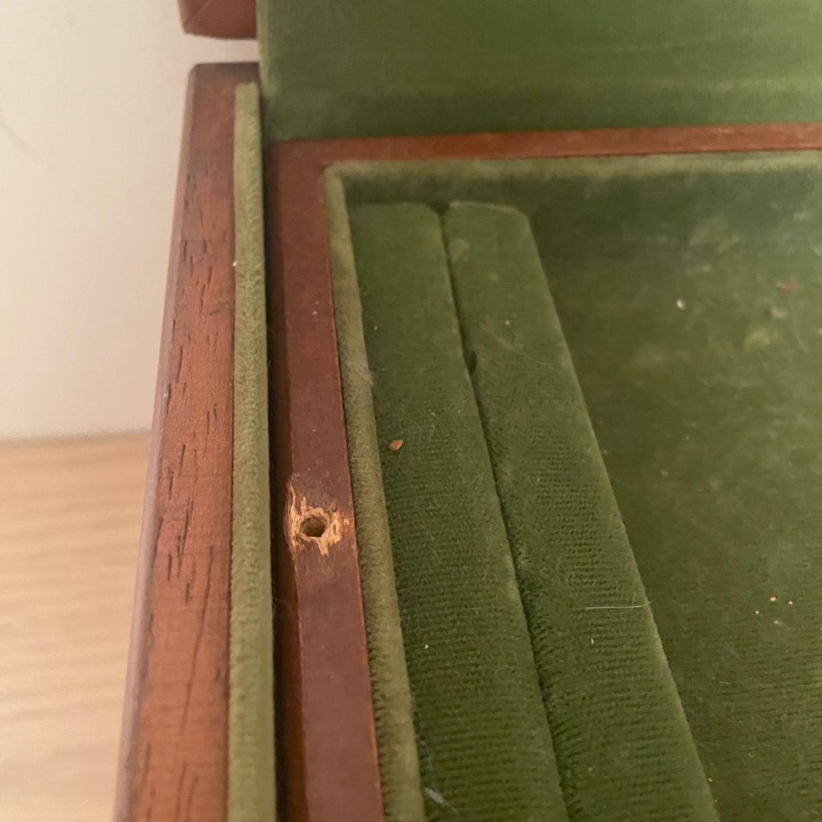 This lovely vintage solid wood jewelry box has a lower drawer and the top opens to a green velvet lined removable tray (note one piece of hardware is missing). Underneath the tray is more storage. One handle on the drawer is broken, but is included. As you will see from images, the handle is missing one small section, box is in otherwise good condition. A second white box with very clean pink velvet lining is included. This box has a small chip on the corner.