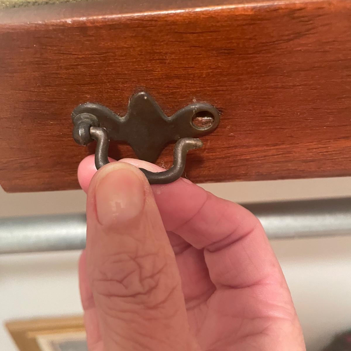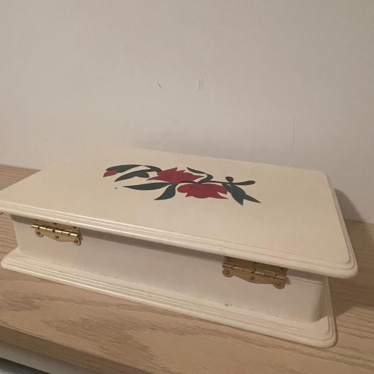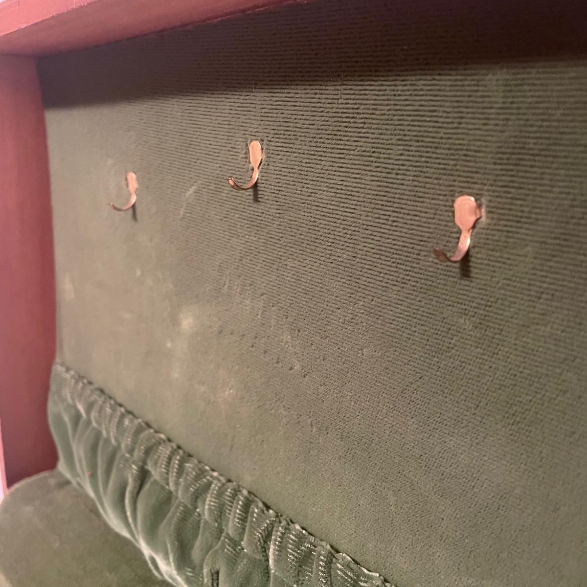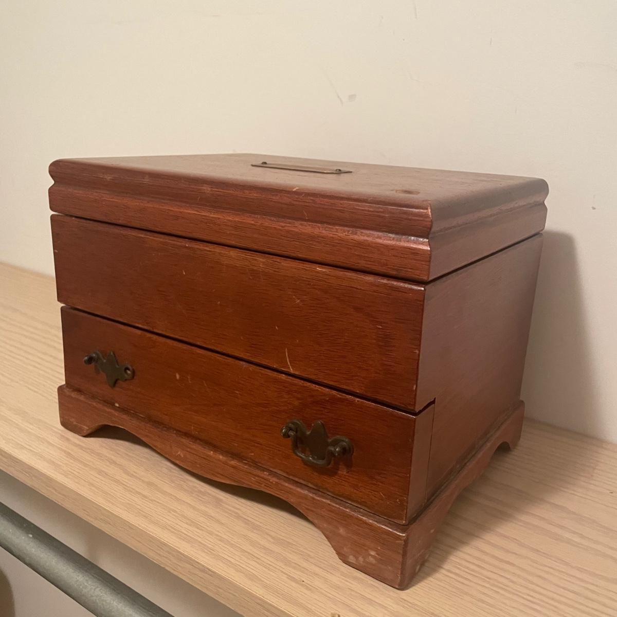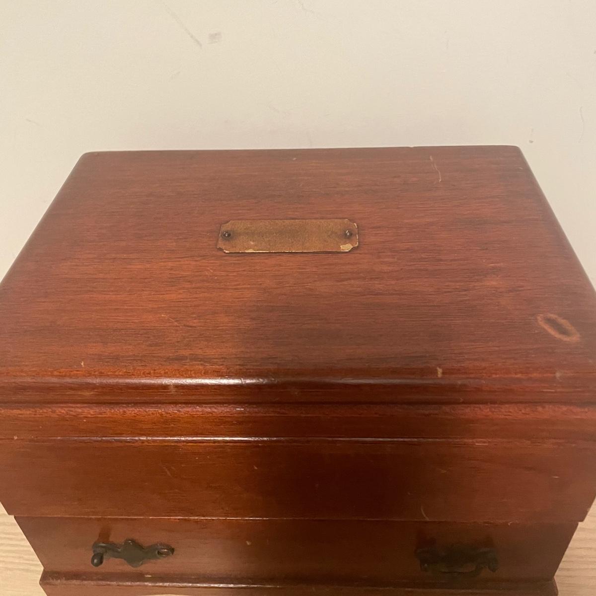 This lovely vintage solid wood jewelry box has a lower drawer and the top opens to a green velvet lined removable tray (note one piece of hardware is missing). Underneath the tray is more storage. One handle on the drawer is broken, but is included. As you will see from images, the handle is missing one small section, box is in otherwise good condition. A second white box with very clean pink velvet lining is included. This box has a small chip on the corner.
