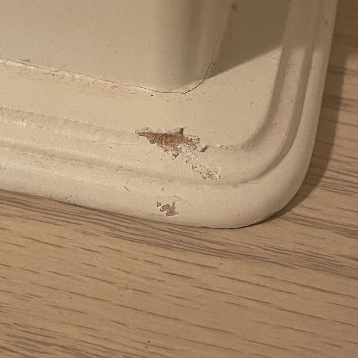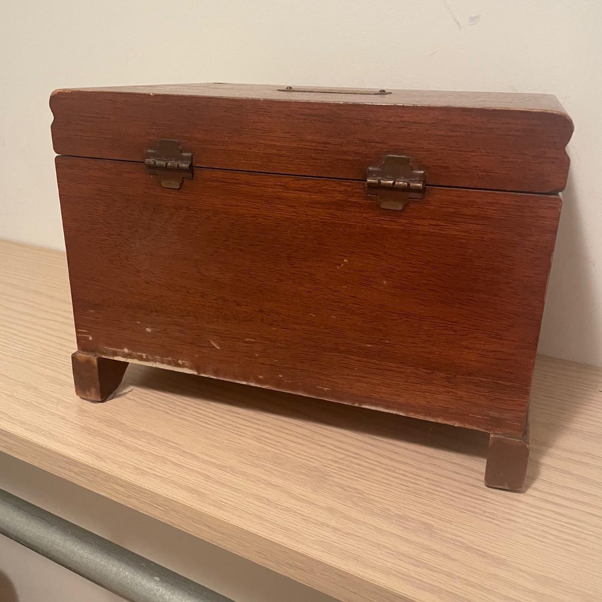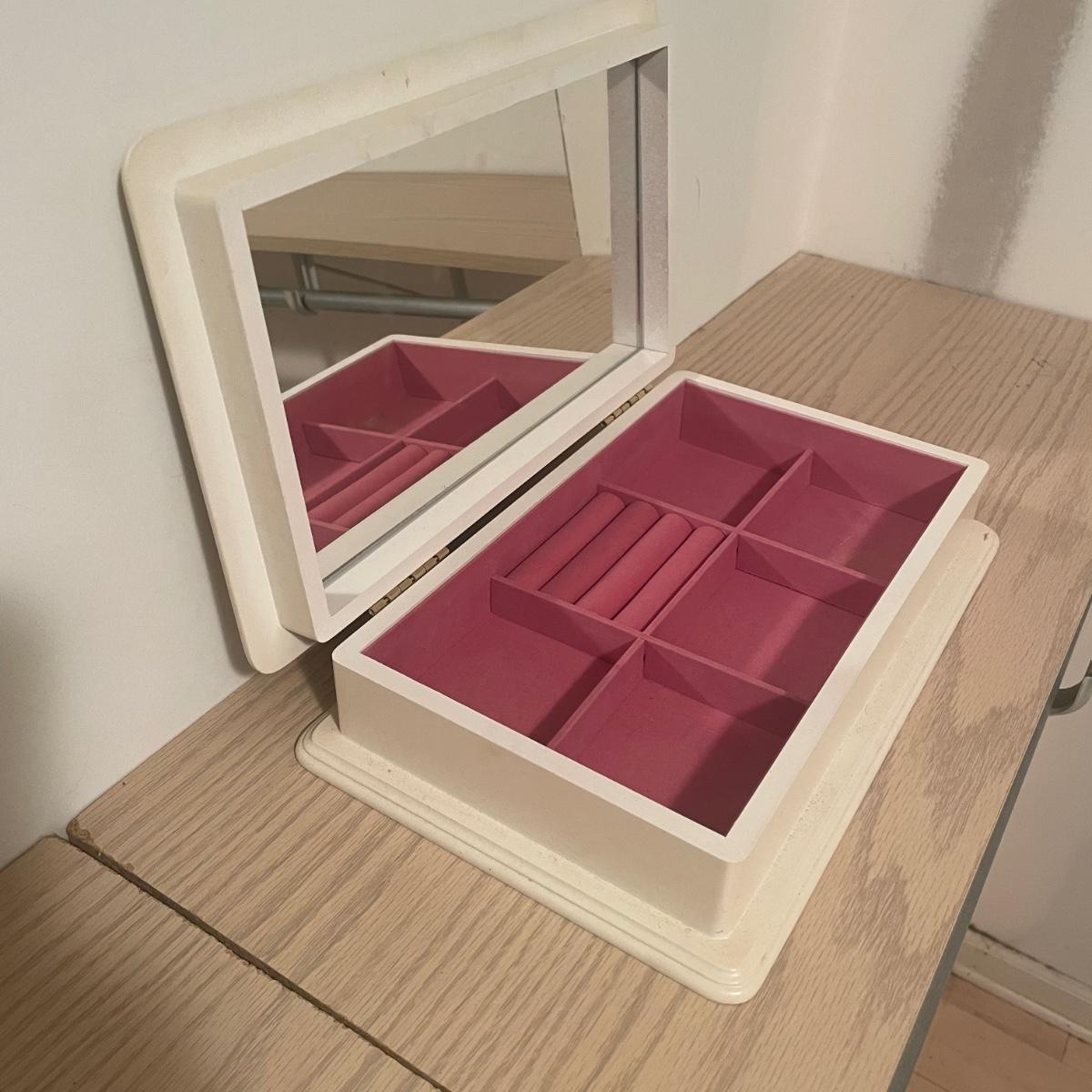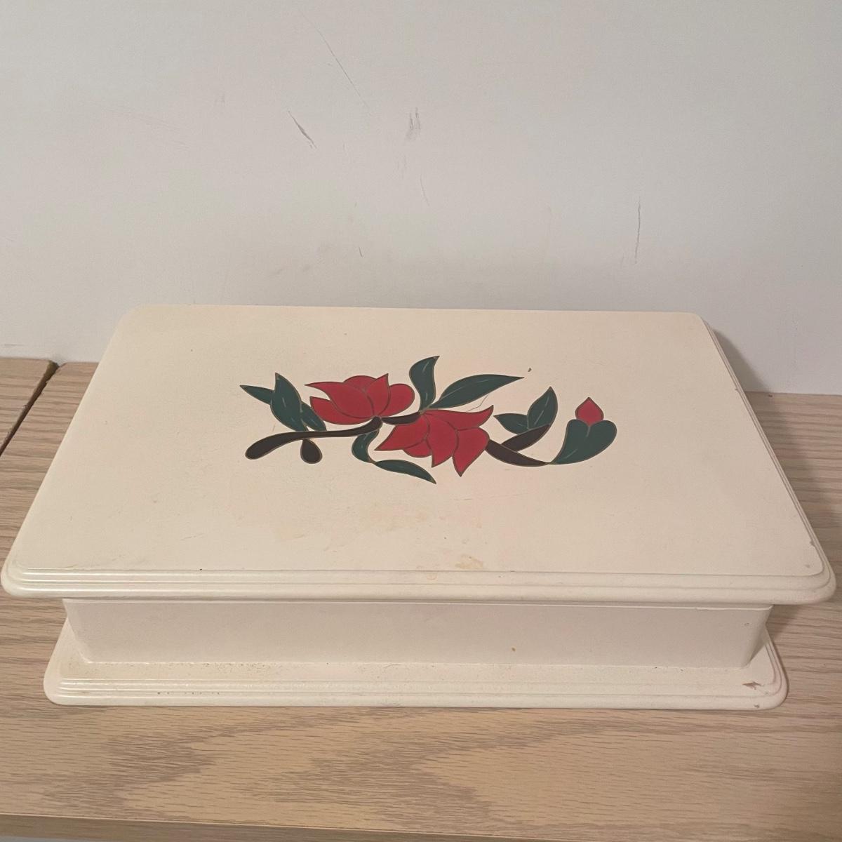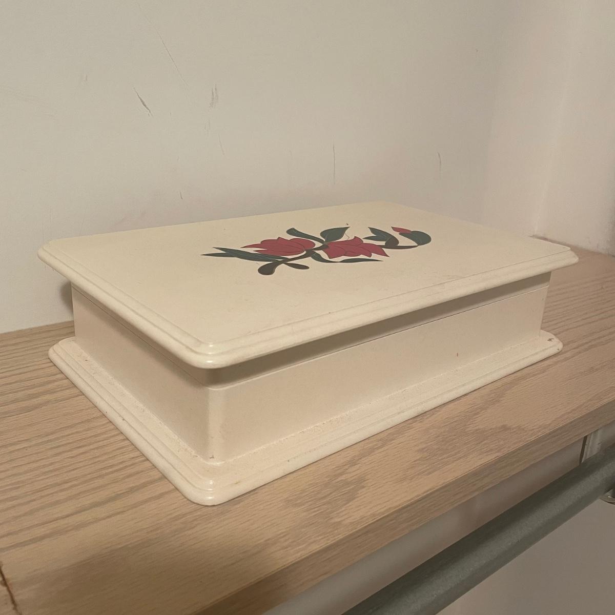 This lovely vintage solid wood jewelry box has a lower drawer and the top opens to a green velvet lined removable tray (note one piece of hardware is missing). Underneath the tray is more storage. One handle on the drawer is broken, but is included. As you will see from images, the handle is missing one small section, box is in otherwise good condition. A second white box with very clean pink velvet lining is included. This box has a small chip on the corner.