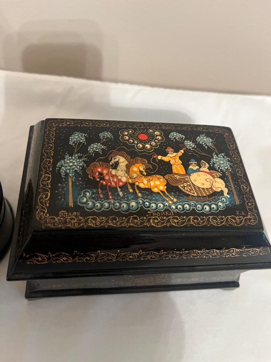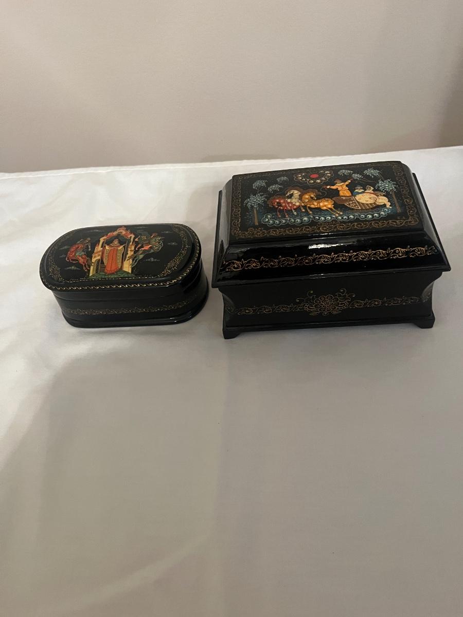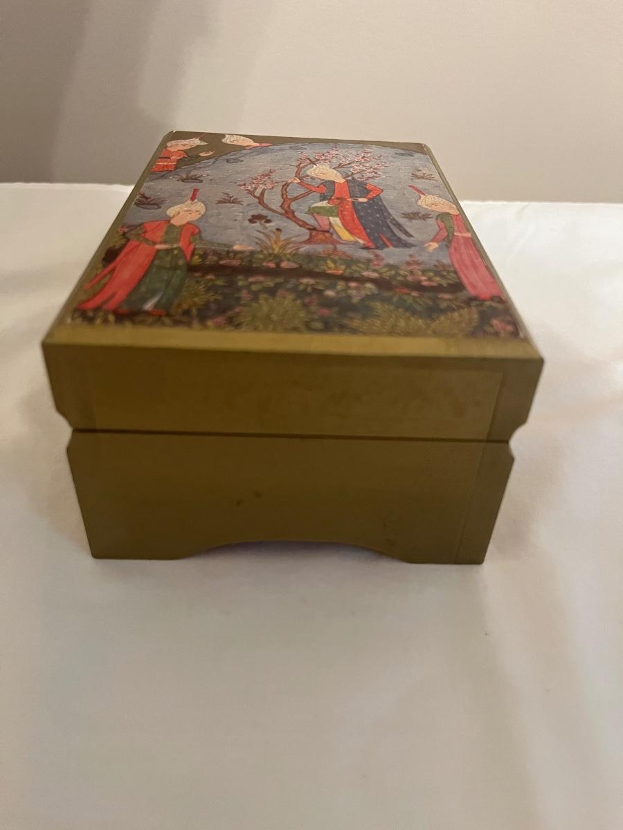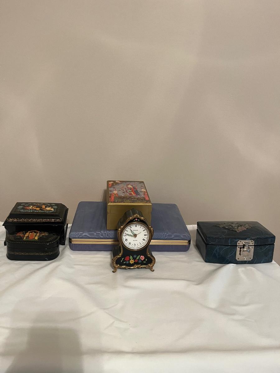 Lot includes three enameled boxes, Reuge wooden music box, clock with plastic body and a fabric covered jewelry box that measures 10” x 7” x 2”H. Music box worked when wound and clock was not tested.