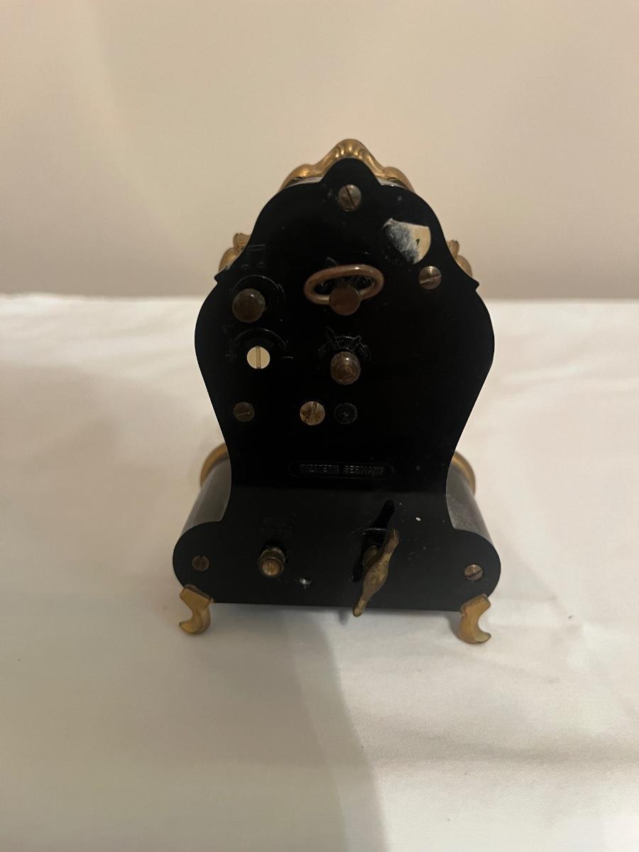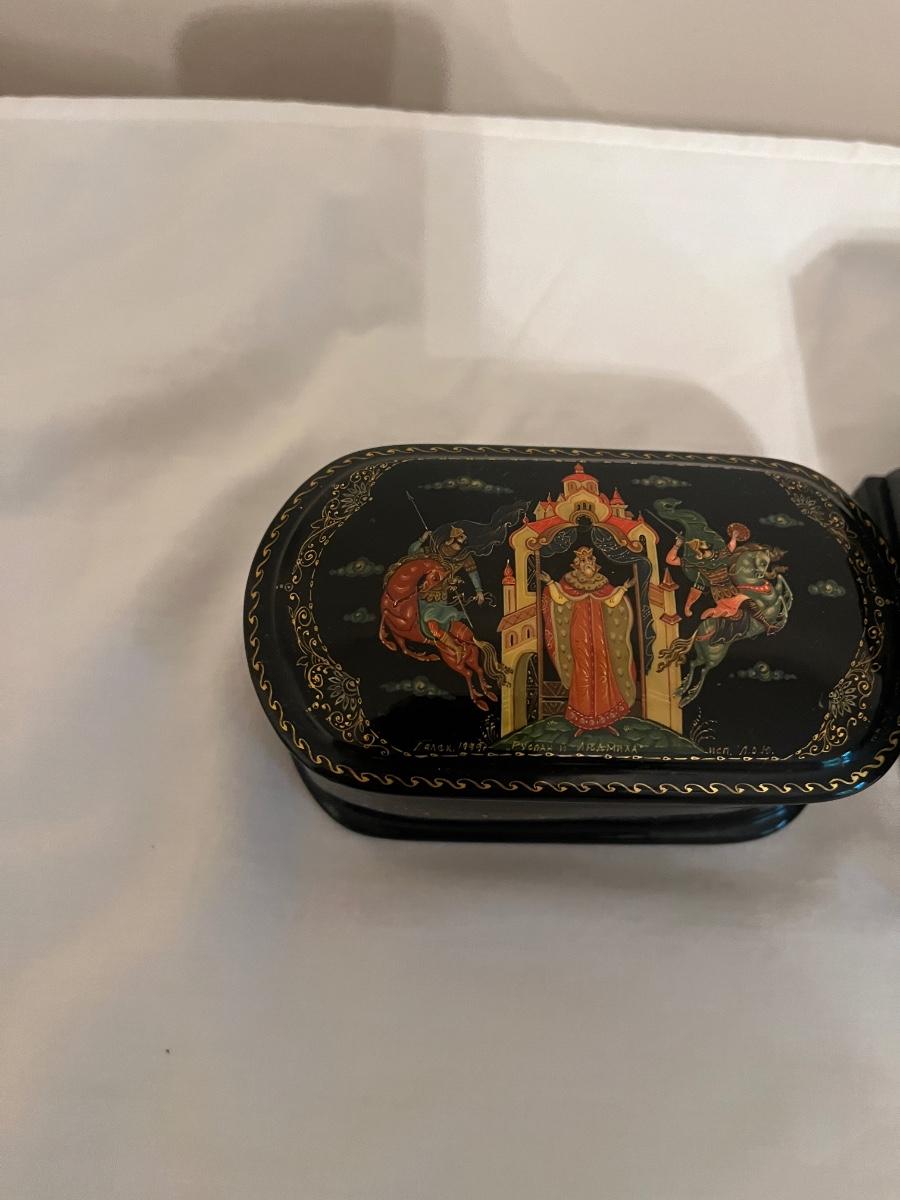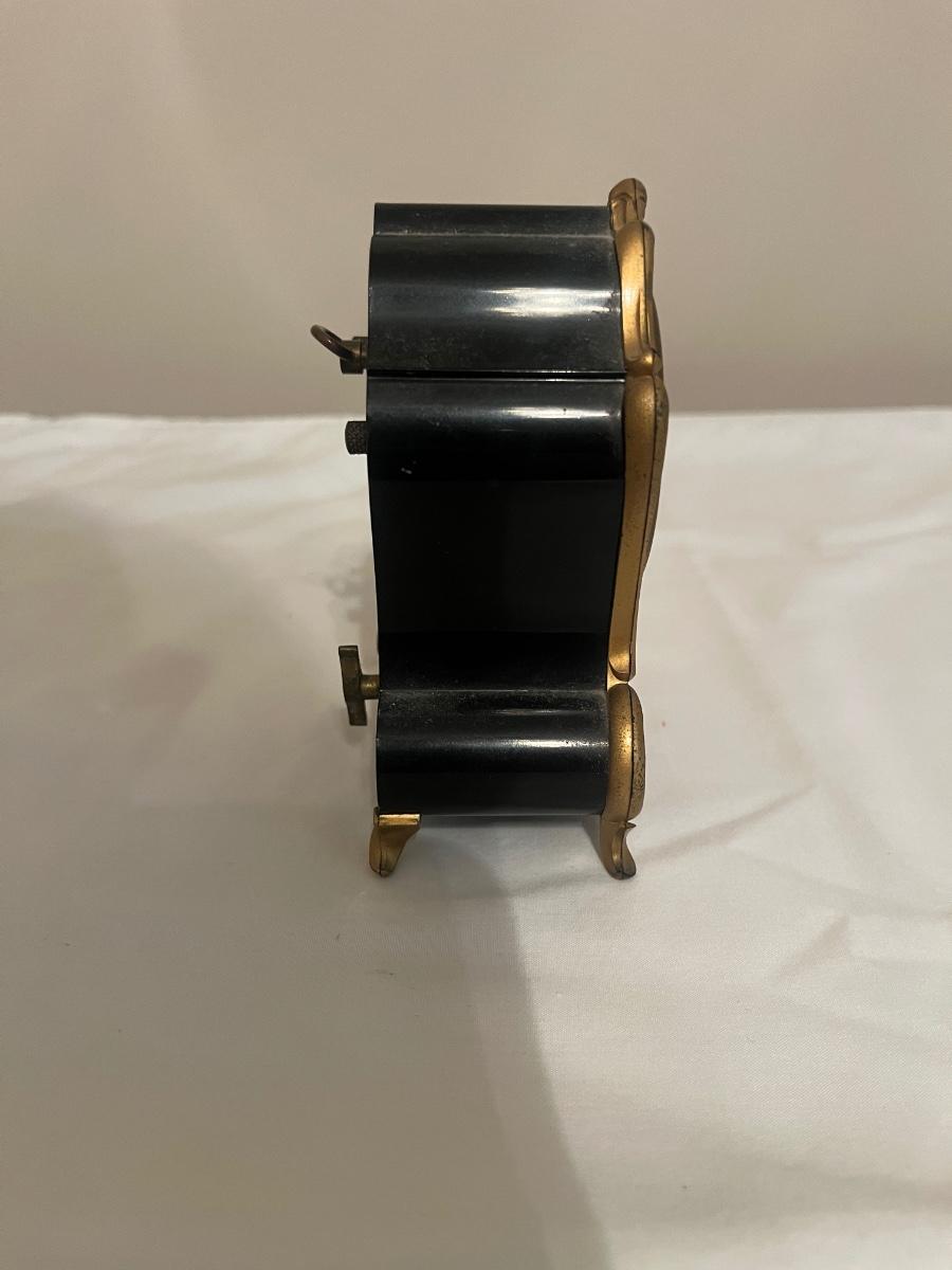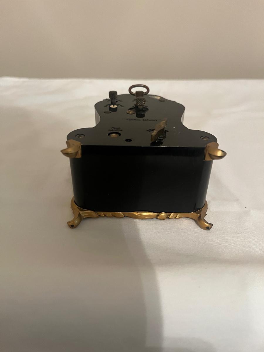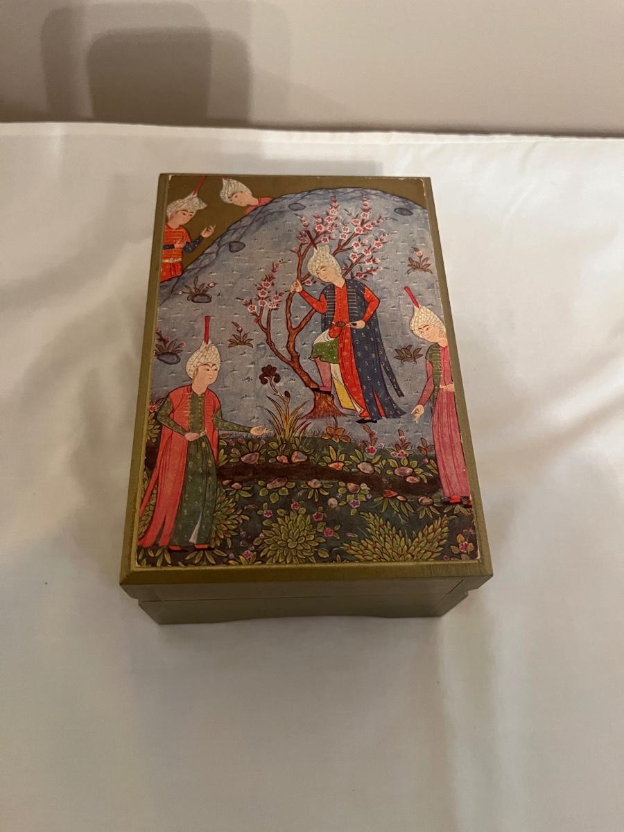 Lot includes three enameled boxes, Reuge wooden music box, clock with plastic body and a fabric covered jewelry box that measures 10” x 7” x 2”H. Music box worked when wound and clock was not tested.