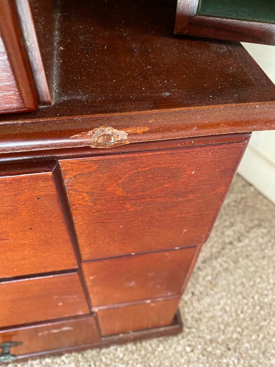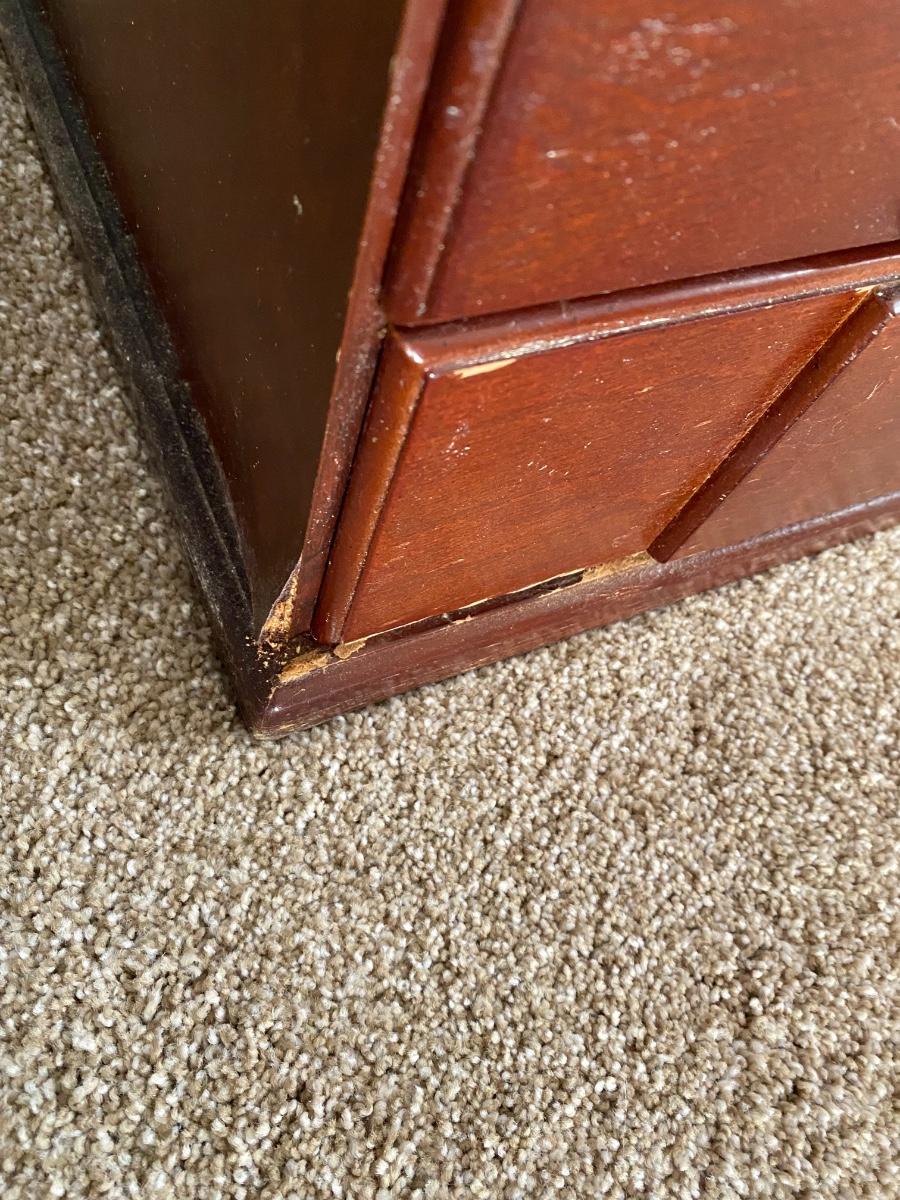 Some scuffs to the wood at the base. As is.