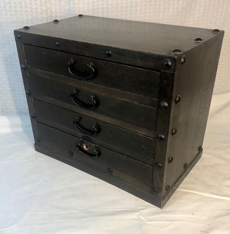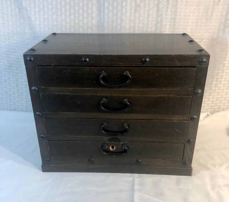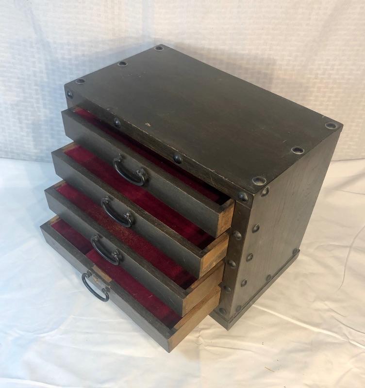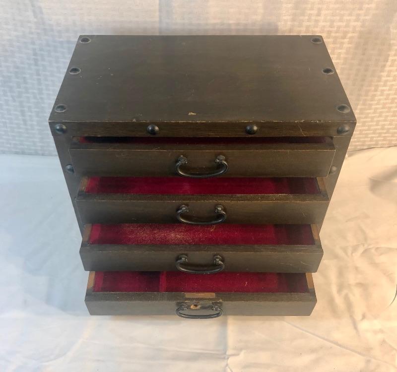 4-drawer jewelry case. Dark wood. Red felt lining inside drawers.