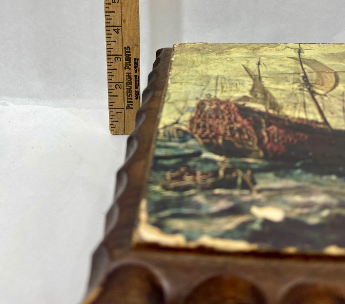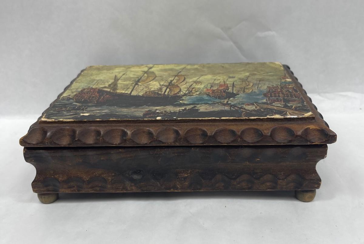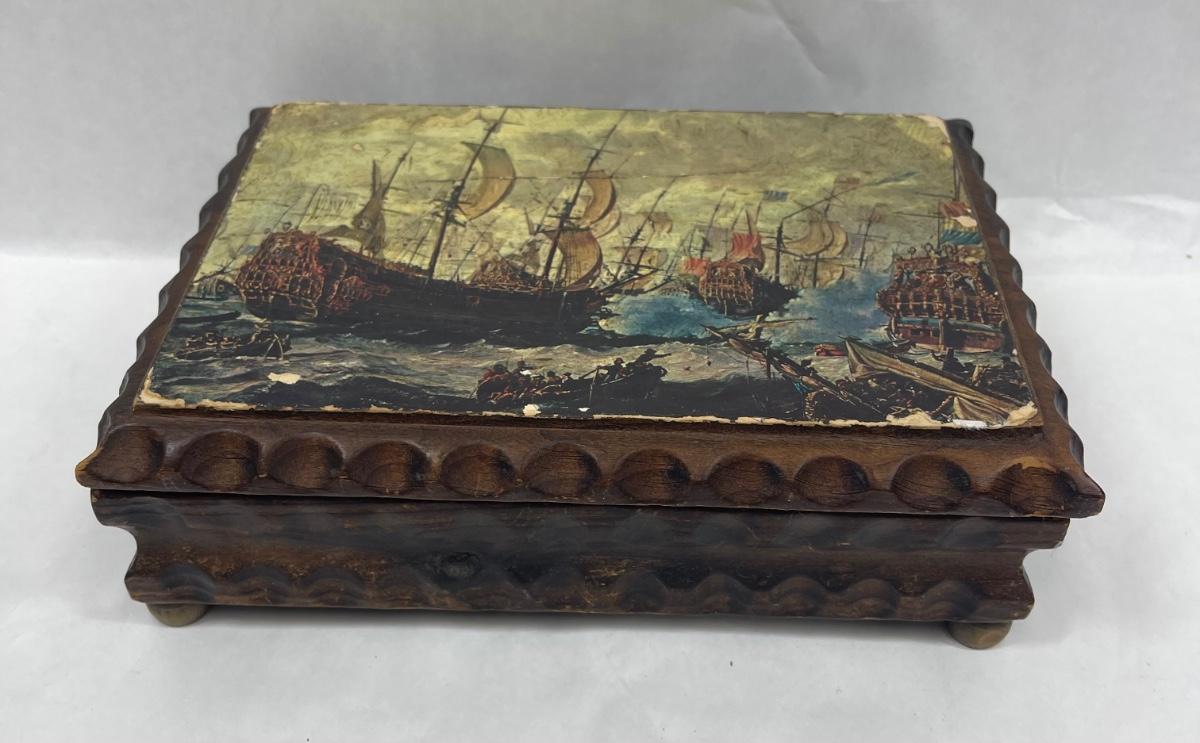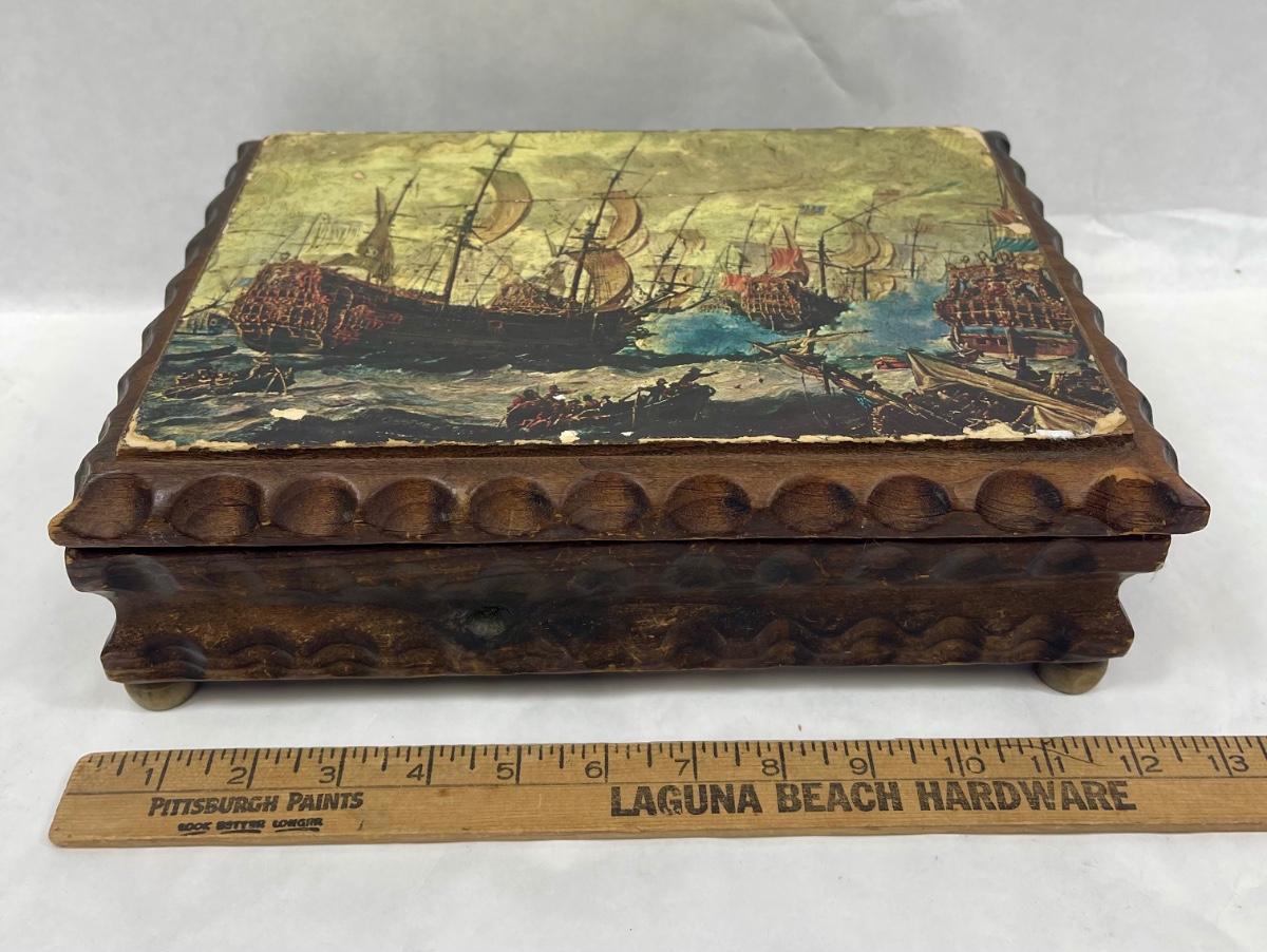 Vintage Carved Wood Hinged Box Jewelry Chest Sailing Ship image Nautical Decor