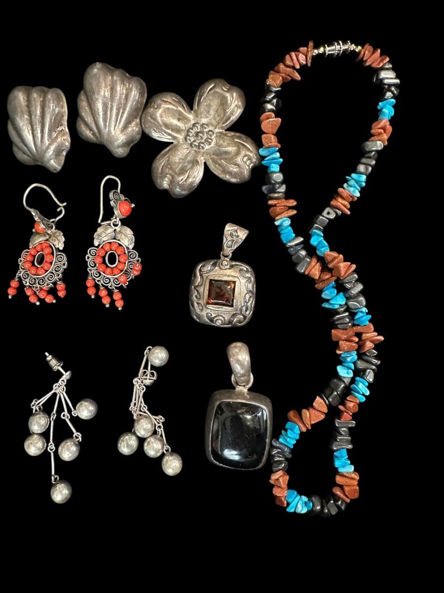Jewelry Sterling Lot w/ Earrings and turquoise cap necklace.