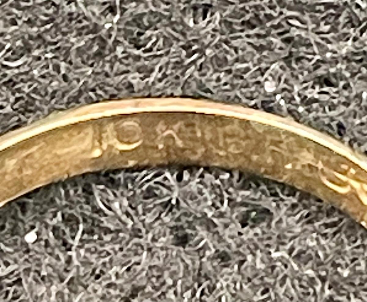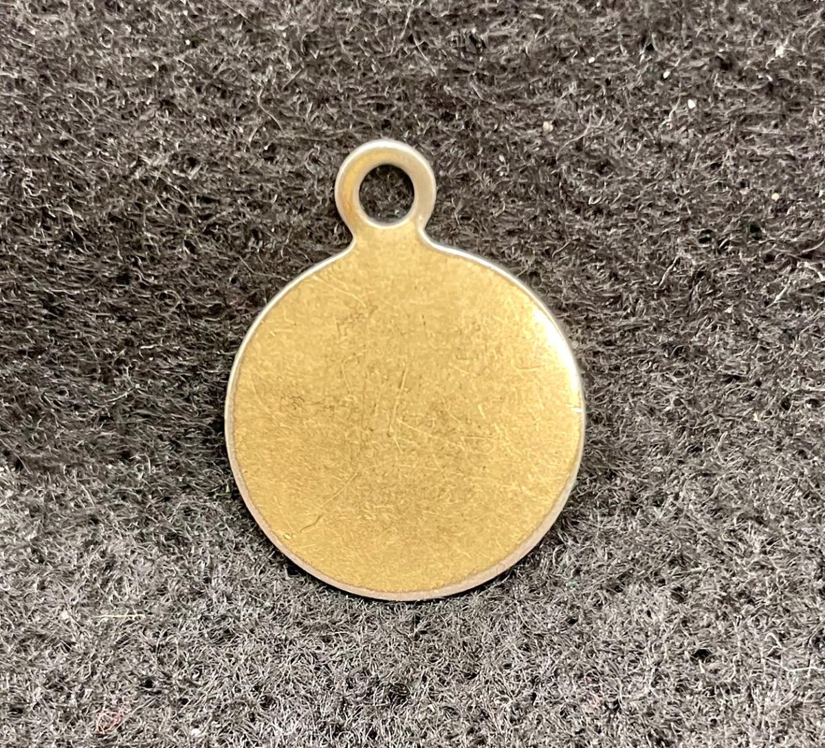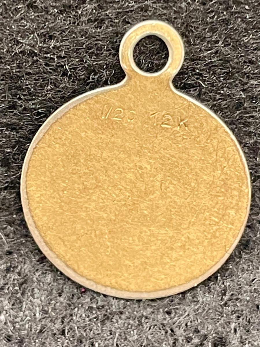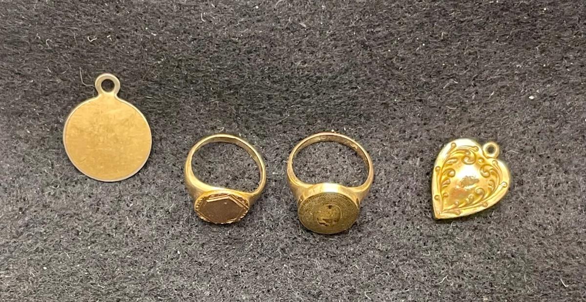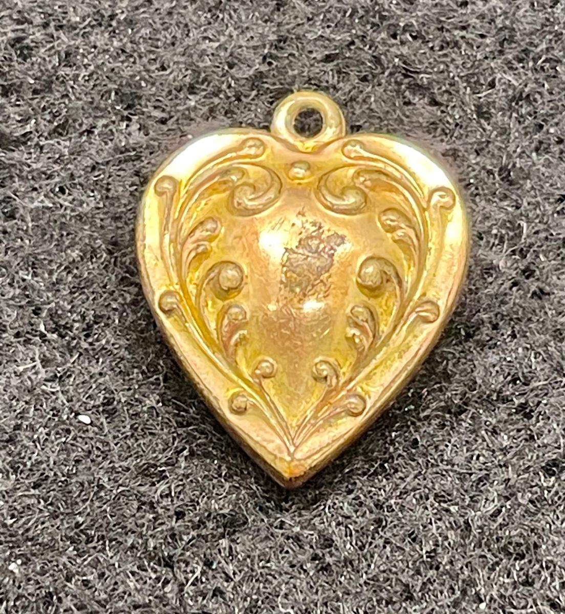 Both rings are marked 10K GF. The solid disc charm is marked 1/20 12K. The heart has no markings.