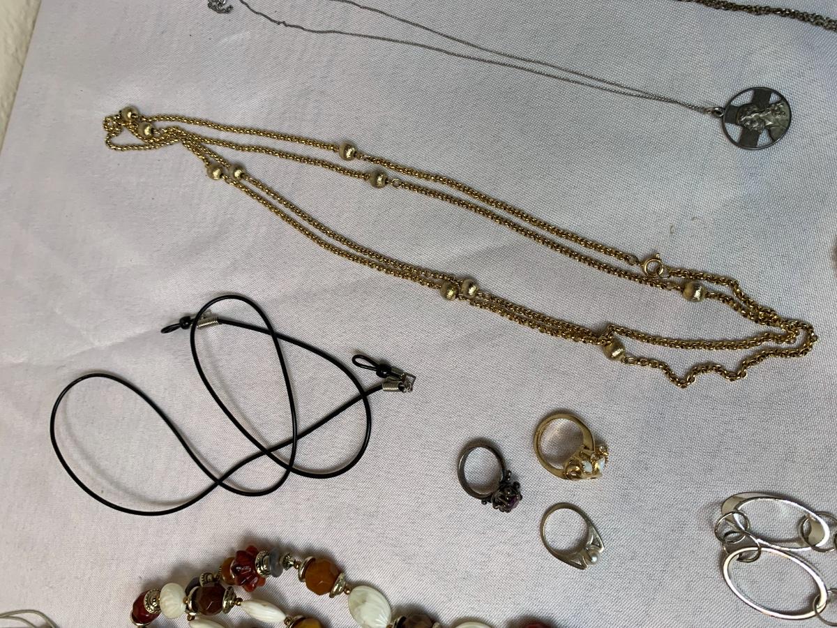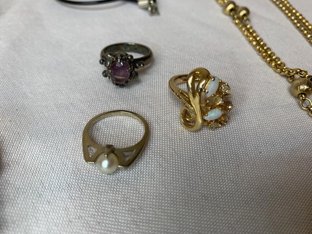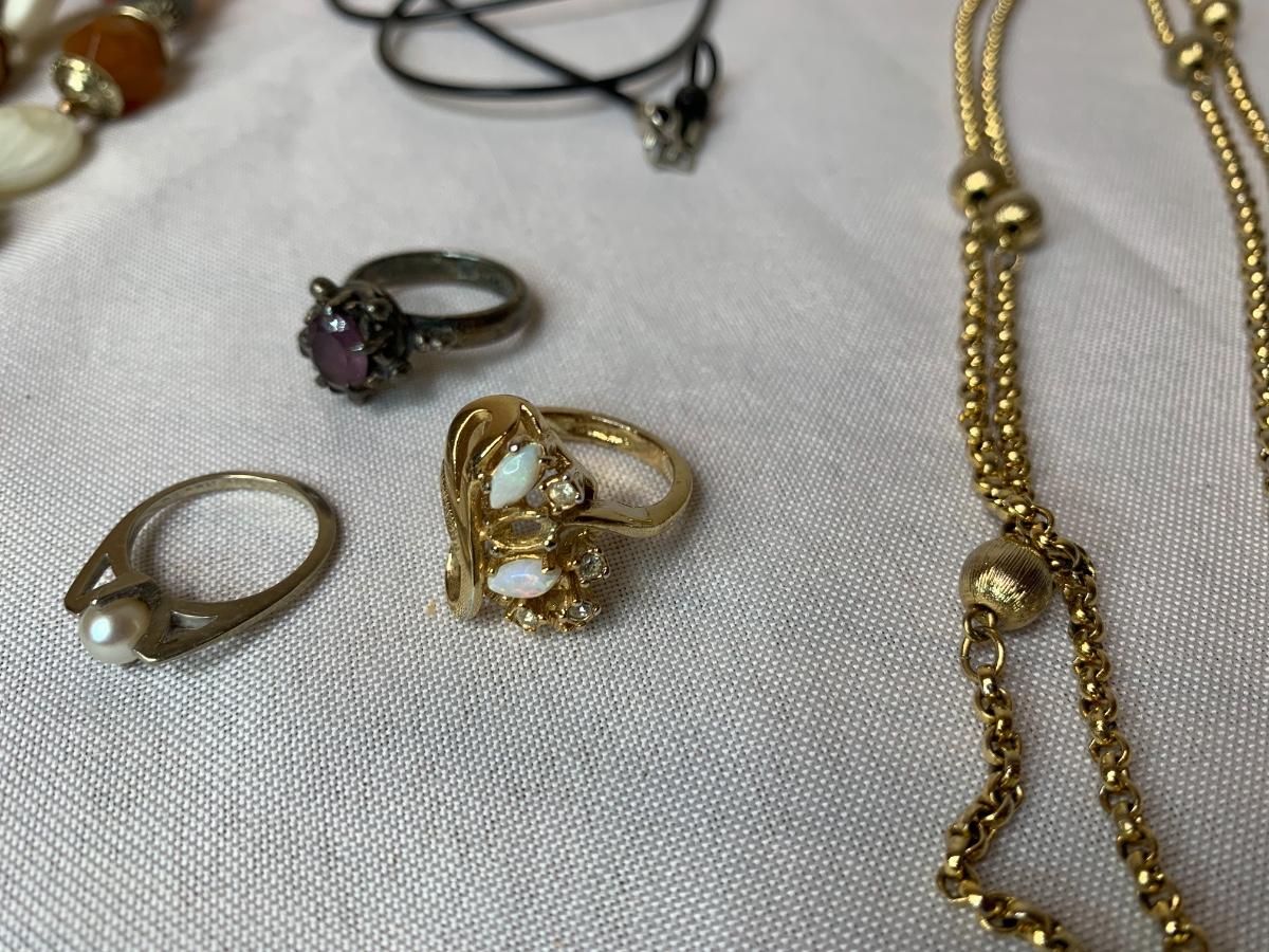 Mostly costume pieces. Does include a silver ring with purple stone marked 925, a white gold ring with pearl marked 10Kt and a third ring that has gold color, unable to read the stamp - appears to have opals and diamonds (one opal missing from setting).