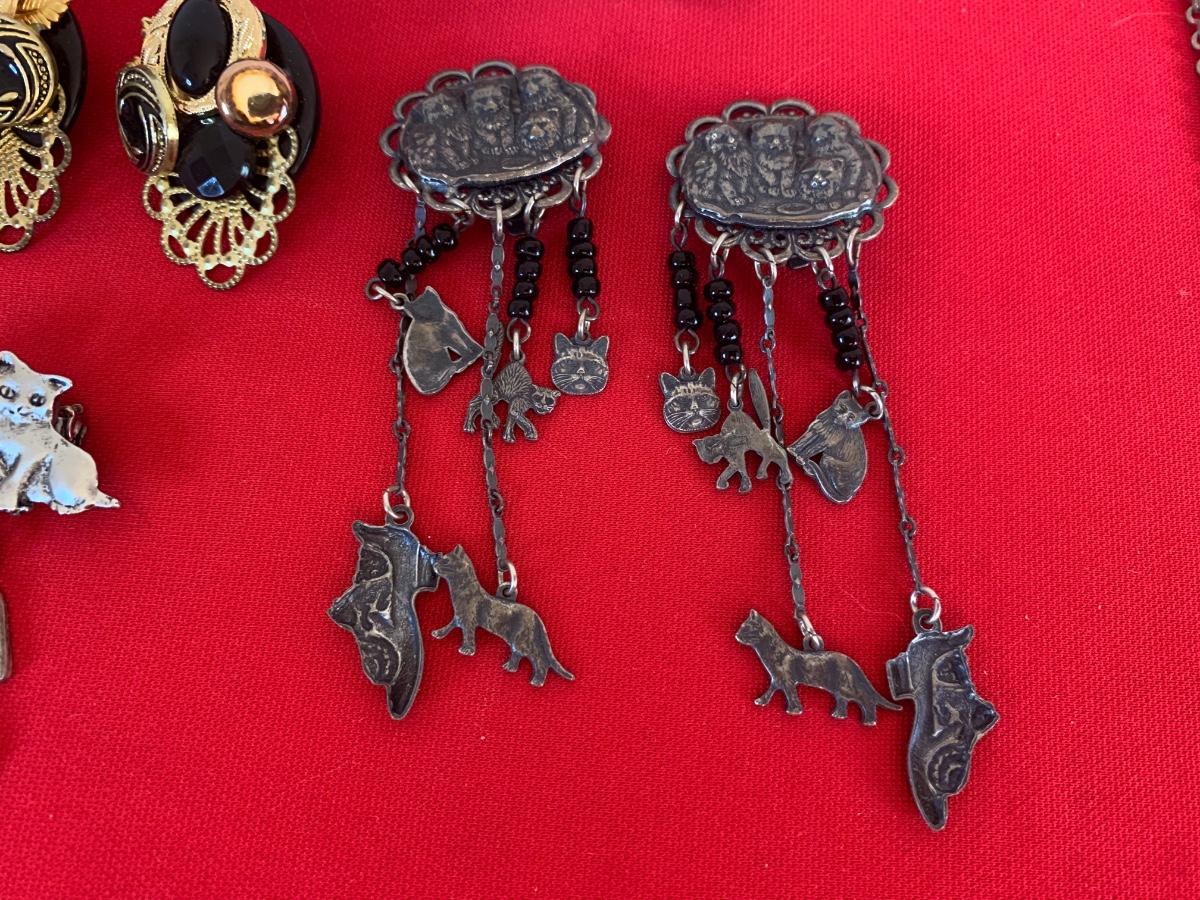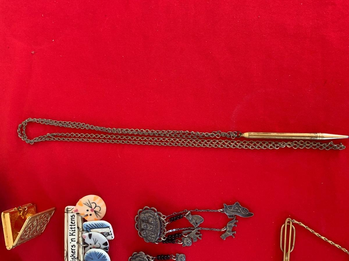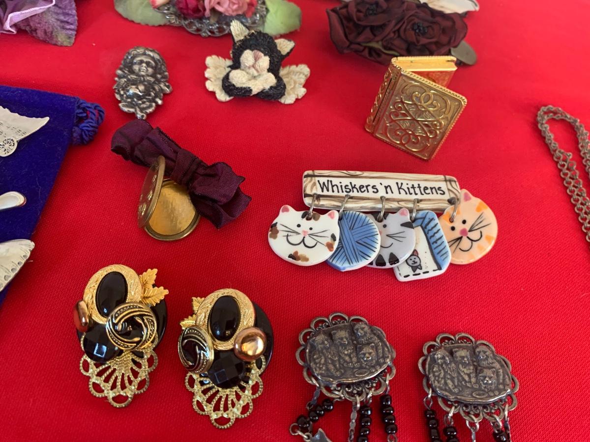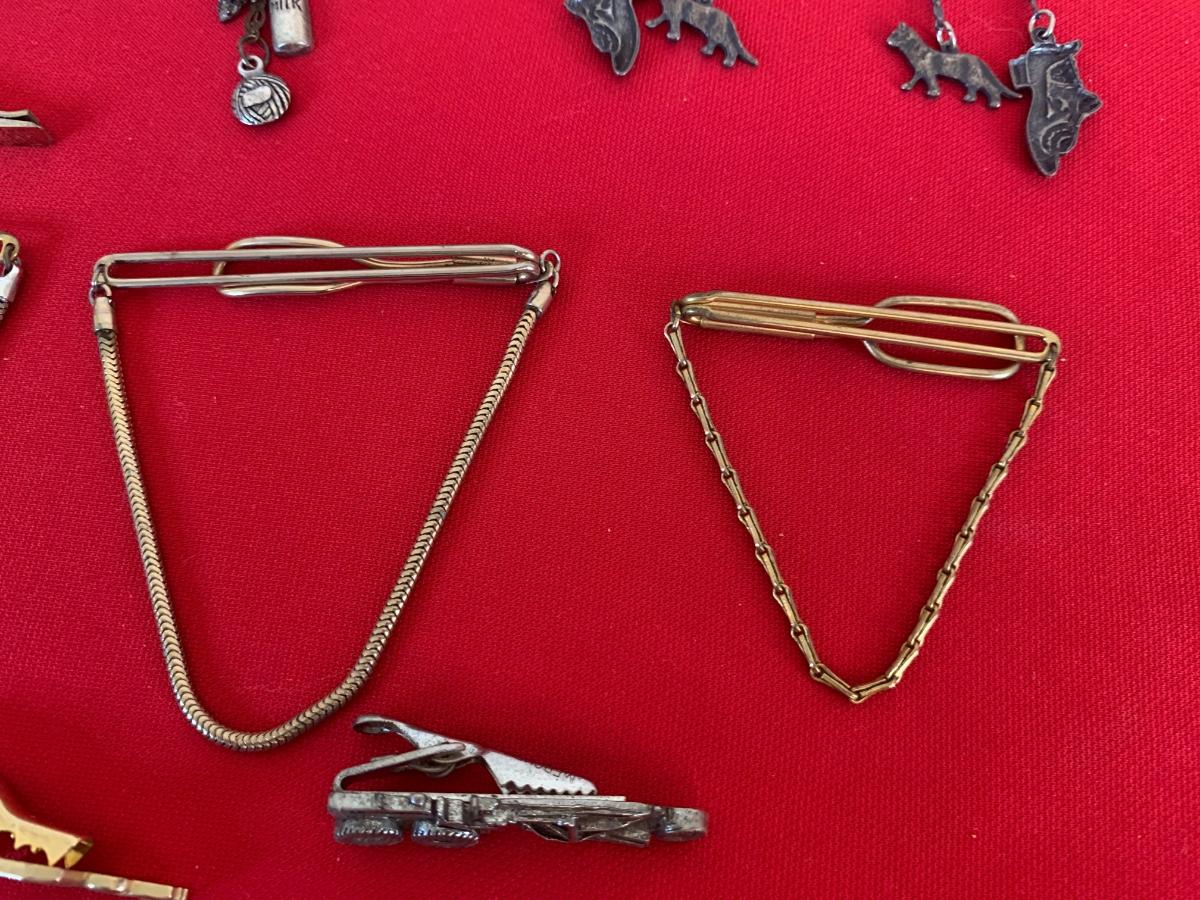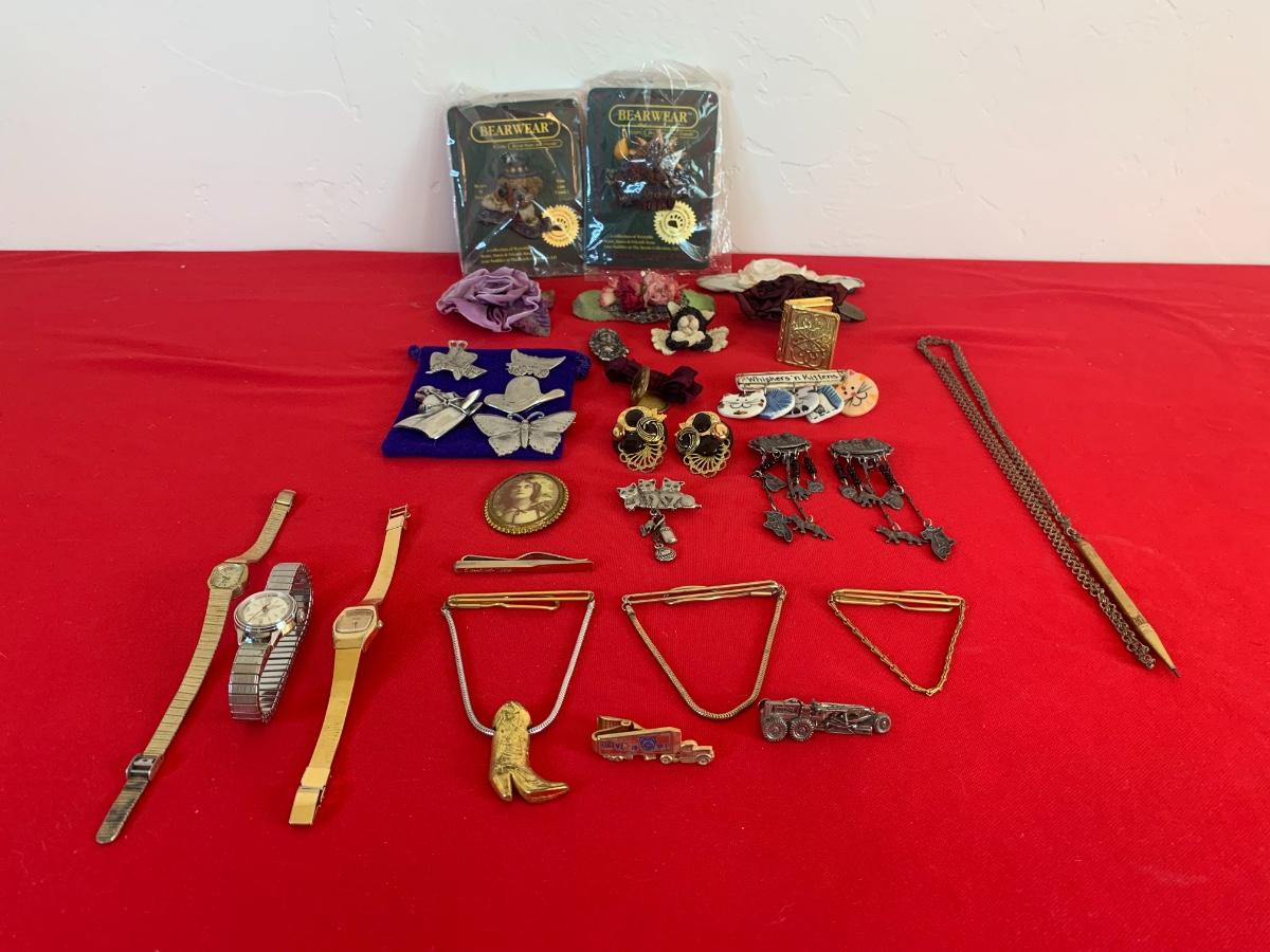 Lot includes a collection of costume jewelry, cats, Avon, vintage tie clips, vintage watches, Avon“🦆