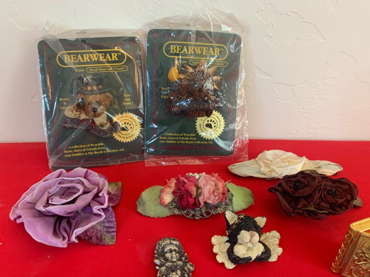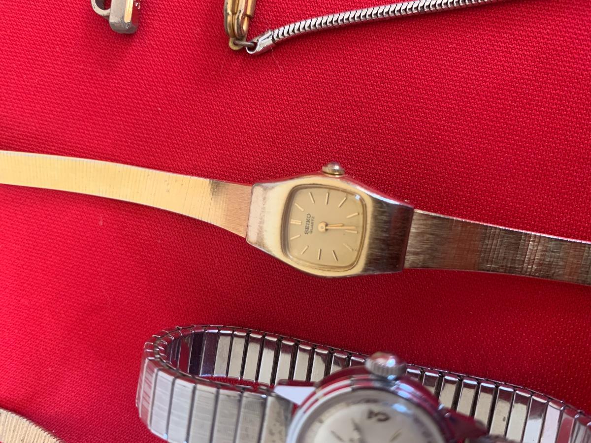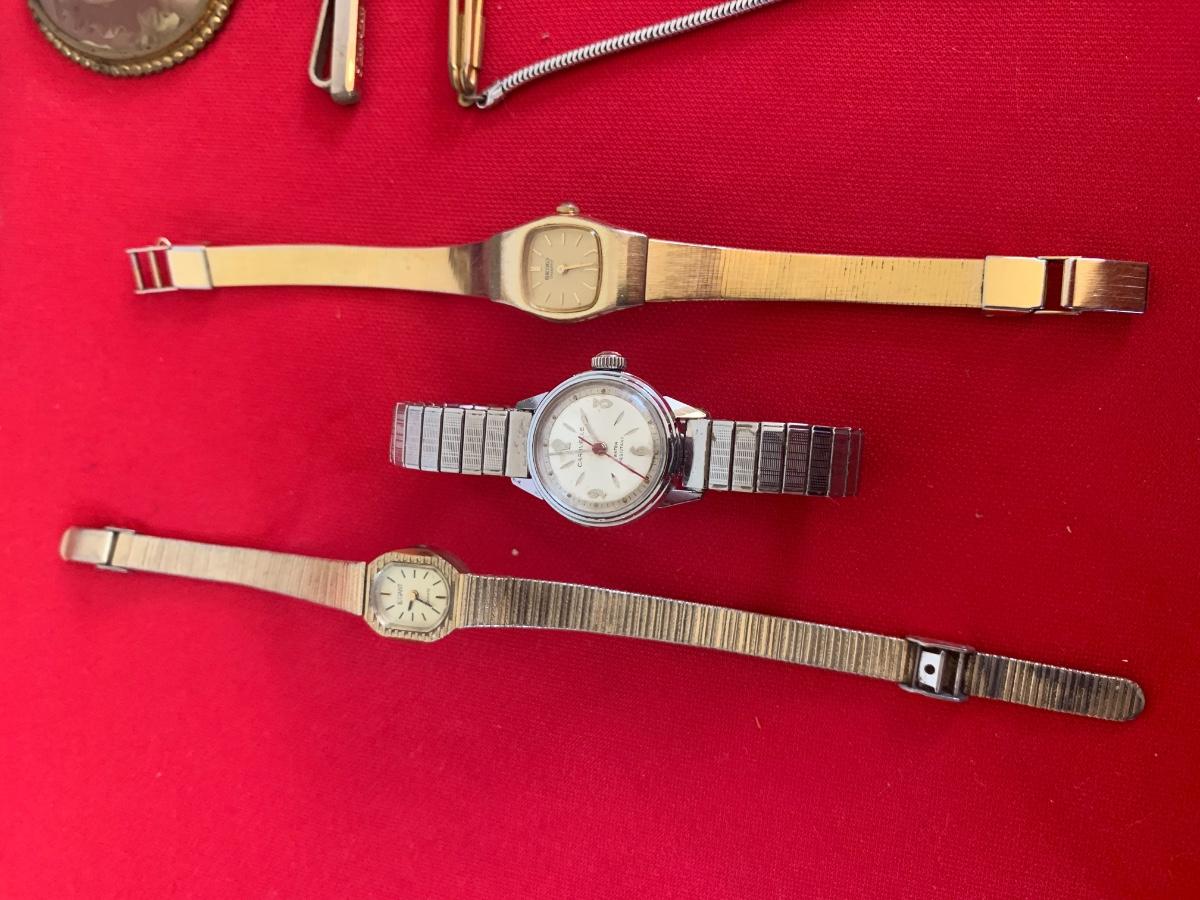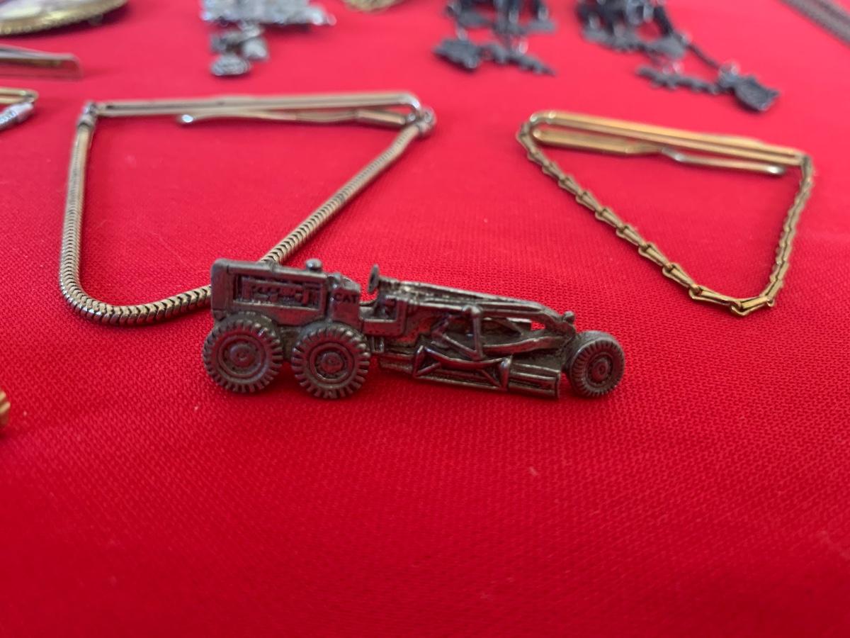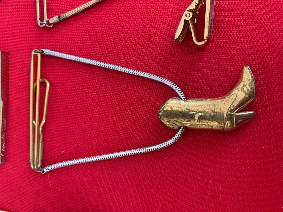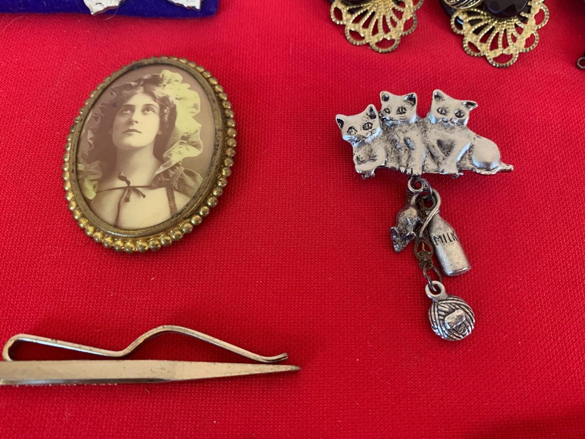 Lot includes a collection of costume jewelry, cats, Avon, vintage tie clips, vintage watches, Avon“🦆