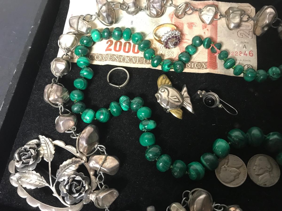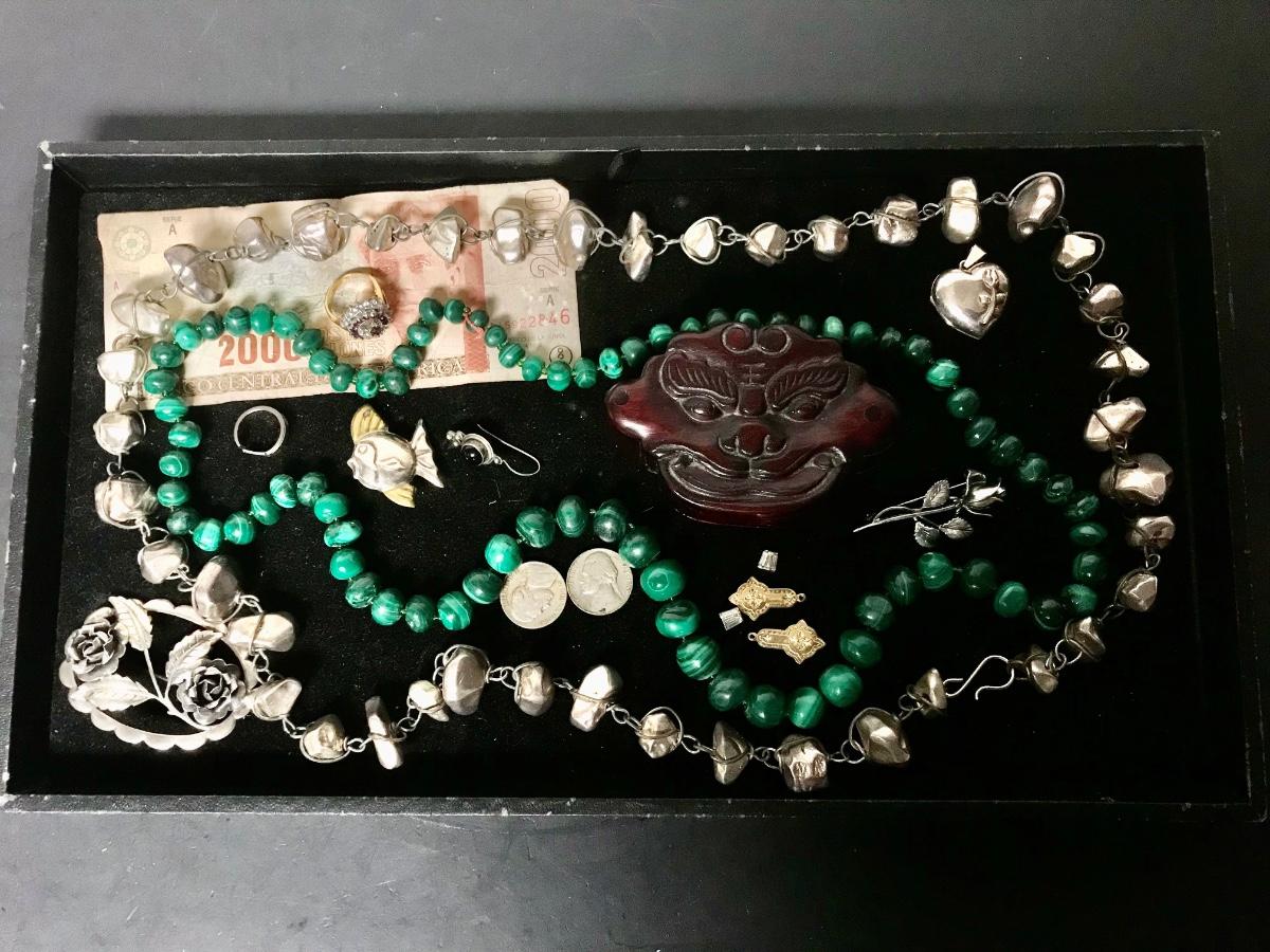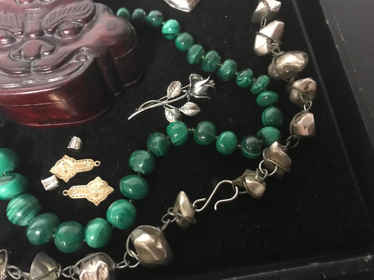 Sterling silver, malachite beaded necklace, Chinese box etc